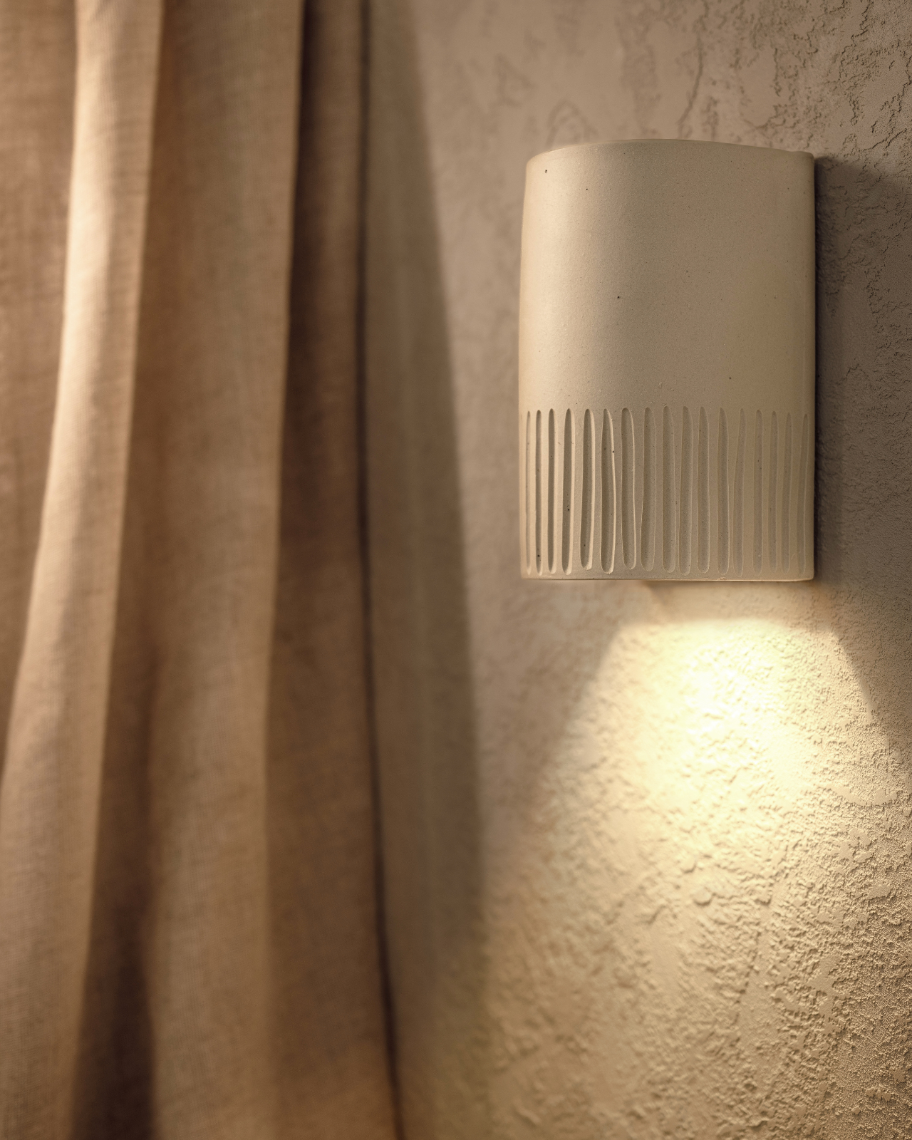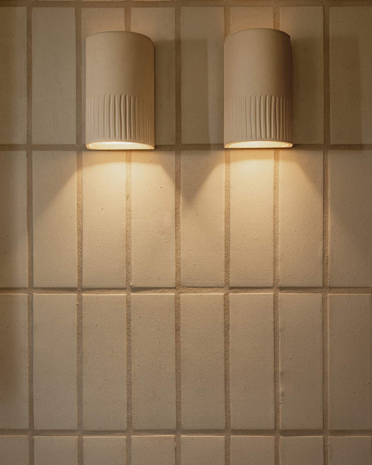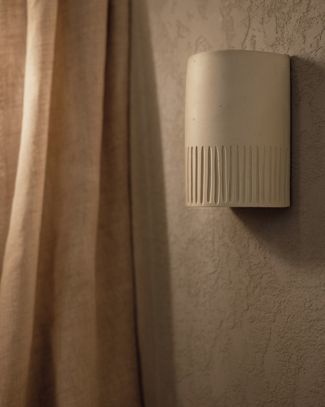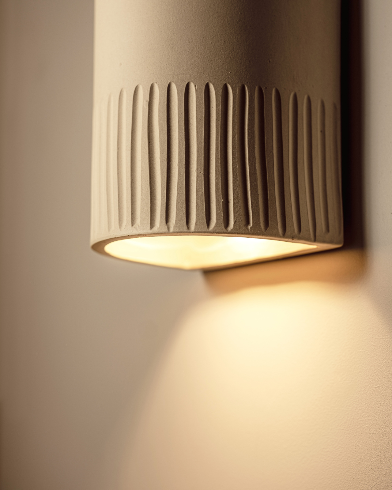 Enhance any interior space with this warm, understated wall sconce. Handmade in Tasmania by firing unglazed smooth clay twice through a slip-cast mould process to ensure consistency. Experience softly illuminated interiors from this dynamic downlight with an intentionally minimal back plate that allows the fitting to stand out, highlighting the handmade indented detail. The raw material hues beautifully complement natural interiors of timber, white or stone walls. Each wall light is made with care and precision, providing an inviting glow that seamlessly blends. With its timeless design, this sconce will add a modern yet organic touch to interiors, elevating home decor.