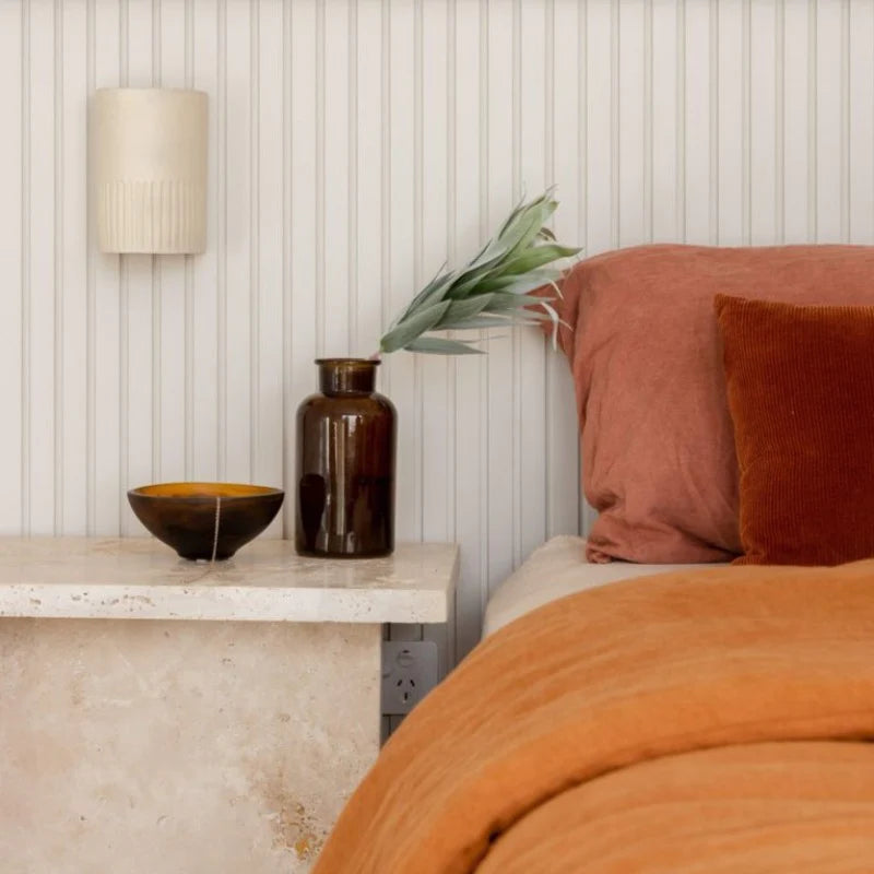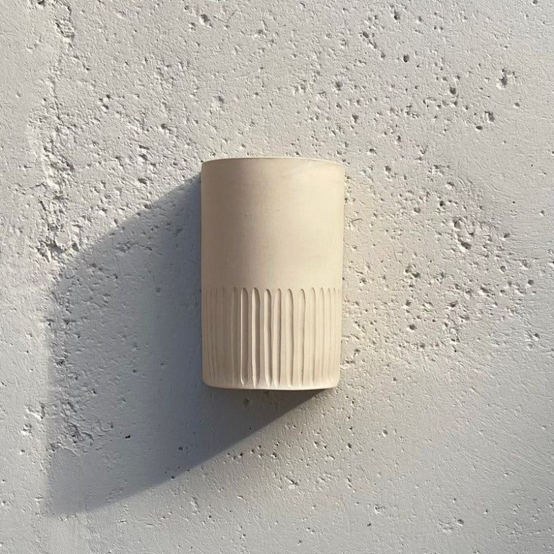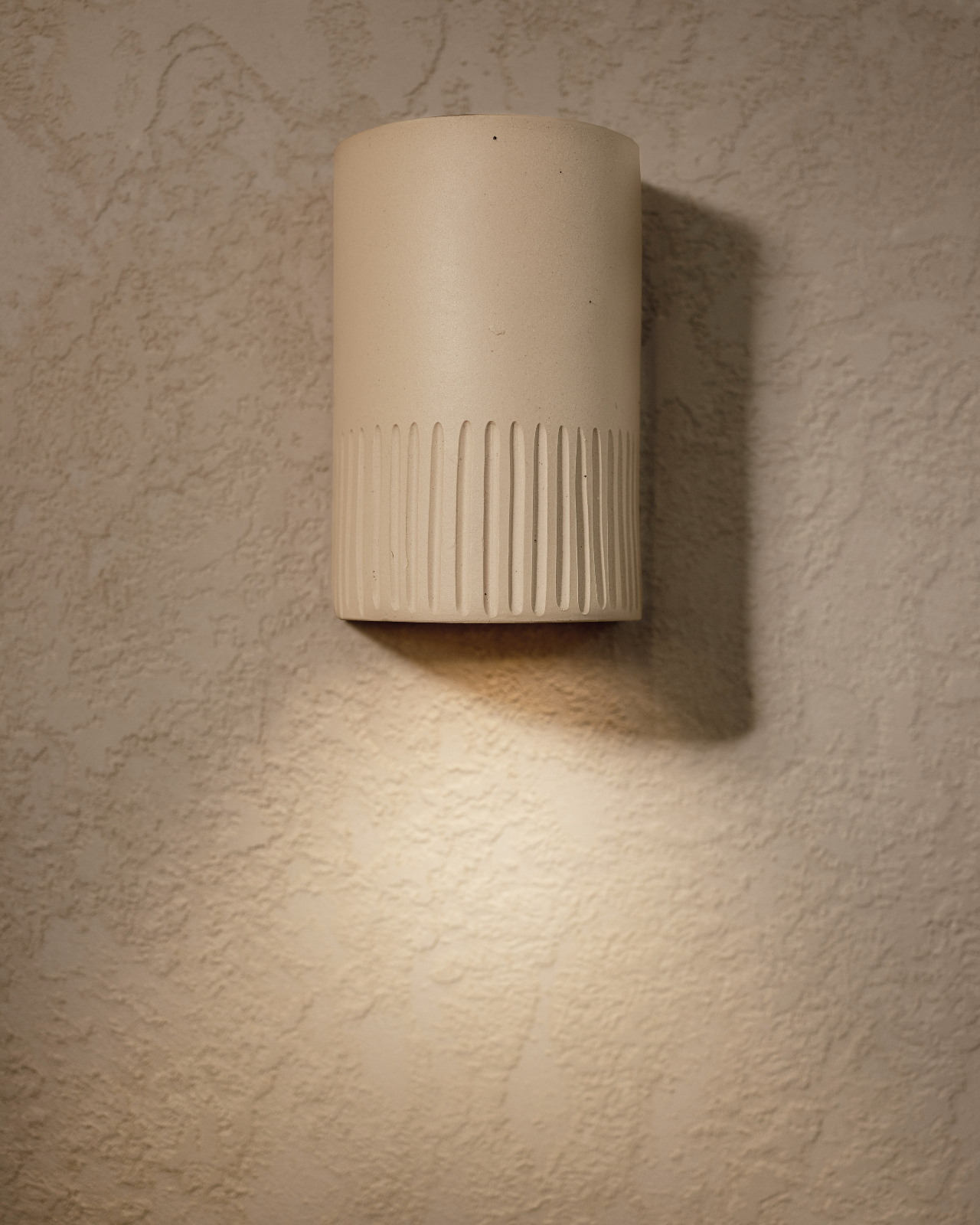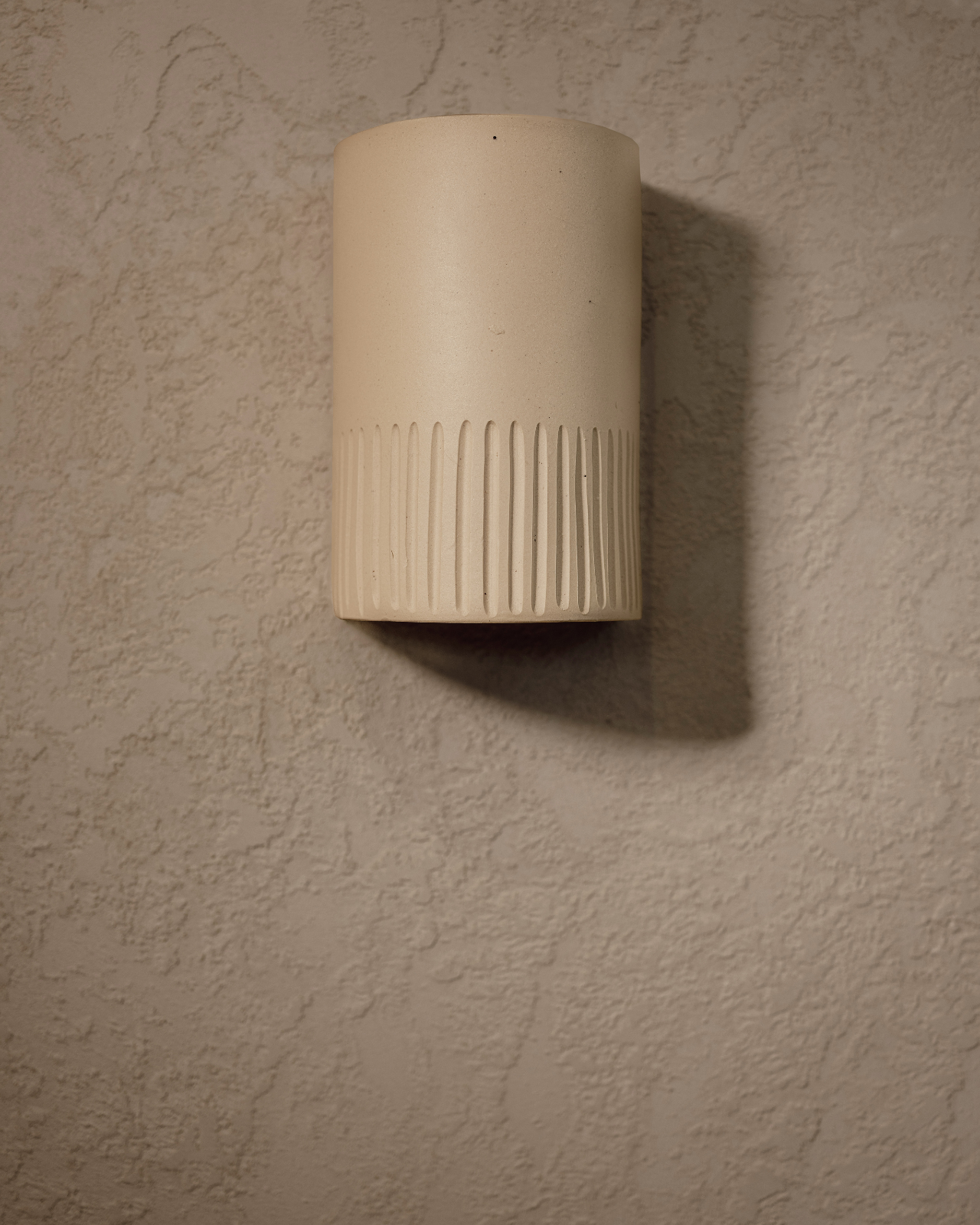 Enhance any interior space with this warm, understated wall sconce. Handmade in Tasmania by firing unglazed smooth clay twice through a slip-cast mould process to ensure consistency. Experience softly illuminated interiors from this dynamic downlight with an intentionally minimal back plate that allows the fitting to stand out, highlighting the handmade indented detail. The raw material hues beautifully complement natural interiors of timber, white or stone walls. Each wall light is made with care and precision, providing an inviting glow that seamlessly blends. With its timeless design, this sconce will add a modern yet organic touch to interiors, elevating home decor.