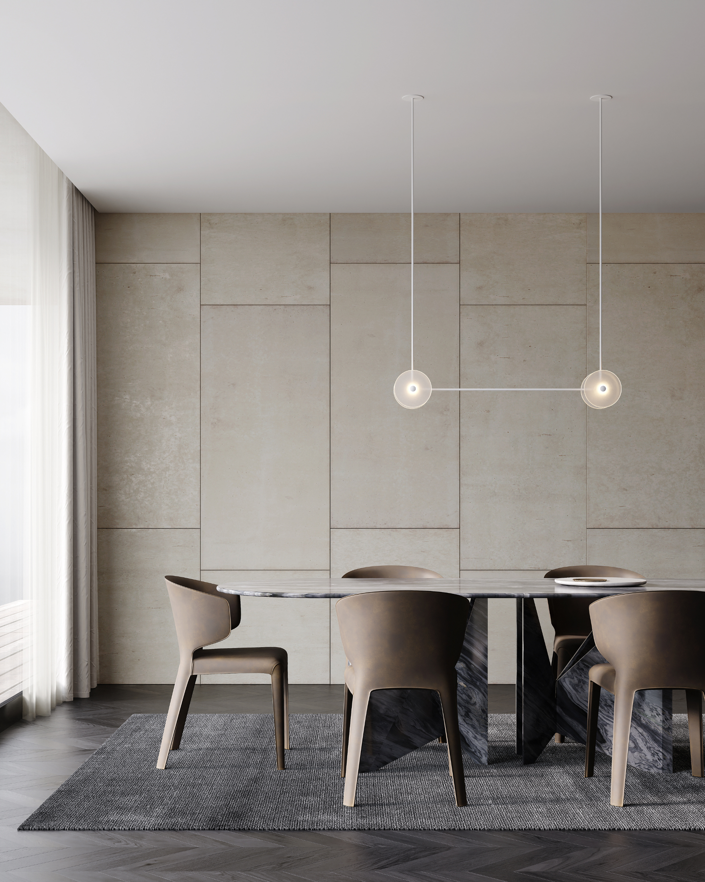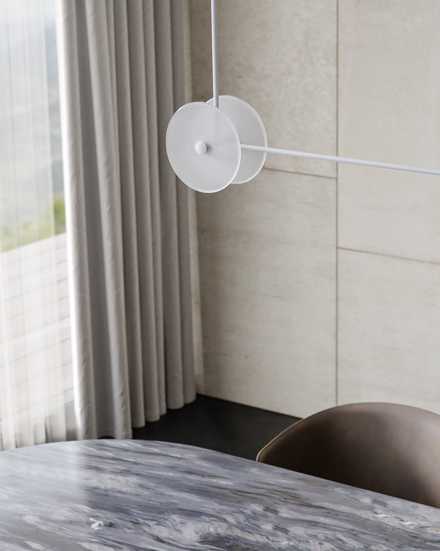 Modern pendant light hanging above a marble table with a neutral wall and curtain in the background