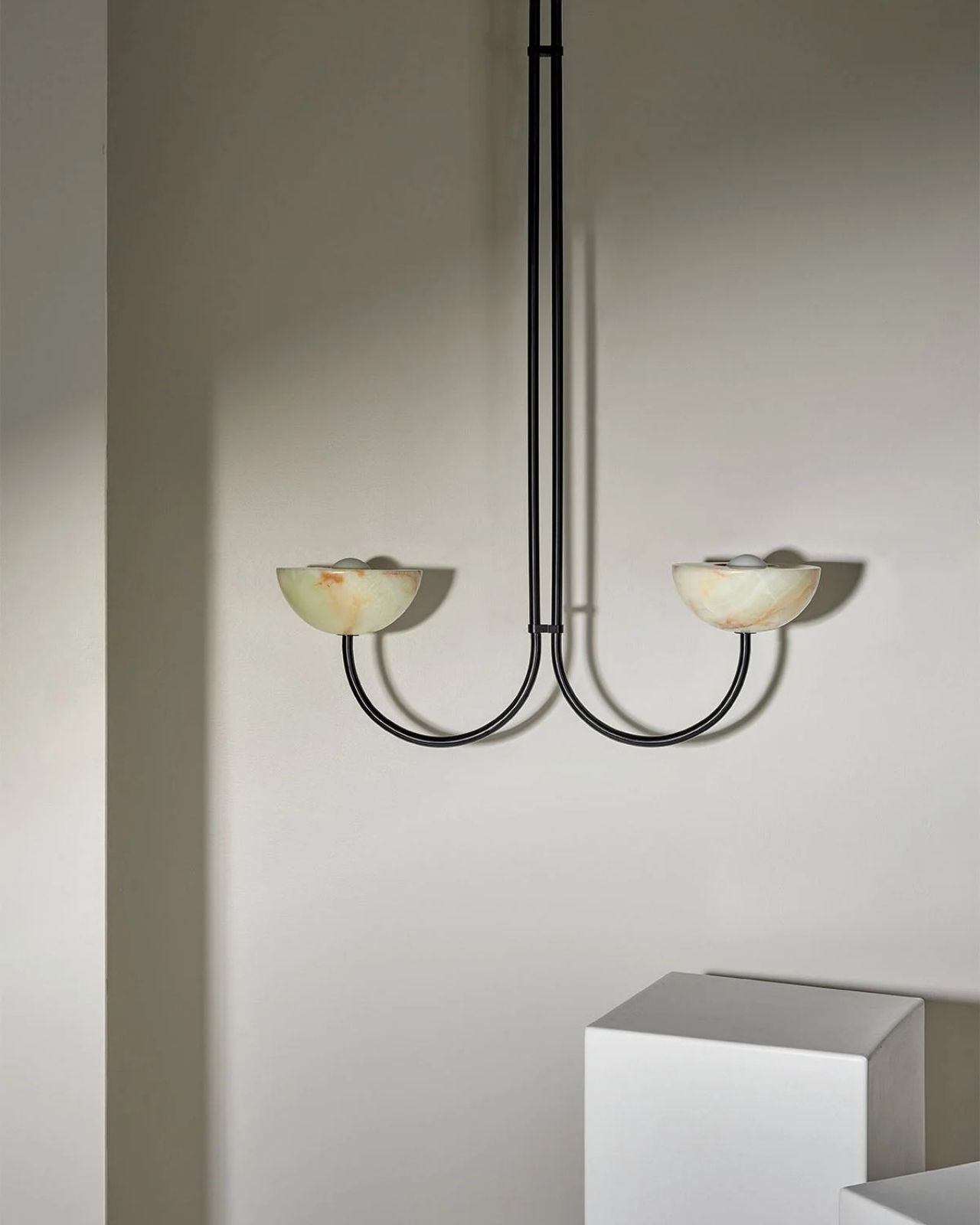 This symmetrical double dome pendant is a contemporary version of a classic chandelier with shades turned upside down for stunning soft illumination. This fixture is made from jade or white onyx and is paired with solid metal rods available in three finishes, brass, brushed black or white finish. Ideal in living rooms, dining rooms or restaurants, this pendant will bring a celestial and refined touch to the surroundings.