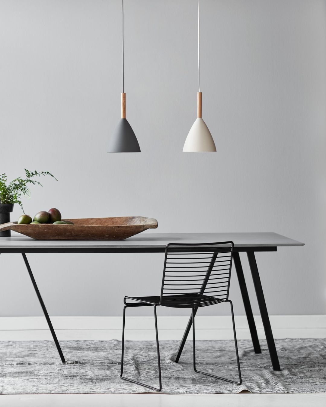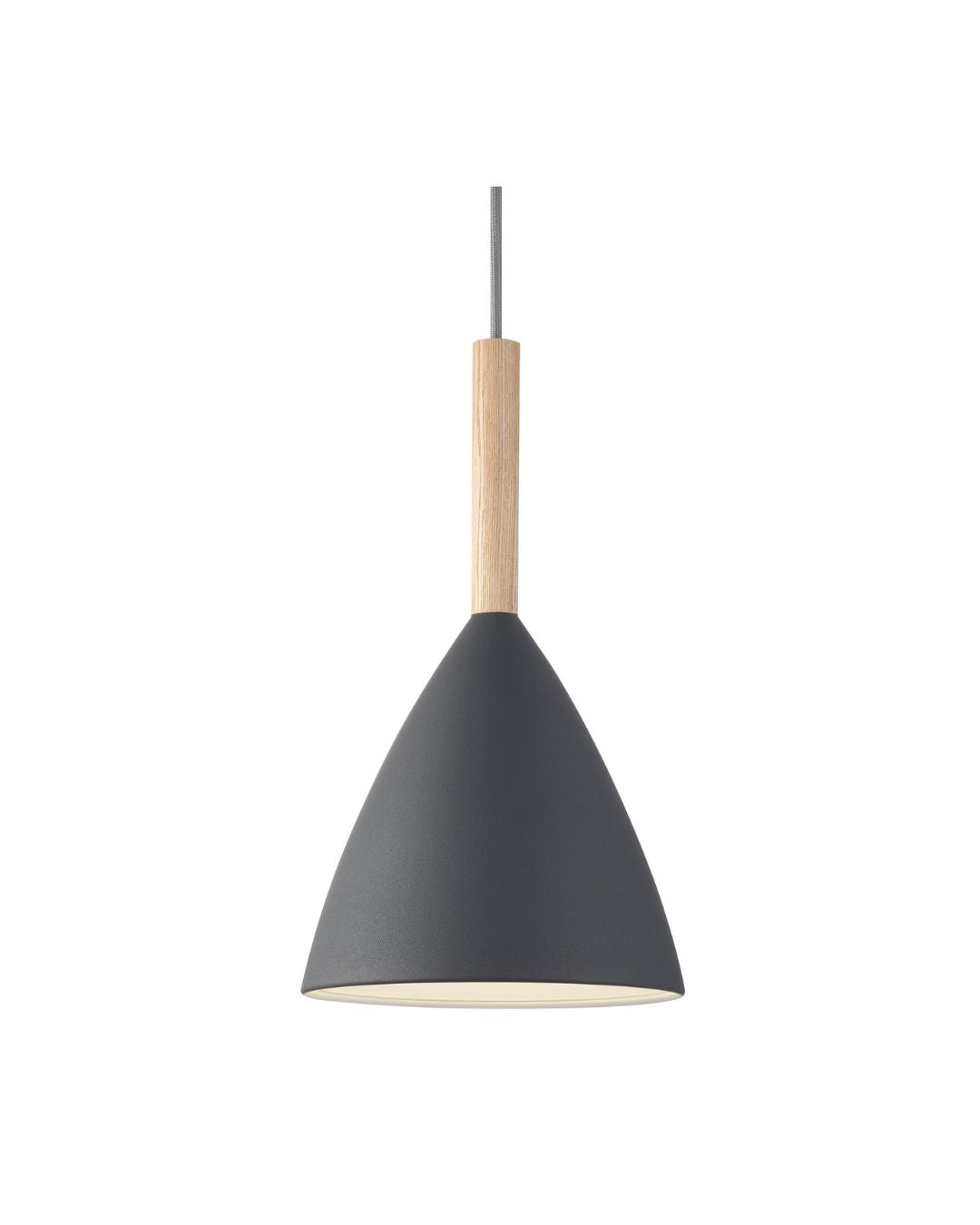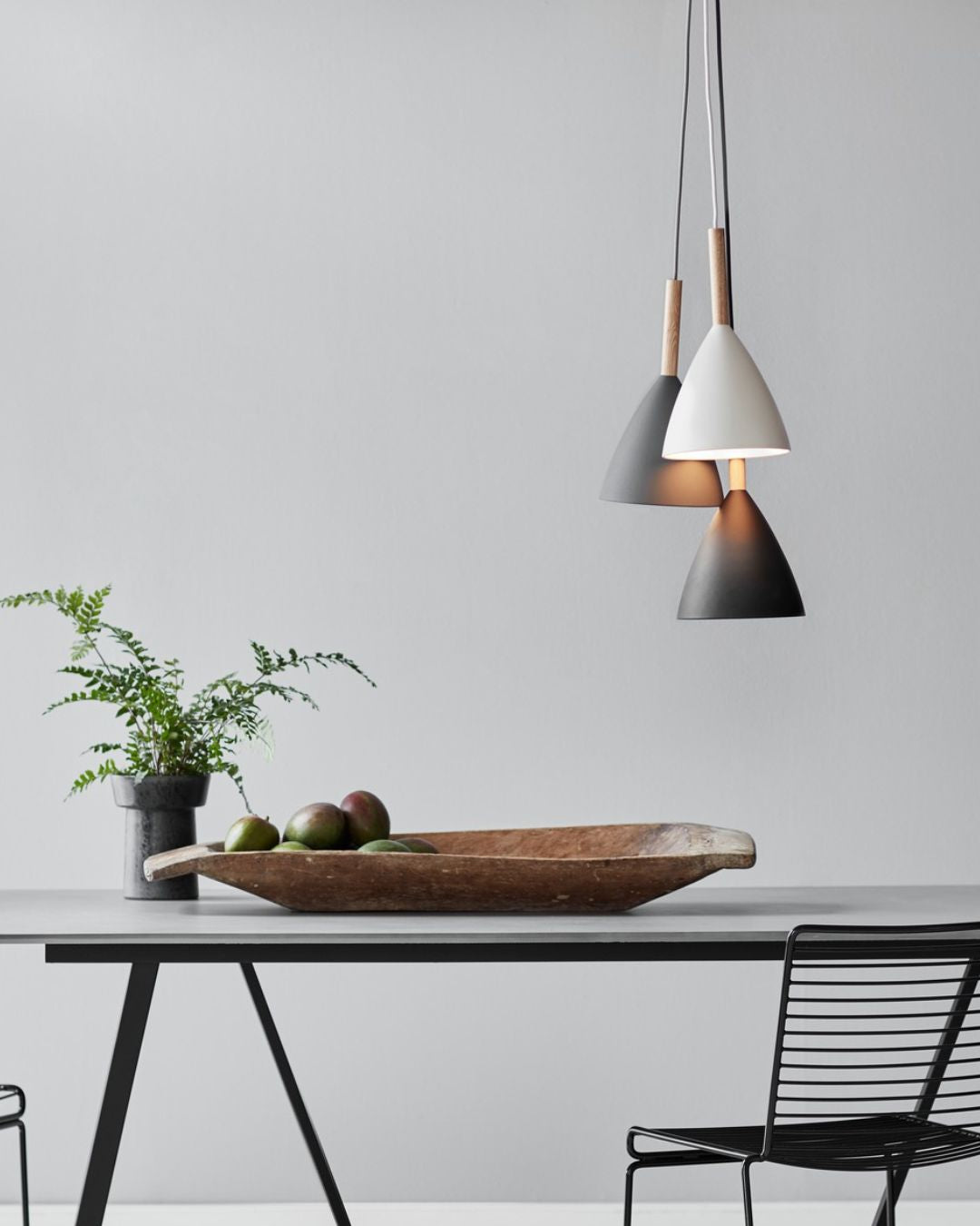 This contemporary pendant light, designed in Denmark, is a simply beautiful luminaire for home or commercial interiors. The simple steel shade is finished in either matte black, grey or white and topped with a small piece of oiled chestnut. This small design feature adds a sense of warmth to the shade through the integration of natural materials.