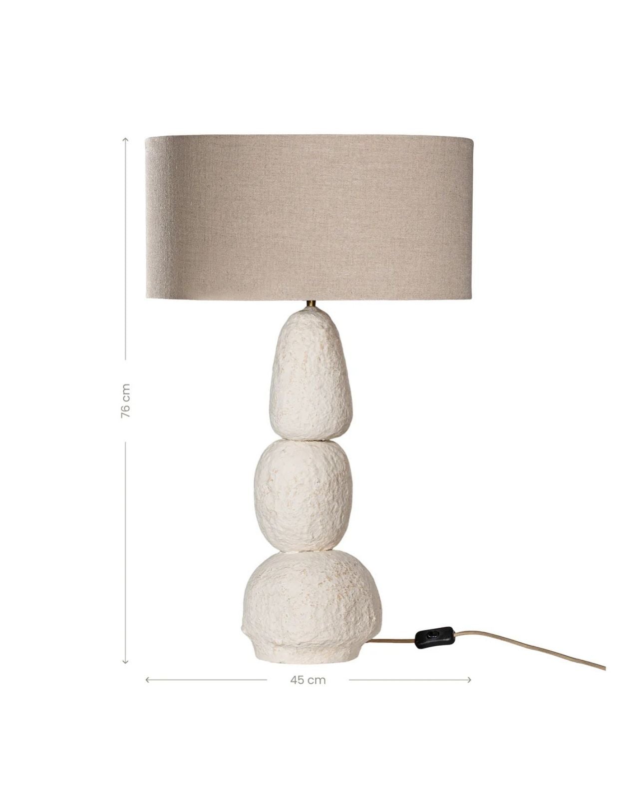 The Large Organic Table Lamp showcases an alluring shapely silhouette made from paper mâché. Inspired by the formation of stacked prayer stones, this table lamp combines nature with craftsmanship. With the meticulously handmade nature of this lamp, each piece is unique, making each lamp an exclusive focal point. With the semi-translucent nature of paper mâché, this lamp will illuminate from within when turned on.