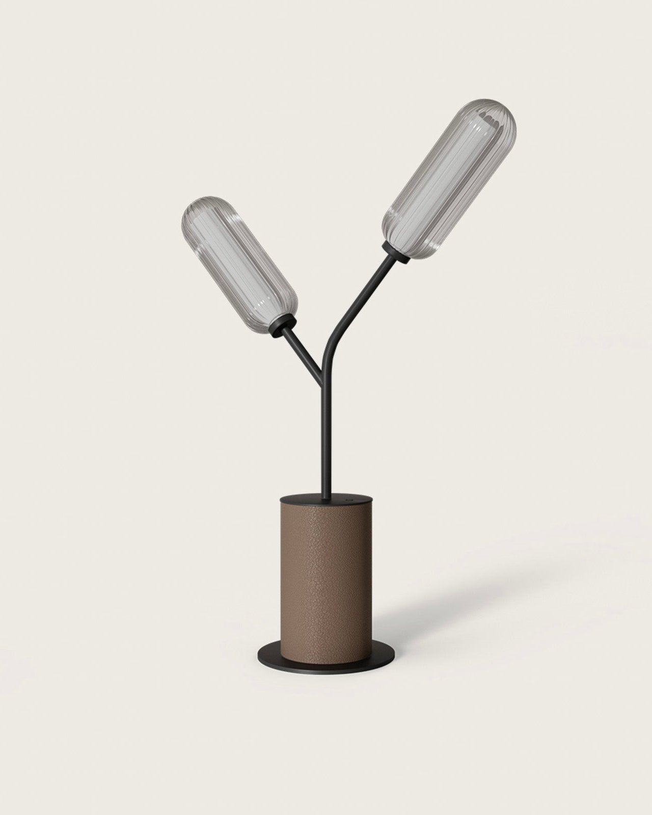 The Leather & Striped Glass Table Lamp is a compact and modern table lamp with a sculptural, plant-like design. It has a cylindrical base of leather-wrapped steel, adding an earthy feel to its contemporary form. From the base, two thin black stems rise and branch outward at an angle, each ending in a vertically-ribbed, elongated glass bulb. The asymmetrical angles give it a dynamic, organic silhouette, while the materials and clean lines keep it sleek and modern. An ideal statement piece for a desk, bedside table, or reading nook, blending artful design with functional lighting.