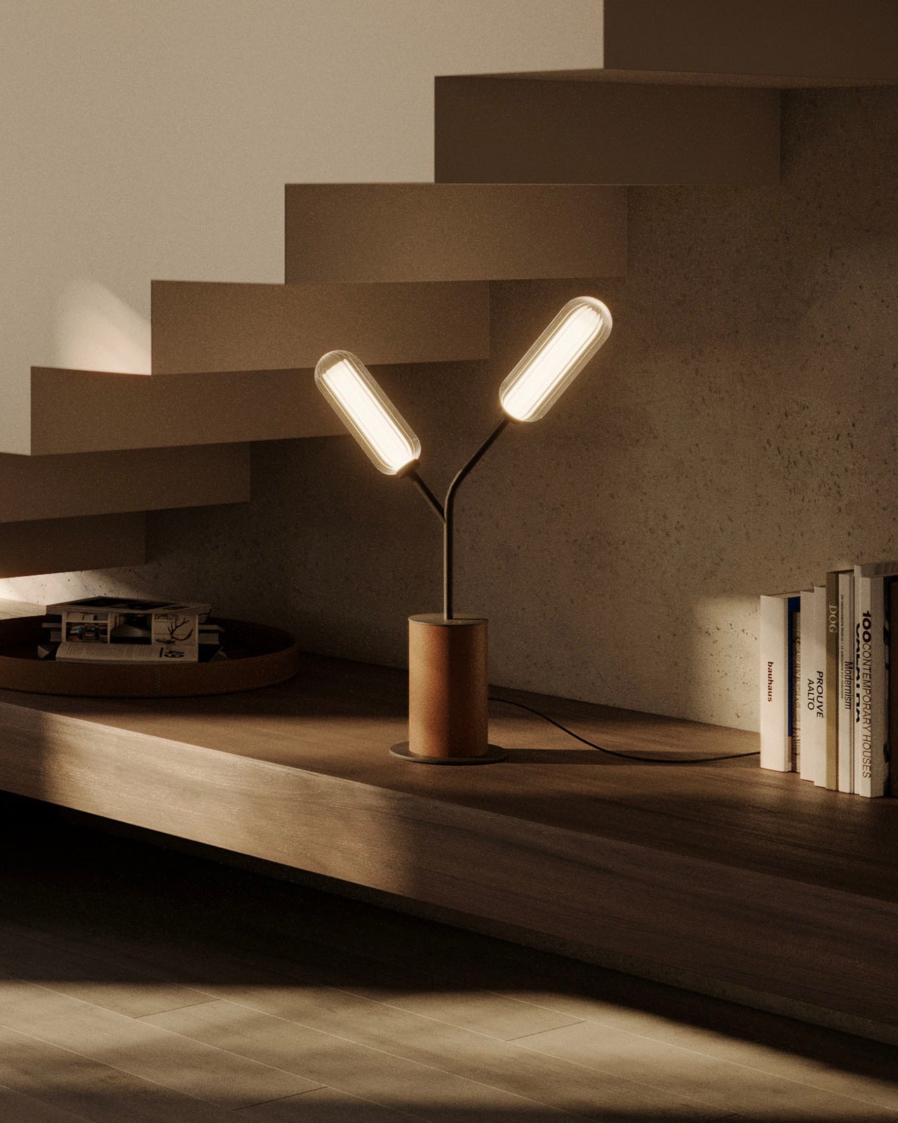 Modern table lamp with three light bulbs on a wooden shelf next to books.