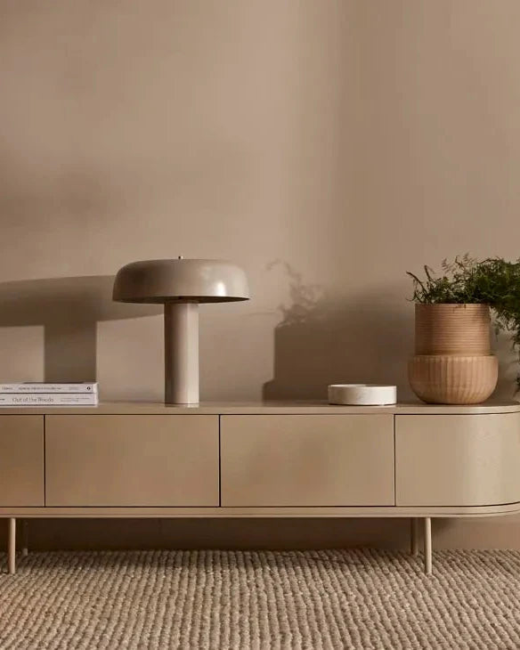 This modern table lamp features a sleek base paired with an overhanging canopy shade, creating a clean and balanced silhouette. Available in Black, White, Burgundy, and Taupe, the design offers a streamlined appearance that suits a range of contemporary and mid-century interiors. Well suited to offices and living areas, it provides practical illumination while maintaining a considered, modern presence.