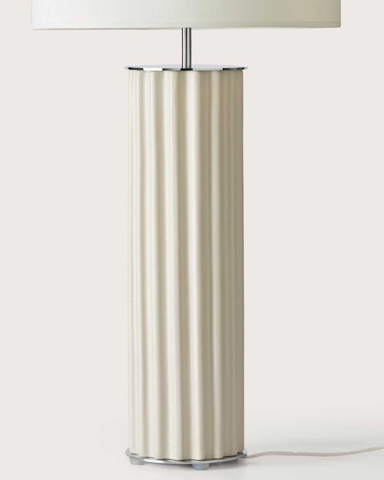 Table lamp with a cylindrical cream base and white shade on a light background