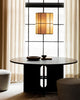 Modern pendant light fixture hanging above a dining table with stools against a gray wall.