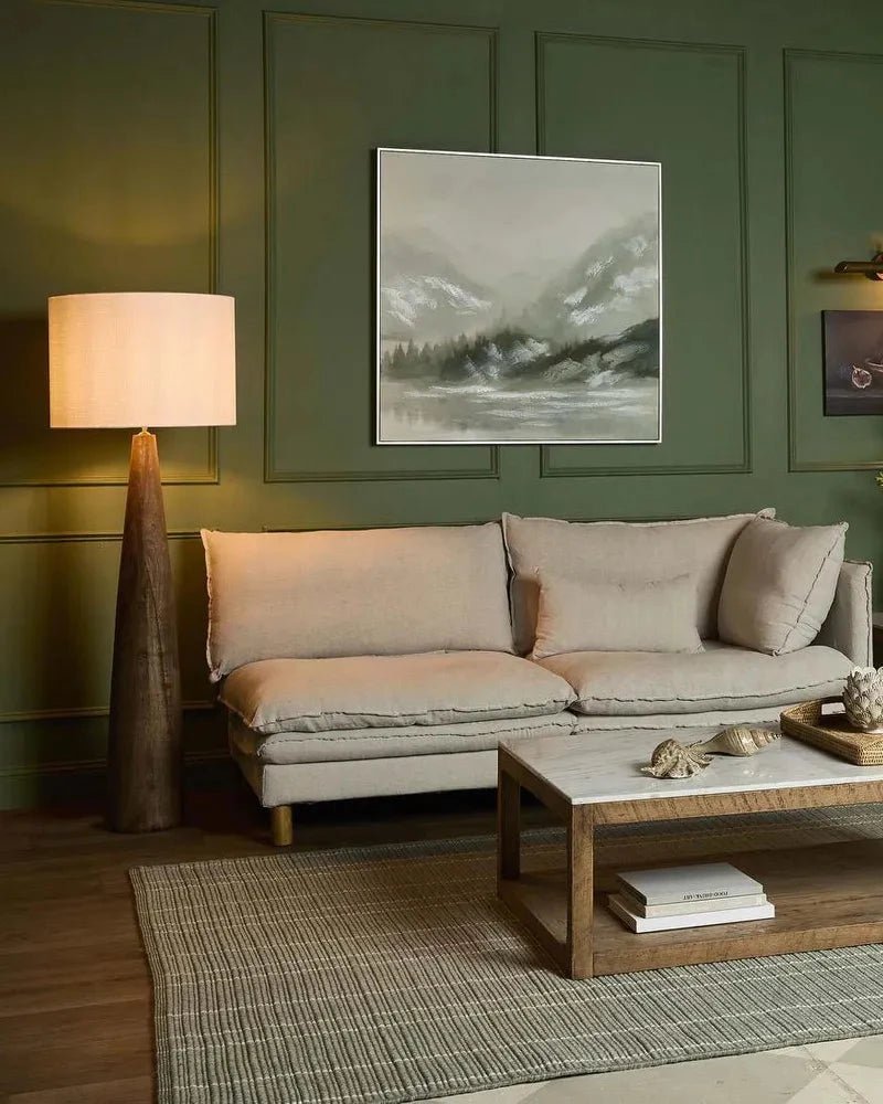Crafted from durable mango wood, this elegant floor lamp features a tall conical base and a rich saddle stain finish. The rich deep wood boasts a beautiful grain, ensuring longevity and style in any room. The lamp also includes a large linen shade, available in a white, black, or natural finish, adding to the floor lamp's sophisticated style. Perfect for living rooms and master bedrooms.