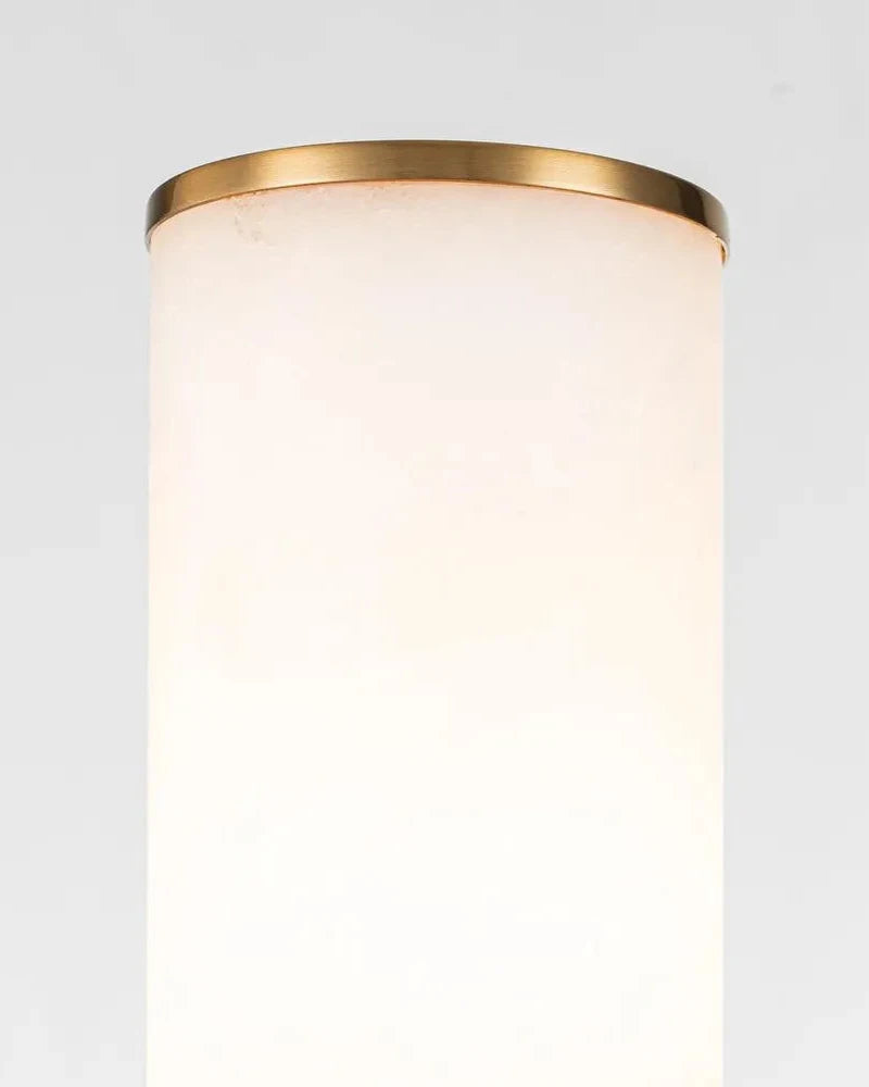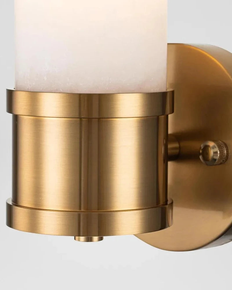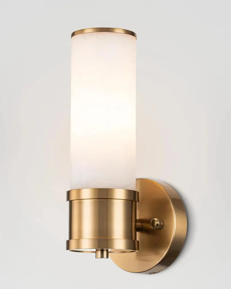 This wall light seamlessly combines delicate sophistication with intricate artistry. Its iron holder boasts a brass finish, while the cylindrical shade made of alabaster brings out a soft, diffused light with its inherent translucency. It's a timeless and elegant choice for adding allure to modern farmhouse or traditional bedrooms, hallways, or lounges.