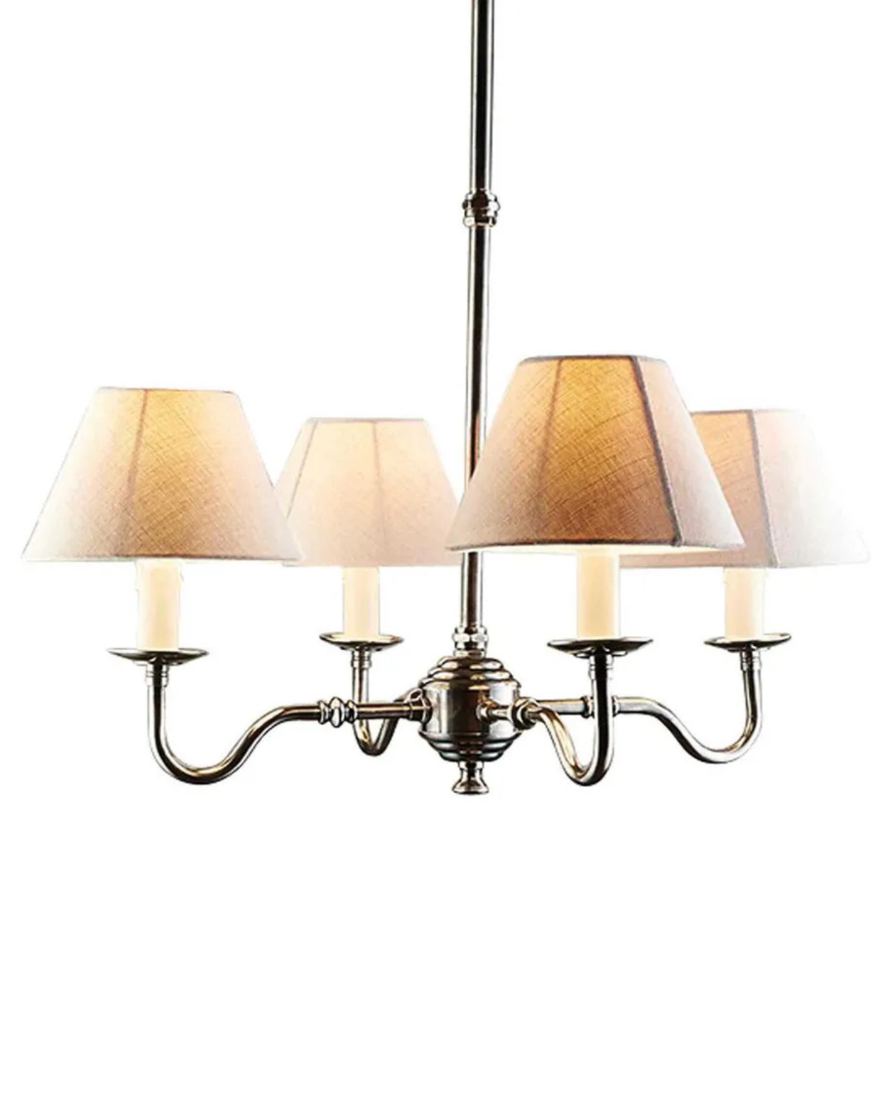 Inspired from Baroque era with a simplified design, this four-arm chandelier is made from solid brass and is available in two antique finishes, silver or bronze. The fixture is suspended on three metal rods however the height can be adjusted by removing rods as necessary. Ideal in a living room, entrance hall or dining room, this traditional pendant will spread a pleasant warm light around and will add a sense of classic style to modern interiors or some elegance and sophistication to other settings.