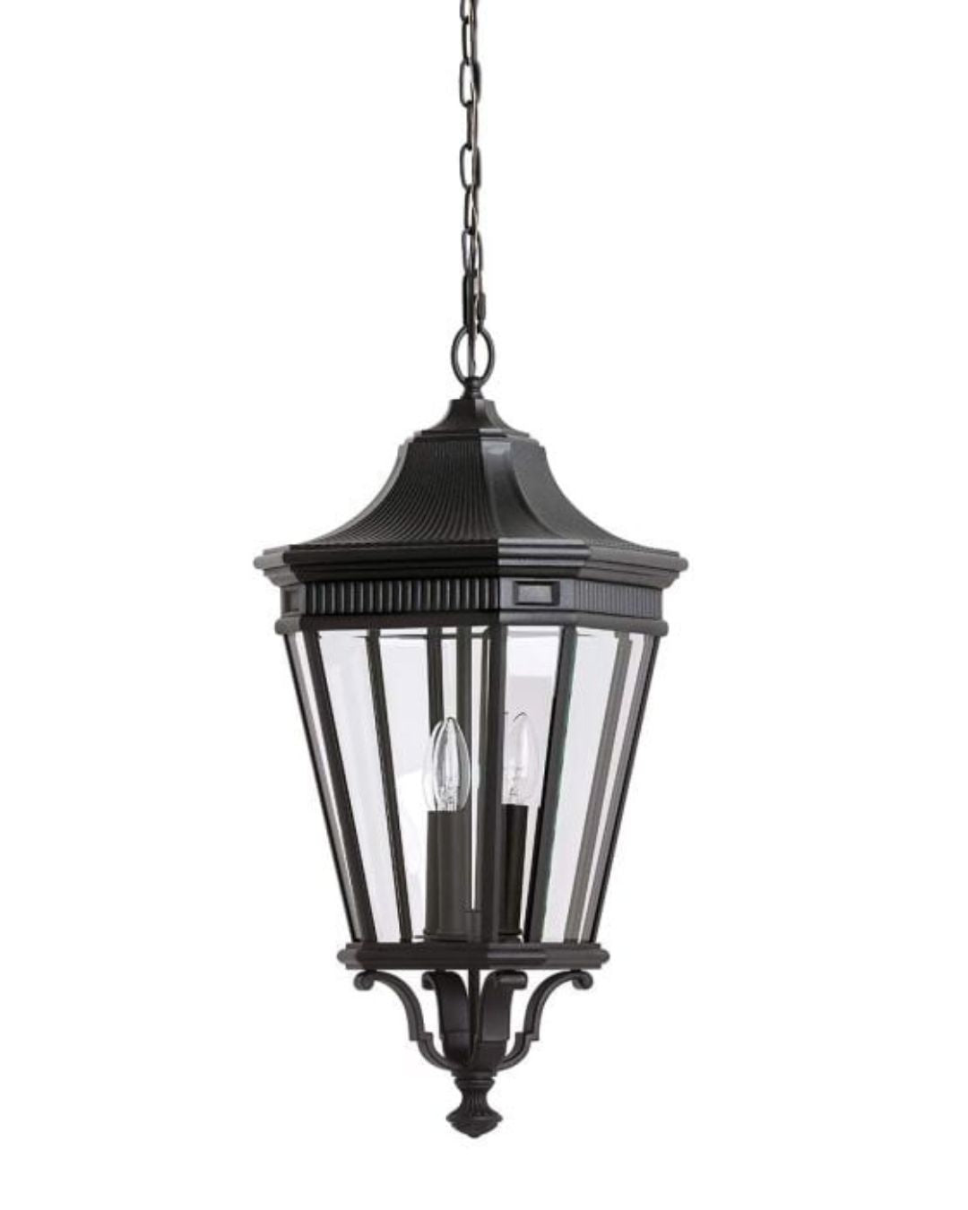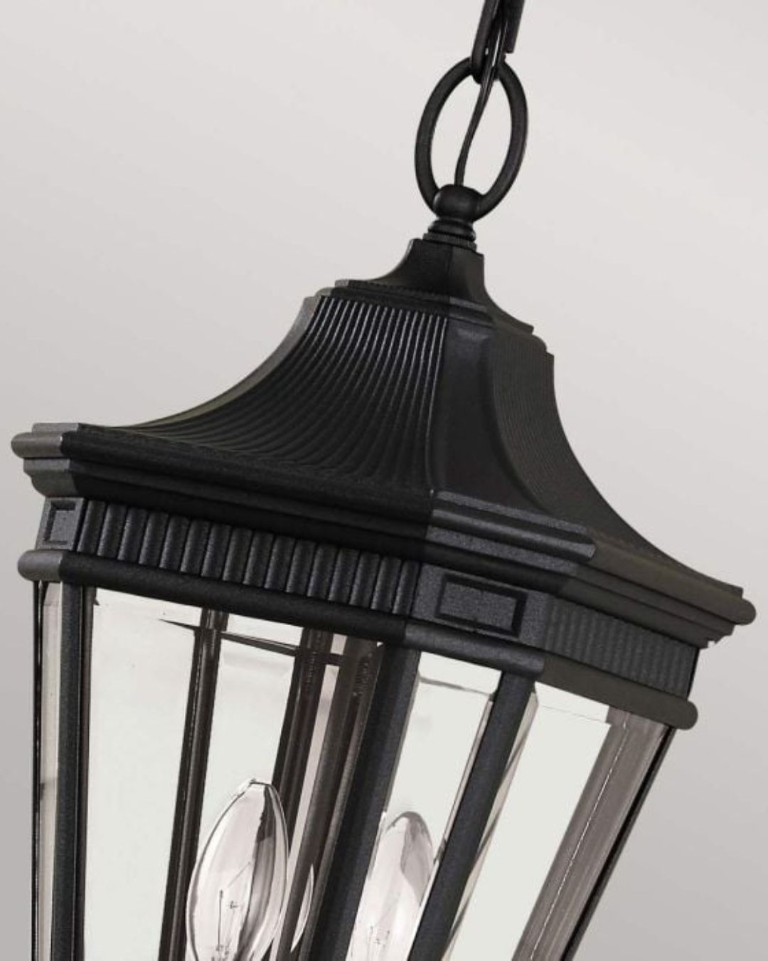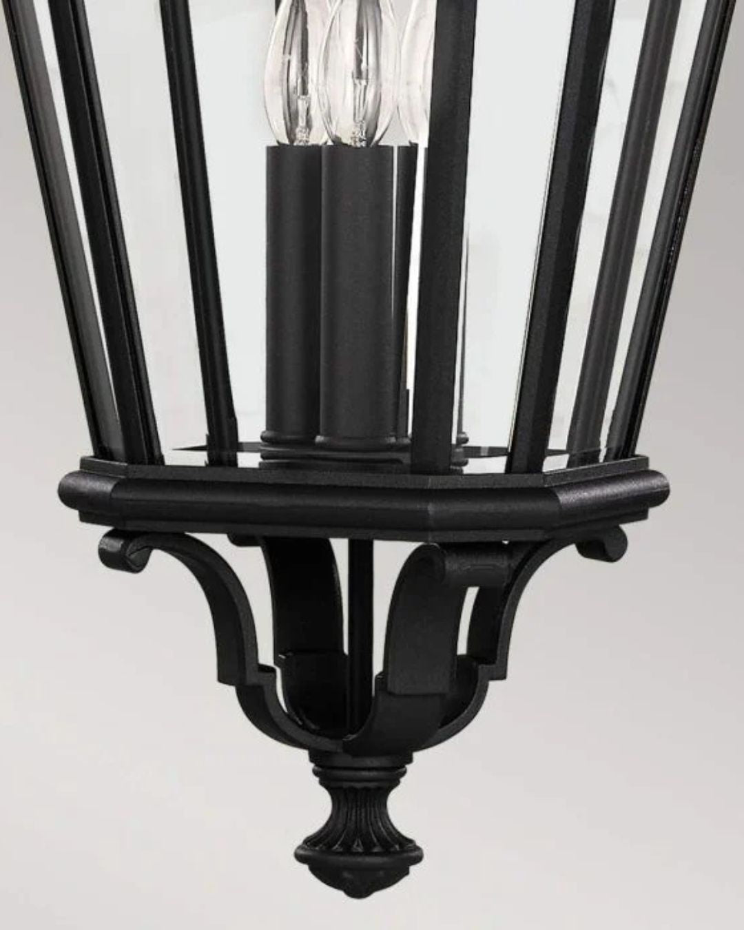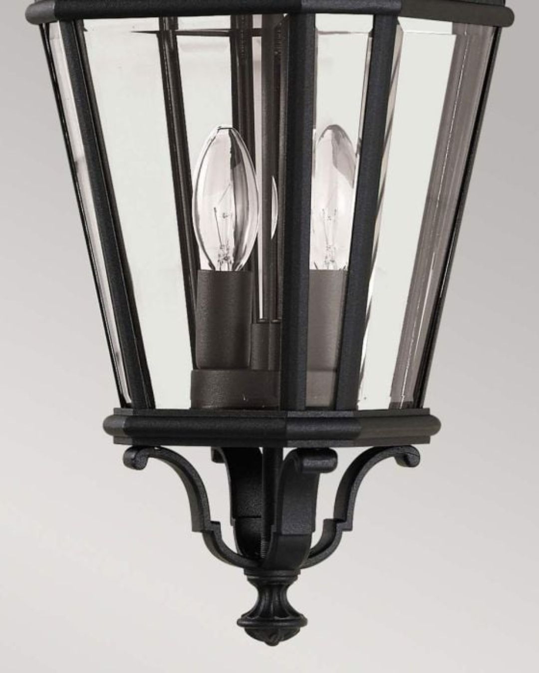 This classic design is constructed from black finished metal and clear bevelled glass and is featured with an IP23 rating. This fitting can be installed in interior and covered outdoor areas to add a hacienda aesthetic. Inspired by antique gas lanterns this pendant is recommended to be paired with E14 Candle LED's to finish the look of this classic design. Available in Medium or Large.