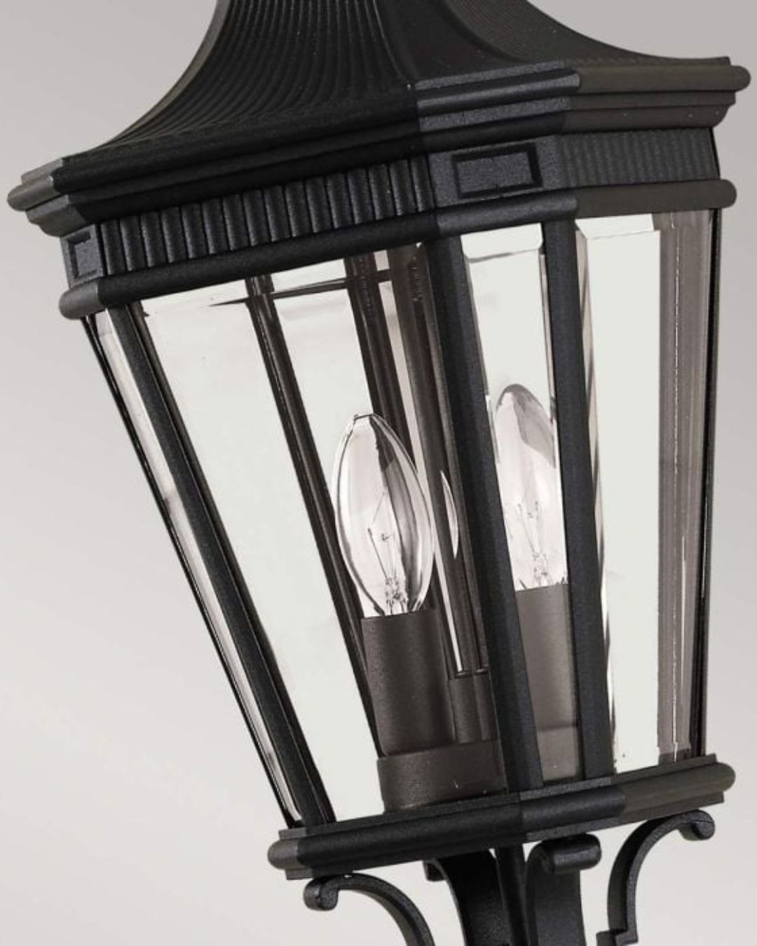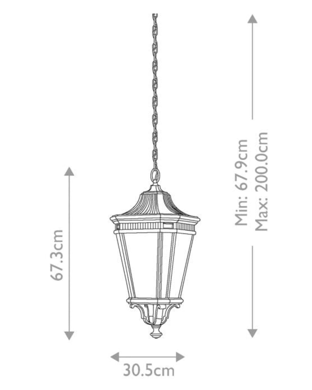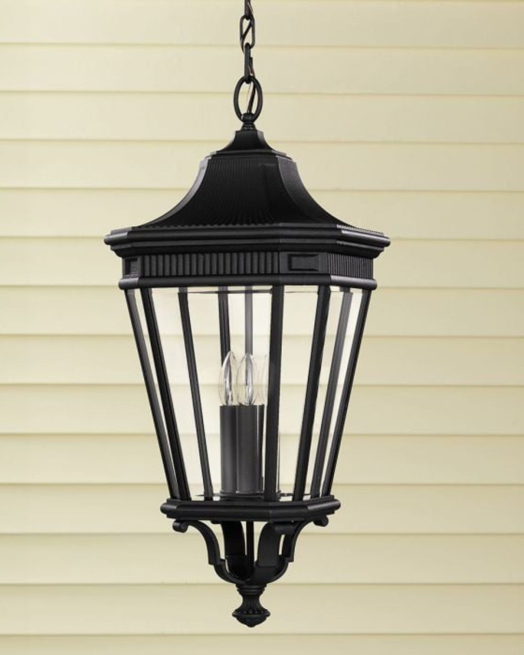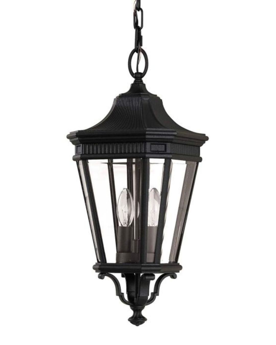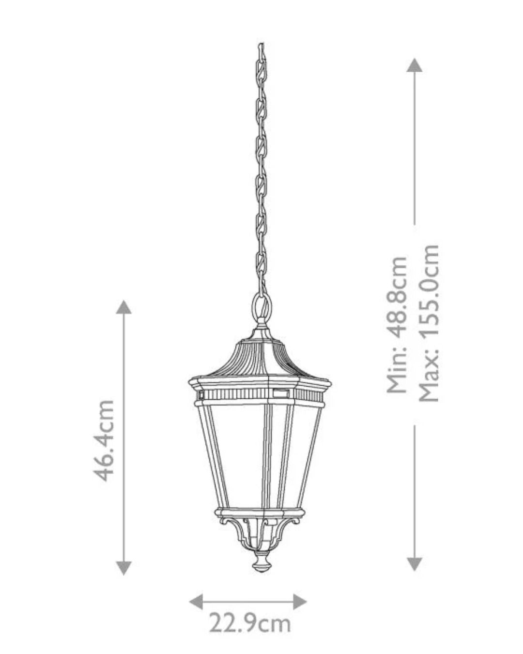 This classic design is constructed from black finished metal and clear bevelled glass and is featured with an IP23 rating. This fitting can be installed in interior and covered outdoor areas to add a hacienda aesthetic. Inspired by antique gas lanterns this pendant is recommended to be paired with E14 Candle LED's to finish the look of this classic design. Available in Medium or Large.