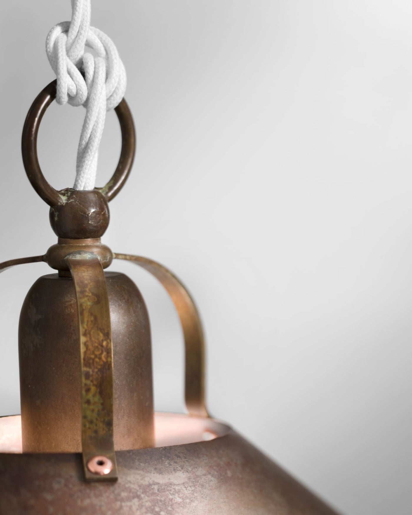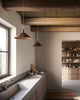 Two medium size pre aged brass pendant in a farmhouse style kitchen