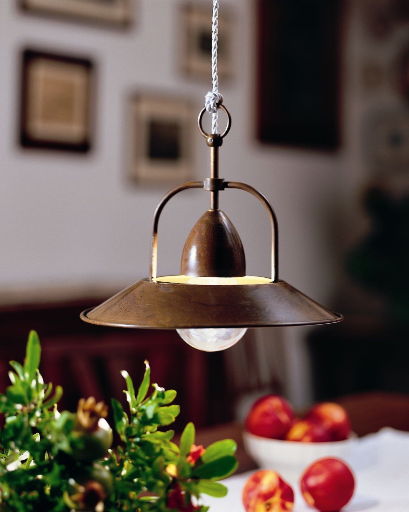 Farmhouse metal with pre aged finish pendant light hanging over a dining table in a traditional house