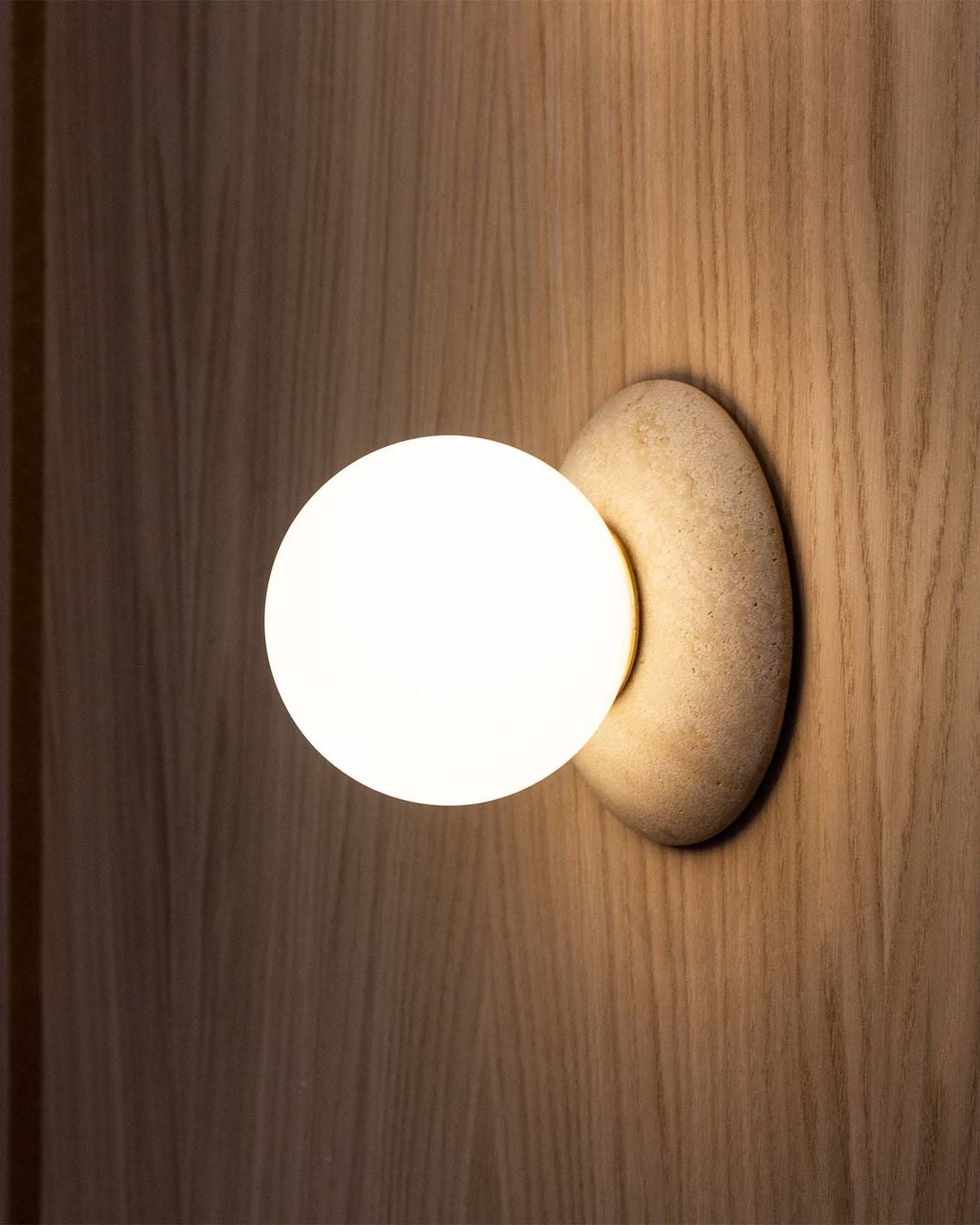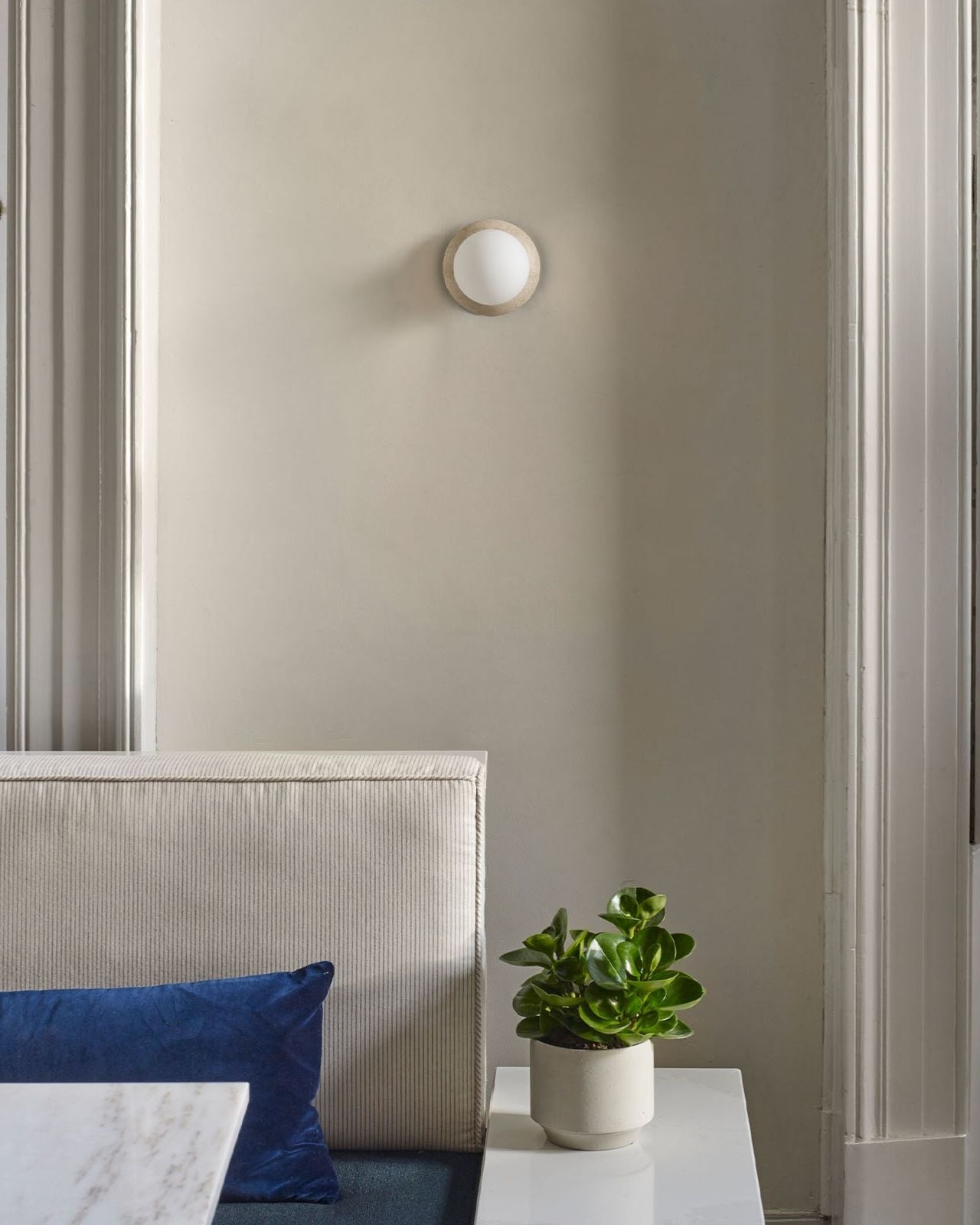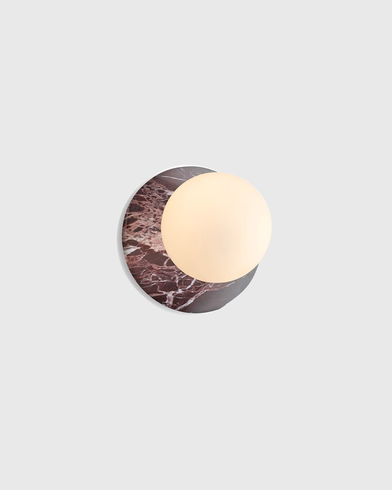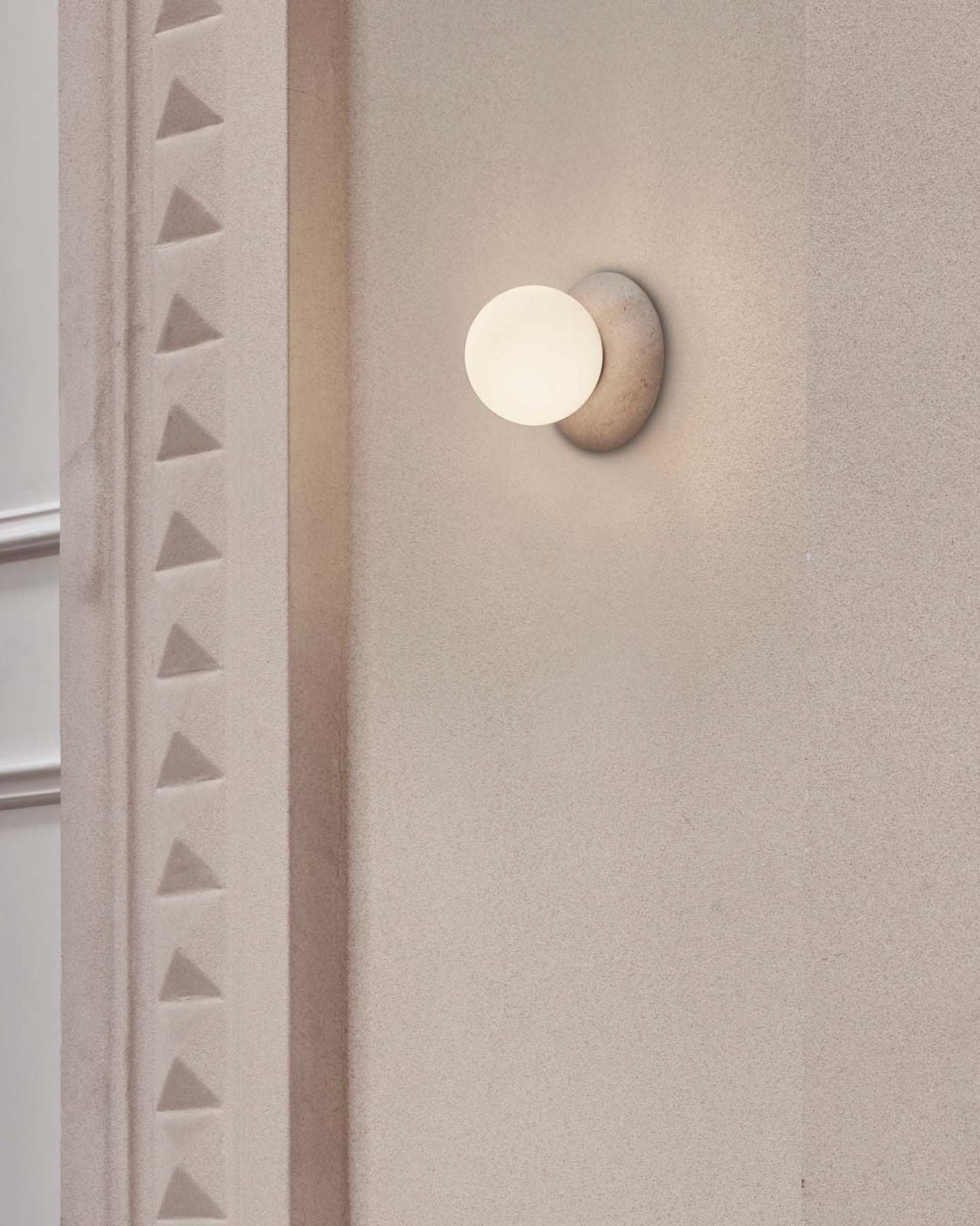 Graceful and sculptural, this mini wall light will enhance interiors as a singular fixture or as a cluster in modern or contemporary interiors. The elegant and pure opal glass sphere beautifully contrasts with the backplate made from natural stone, travertine, black, red or green marble. Handmade in UK and IP44 rated, this light will enhance bathrooms positioned on both sides of a mirror or bedrooms as bedside lamps.