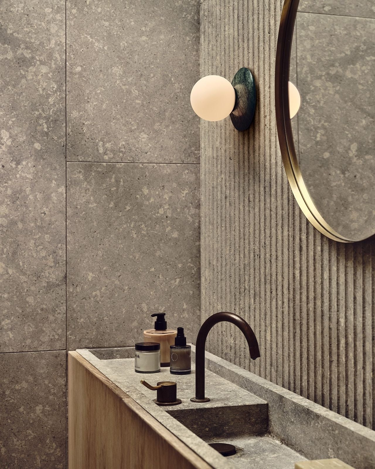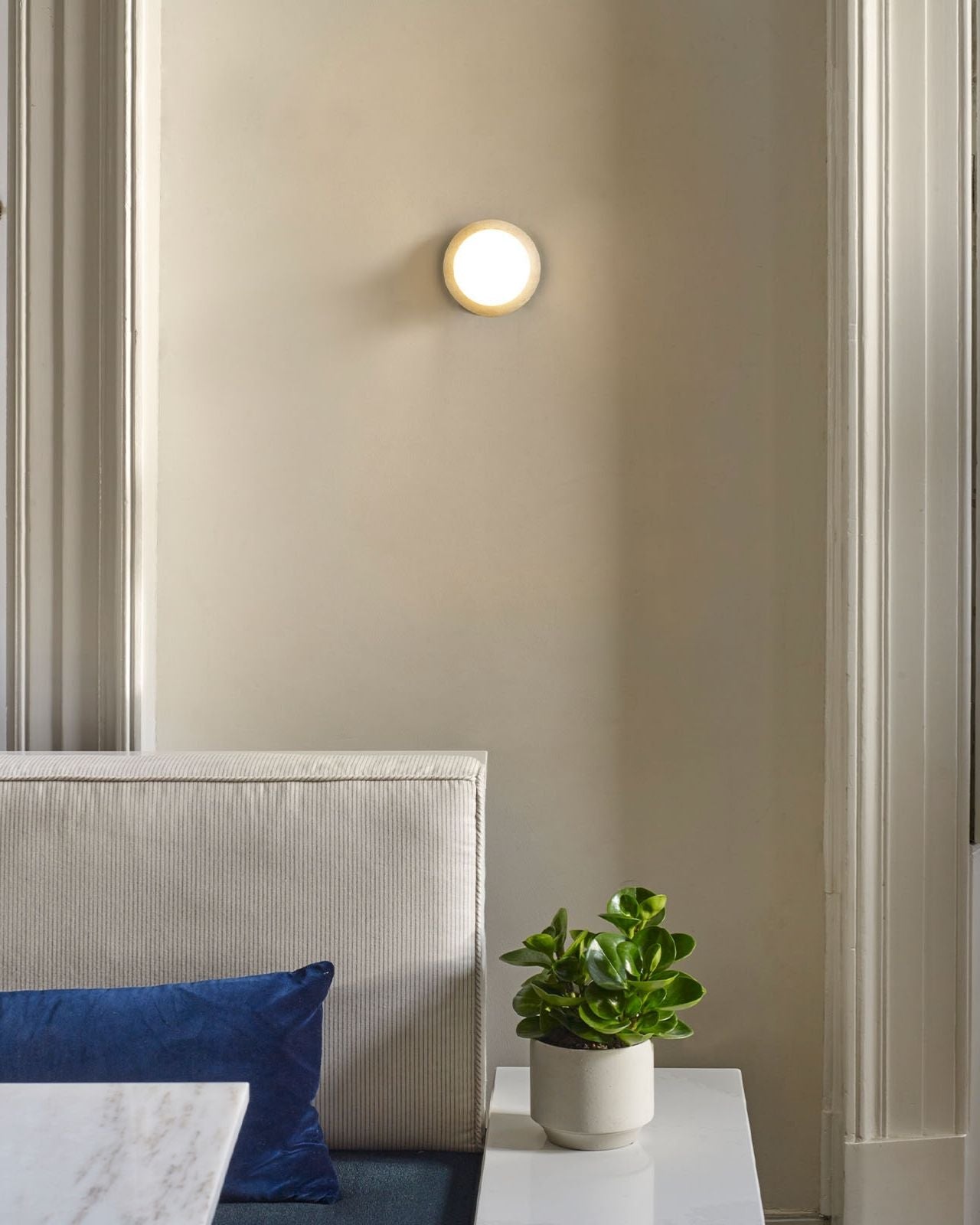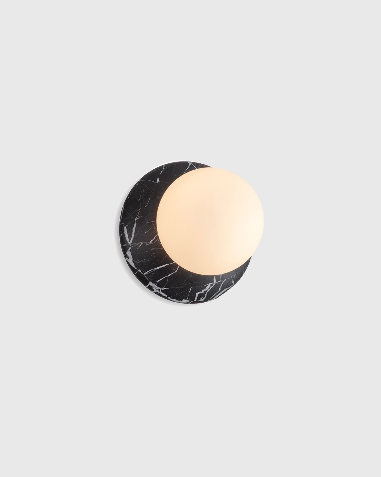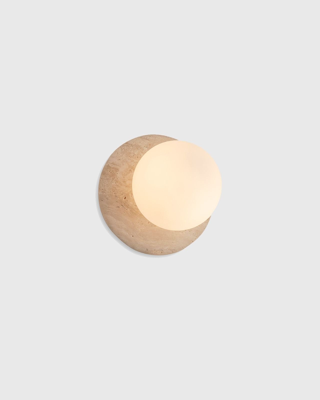 Graceful and sculptural, this mini wall light will enhance interiors as a singular fixture or as a cluster in modern or contemporary interiors. The elegant and pure opal glass sphere beautifully contrasts with the backplate made from natural stone, travertine, black, red or green marble. Handmade in UK and IP44 rated, this light will enhance bathrooms positioned on both sides of a mirror or bedrooms as bedside lamps.