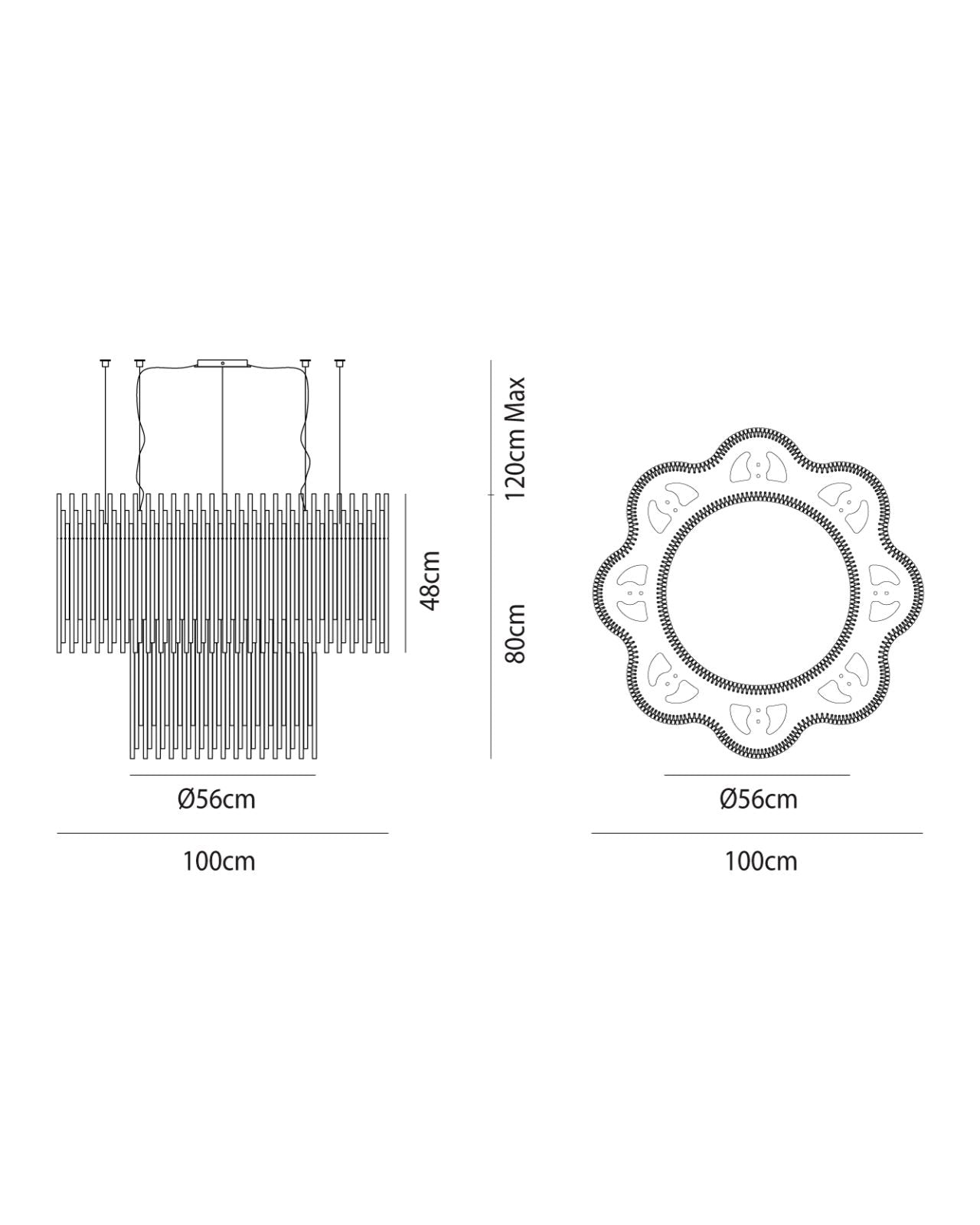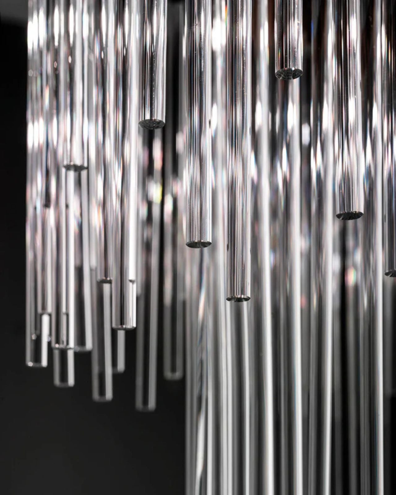 Centered around the concept of the glass rod, this contemporary circular chandelier combines reeds of varying sizes to reflect and play with the light to bring a sensation of opulence and timelessness to your space. Designed and made in Italy from mouth-blown Murano glass.