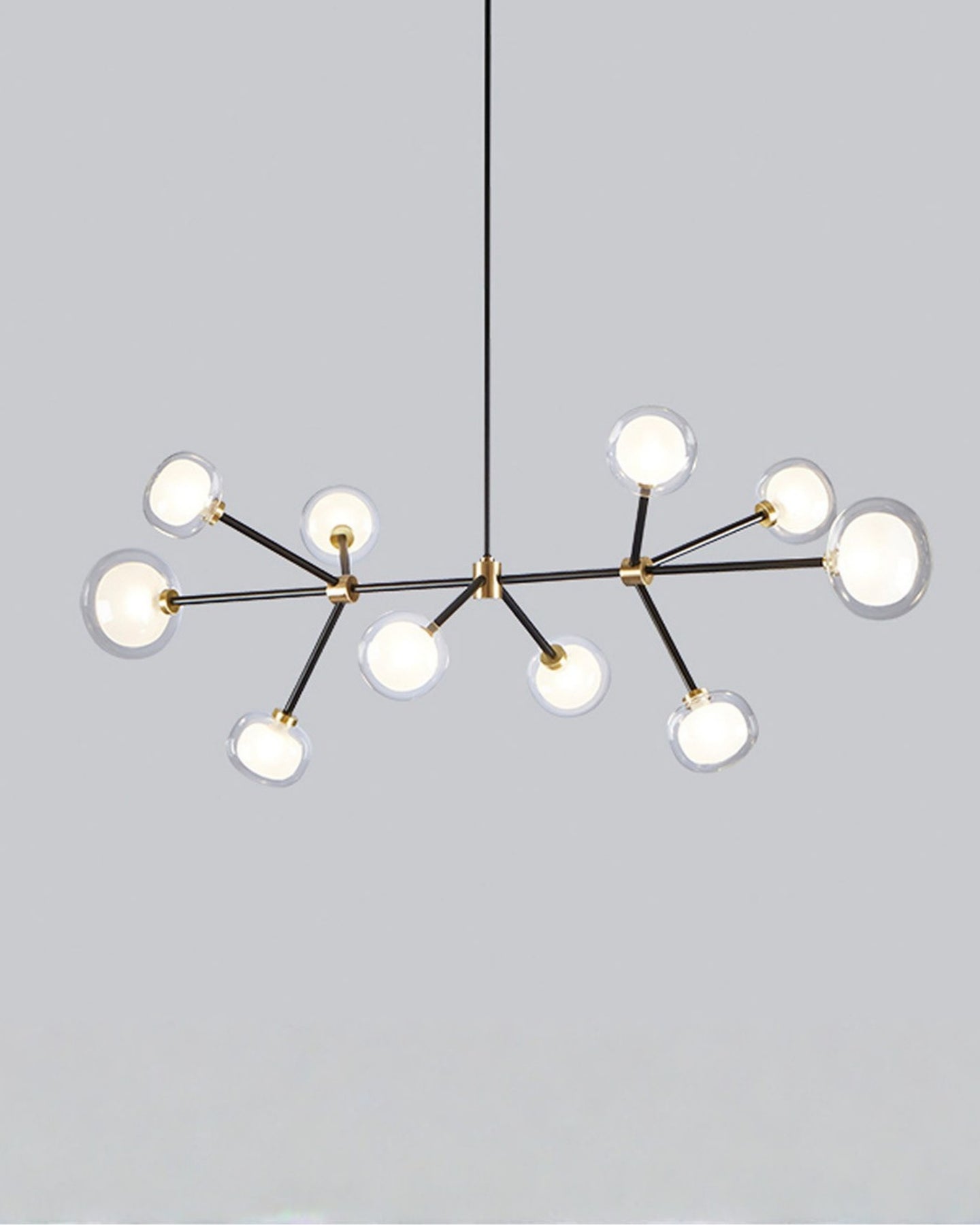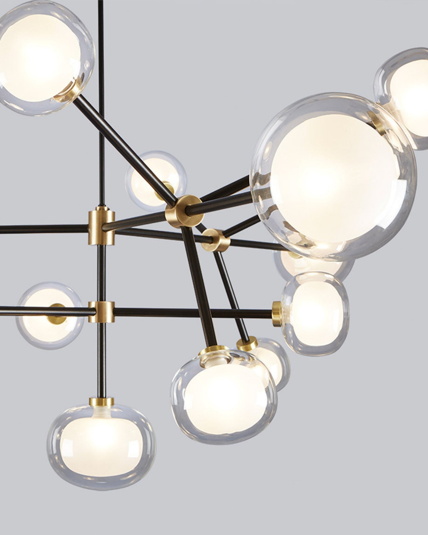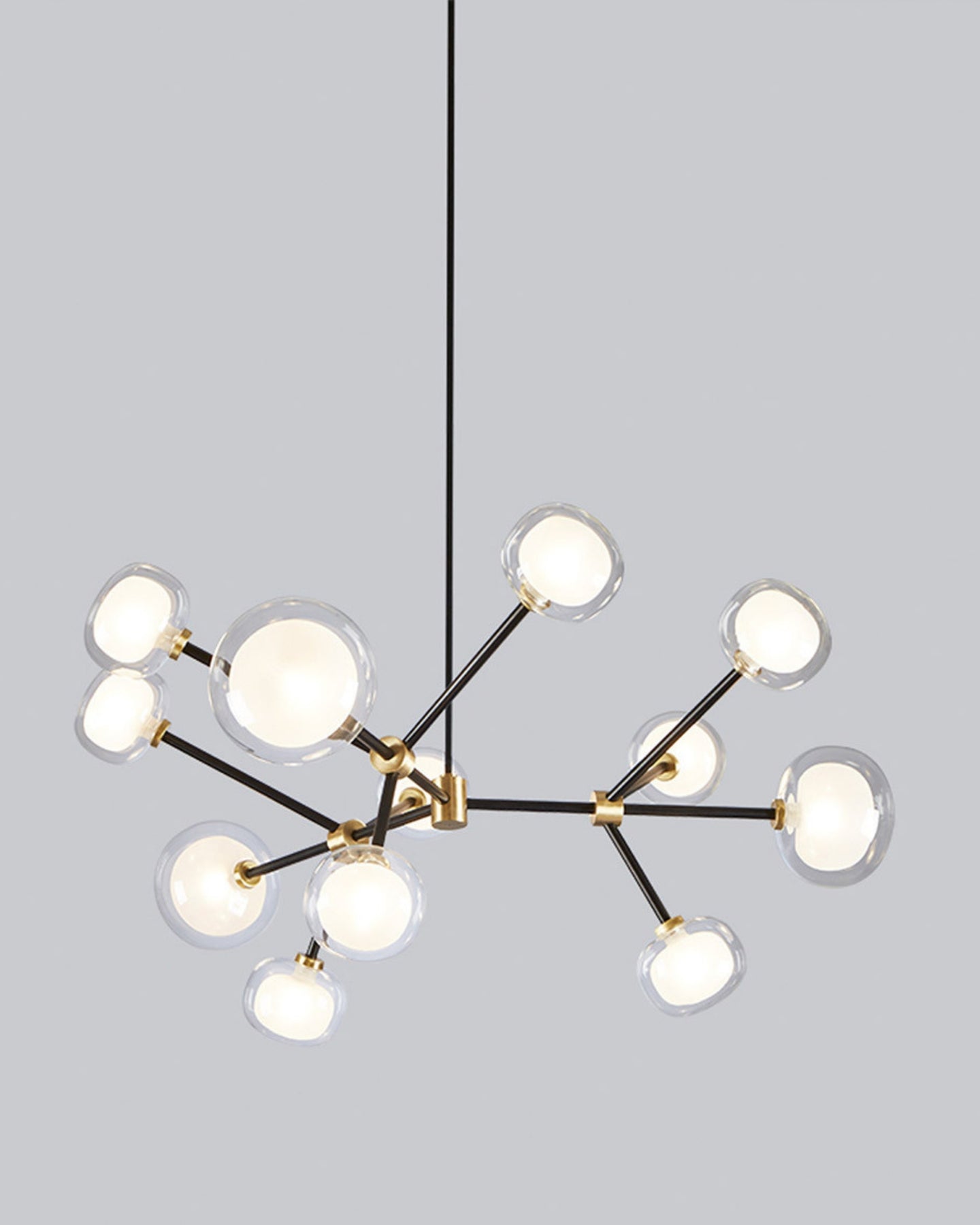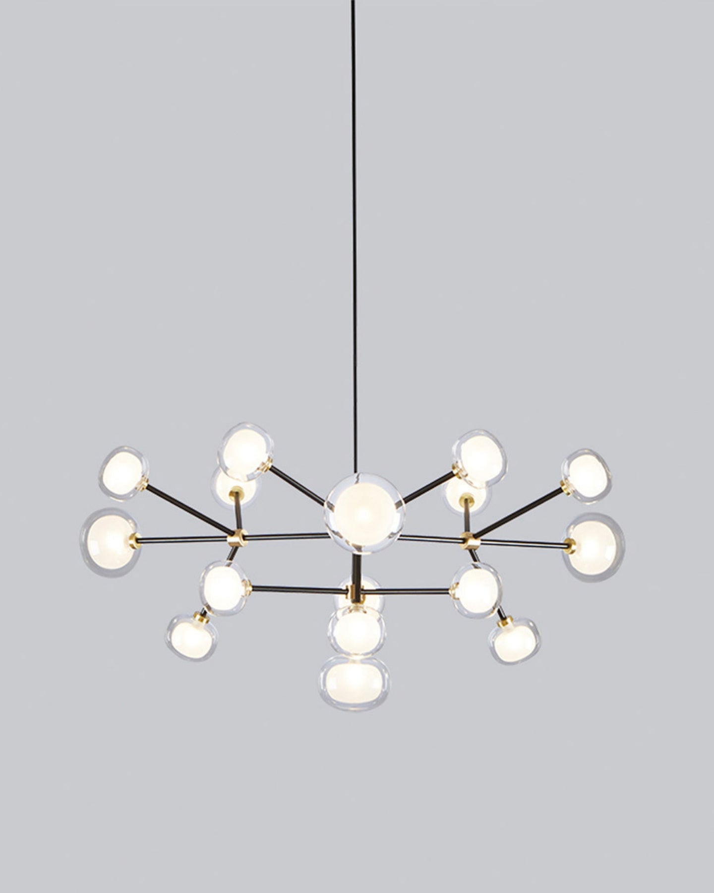 The Layered Glass Chandelier merges mid-century design principles with modern aesthetics through its striking architectural form. Comprising of 9, 10, 12, or 16 double-walled borosilicate glass spheres suspended from a metal frame, this fitting delivers both visual aesthetics and functional illumination. Available with brass or black chrome finishes, this statement piece creates a floating, sculptural presence ideal for expansive living spaces, formal dining rooms, and grand foyers.