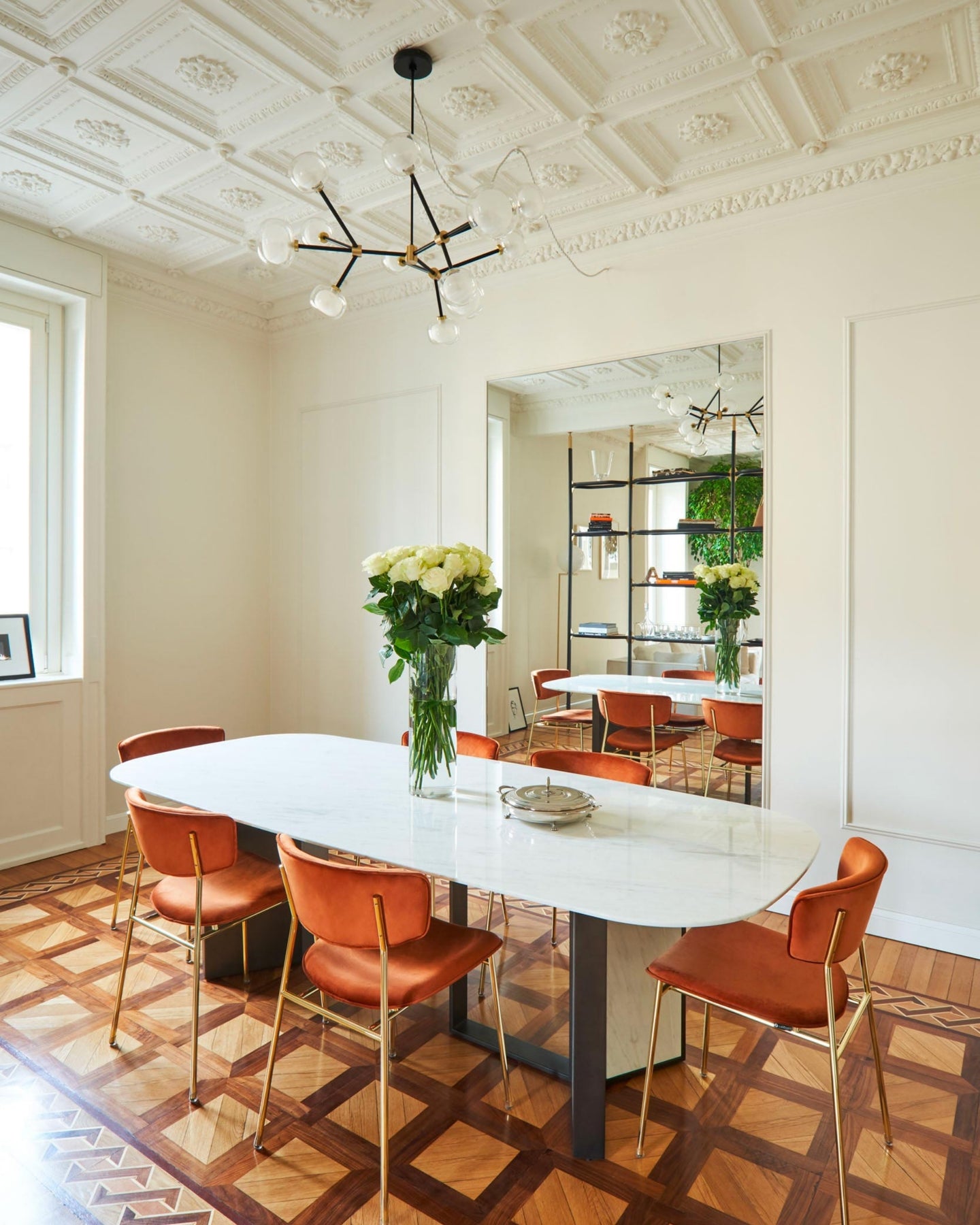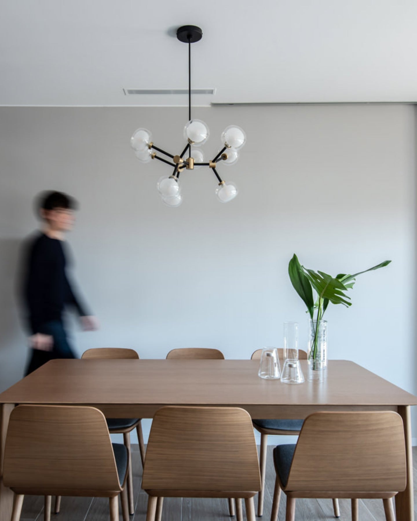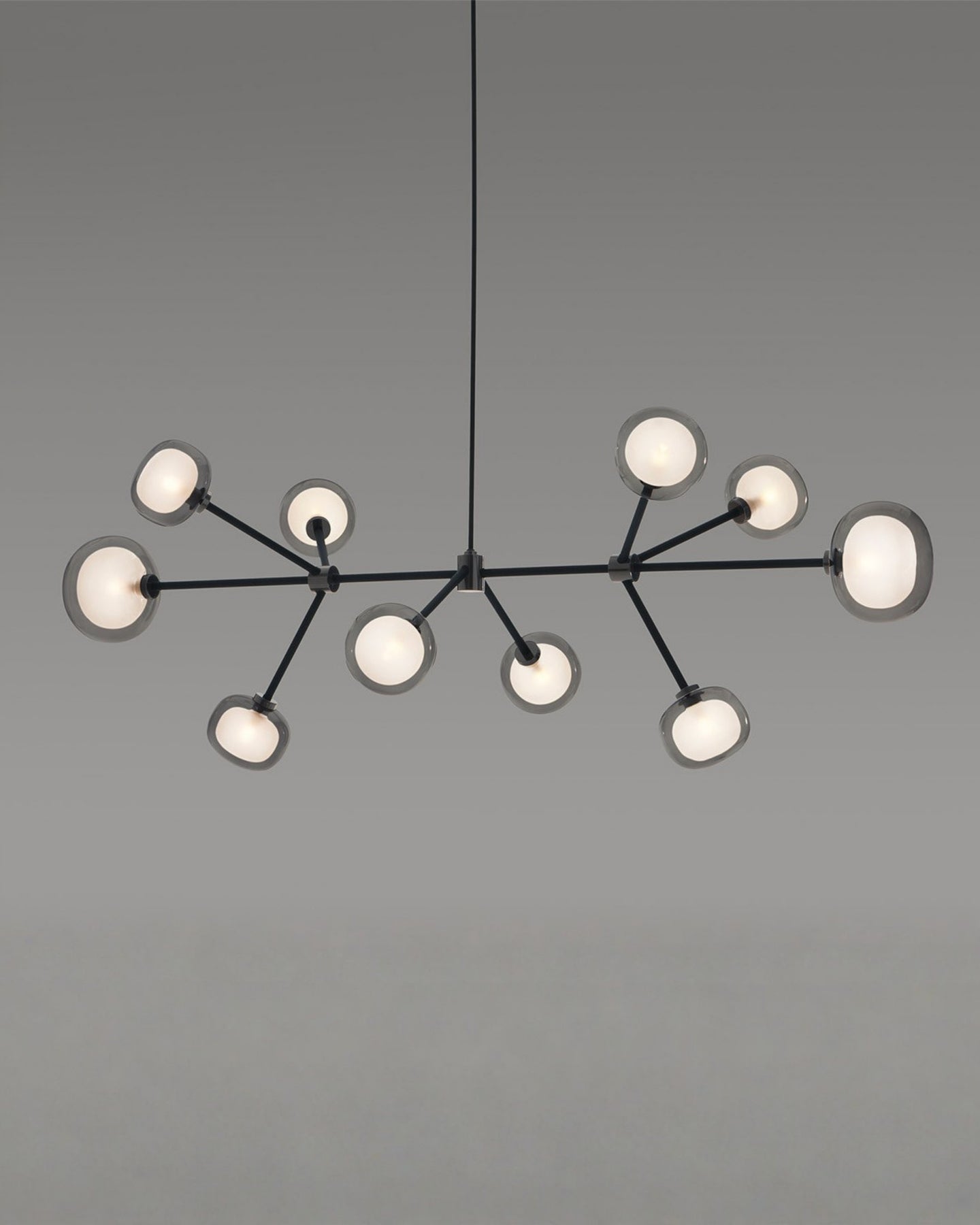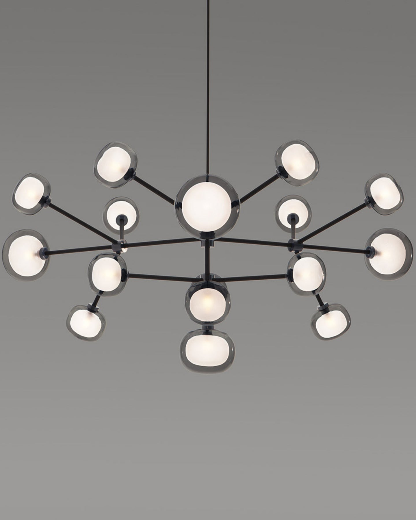 The Layered Glass Chandelier merges mid-century design principles with modern aesthetics through its striking architectural form. Comprising of 9, 10, 12, or 16 double-walled borosilicate glass spheres suspended from a metal frame, this fitting delivers both visual aesthetics and functional illumination. Available with brass or black chrome finishes, this statement piece creates a floating, sculptural presence ideal for expansive living spaces, formal dining rooms, and grand foyers.