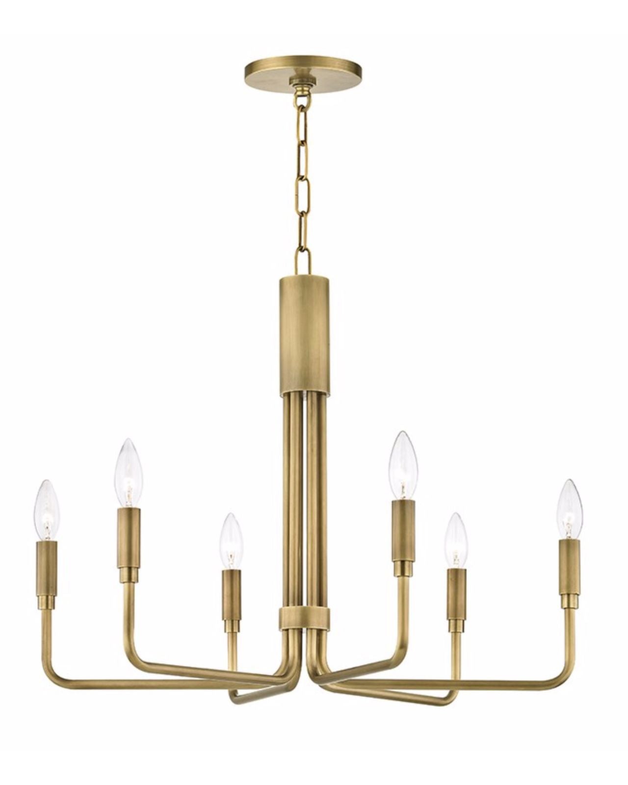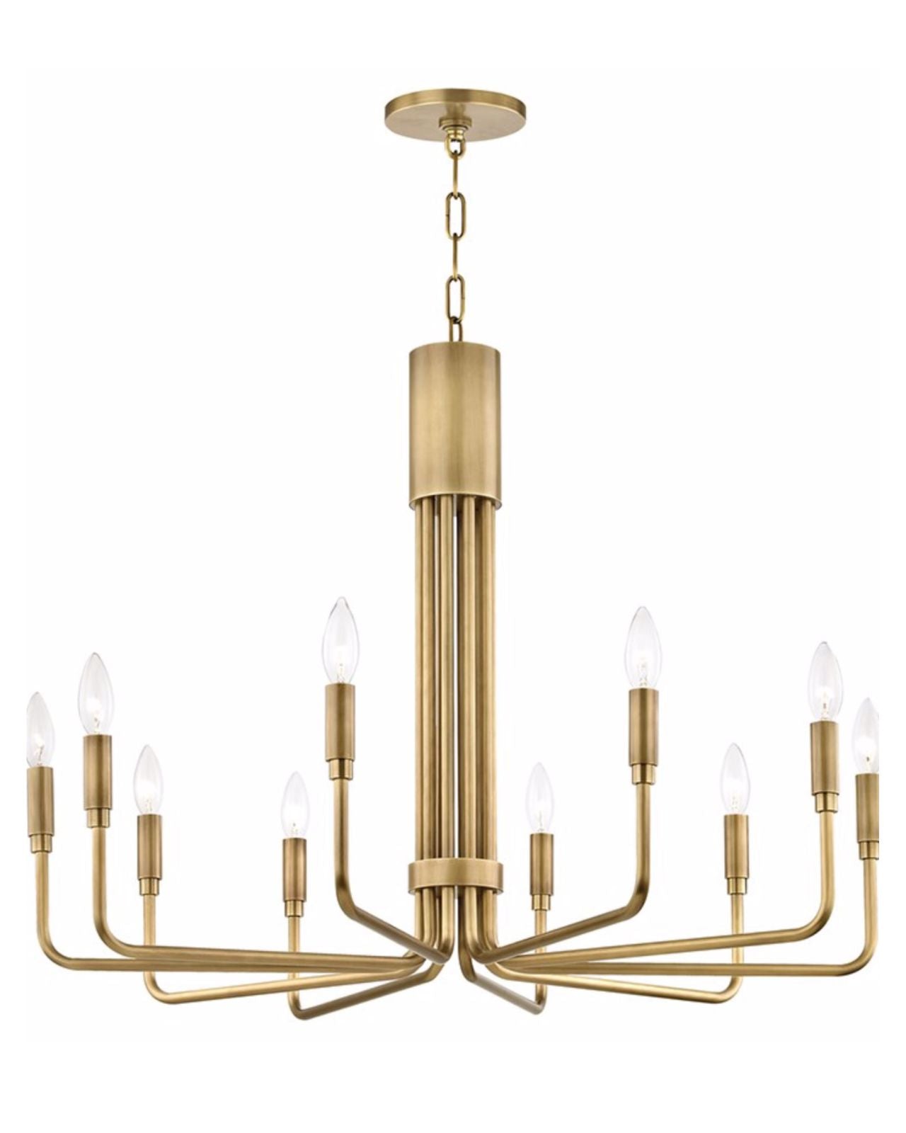 An alluring combination of mid-century modern and traditional design that is characterised by its distinct fundamental arms which expose the purity of its Aged Brass or Old Bronze frame. Showcasing exposed light bulbs this chandelier gracefully illuminates any area. Available in either a six or ten light style.