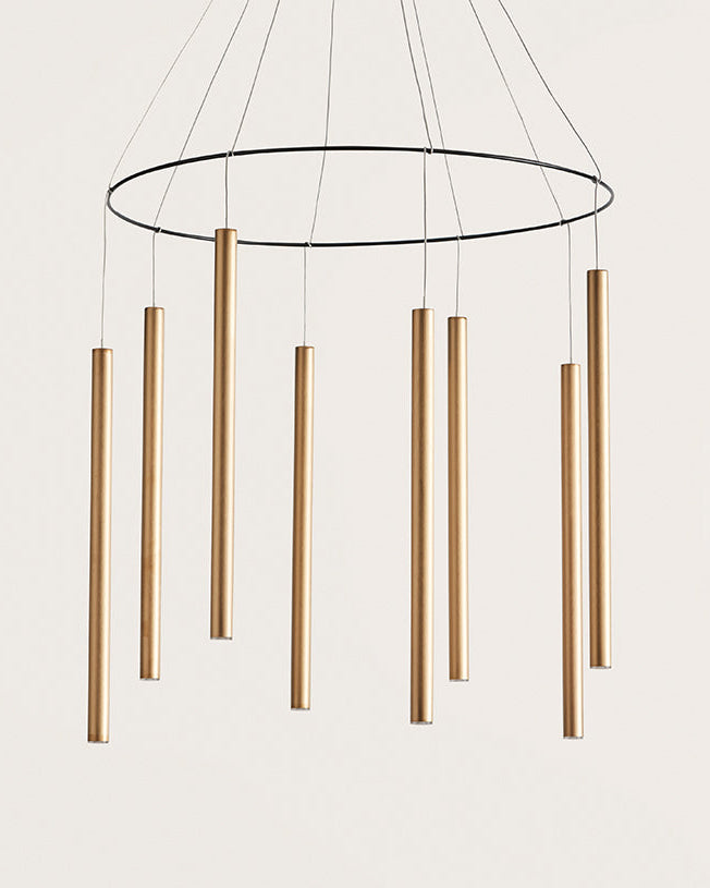 Designed in Spain its simplistic form consists of eight tubular shades suspended from a steel 600mm ring and a black ceiling plate. Featured with eight integrated COB LED's this contemporary take on a chandelier will become a focal point within any interior.  Reminiscent of wind-chimes the Minimalist Rod Chandelier will bring an air of luxury and charm to large spaces.  Available in assorted steel finishes.