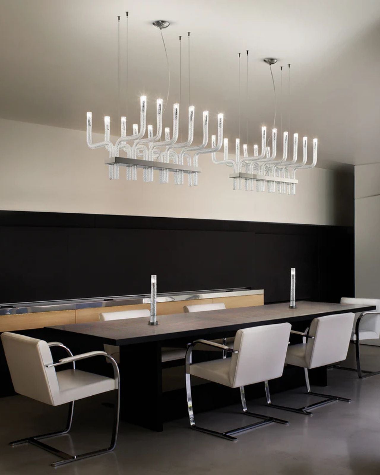 Evoking the beauty of the night sky, this mouth-blown glass linear pendant boasts crystal glass and handcrafted designs. Resting on top of a metal frame to enhance the elegant fastening system of the network of arms and cabling system to unite the elegance and creativity of this light.