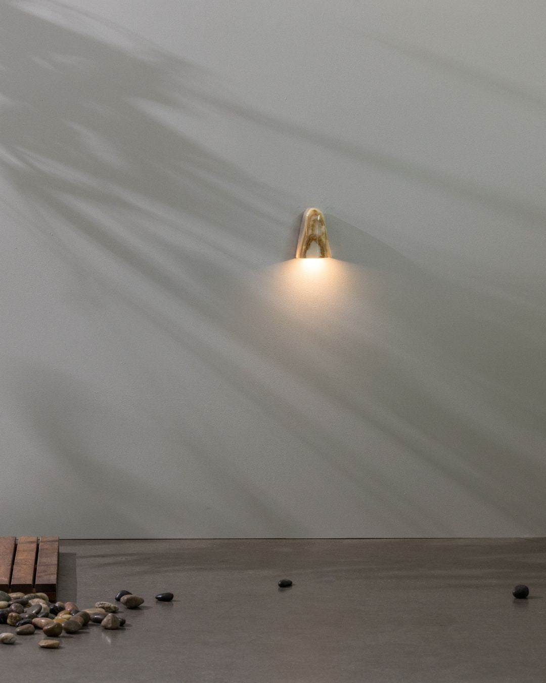Small wall-mounted light fixture casting a warm glow on a neutral background with scattered objects.