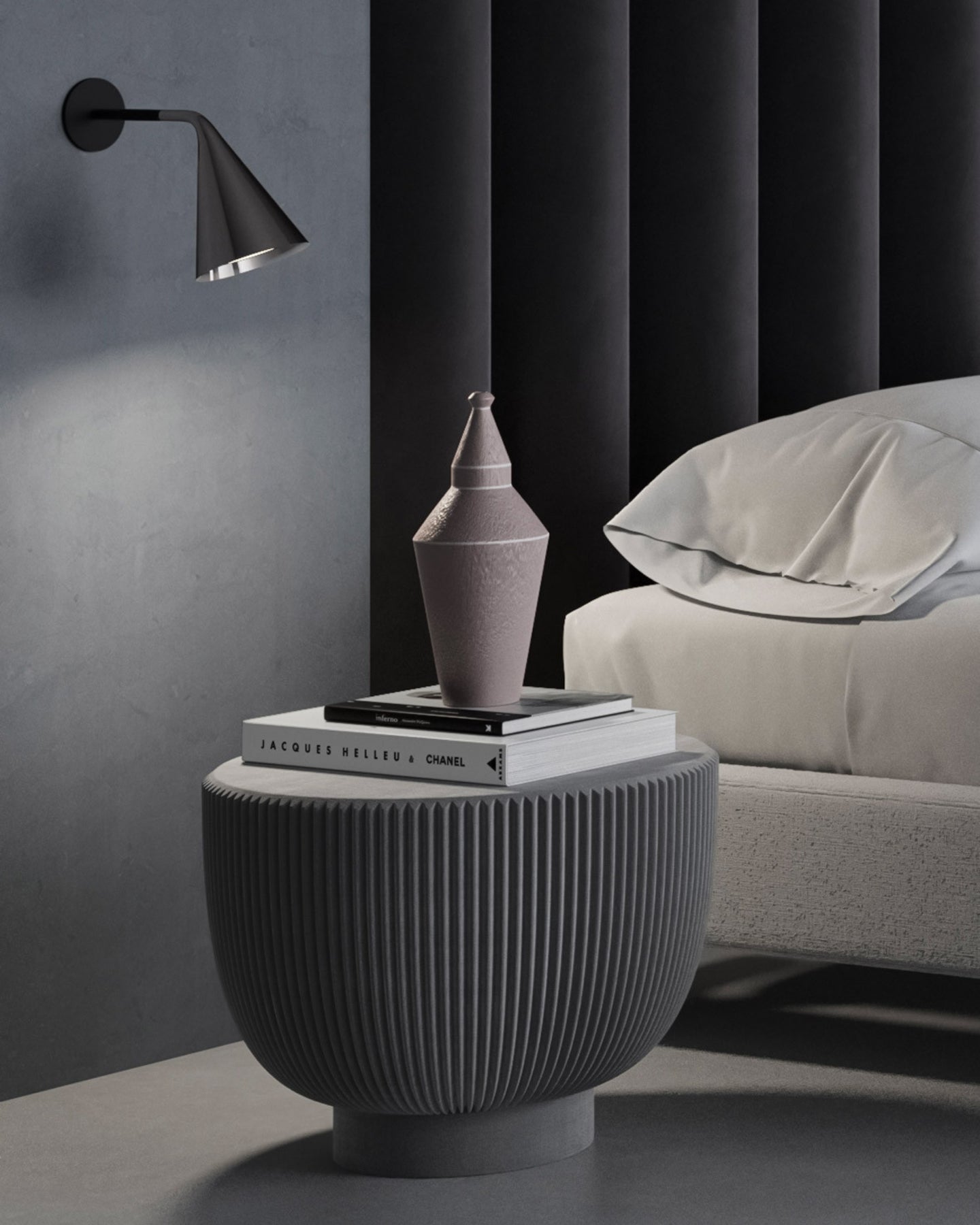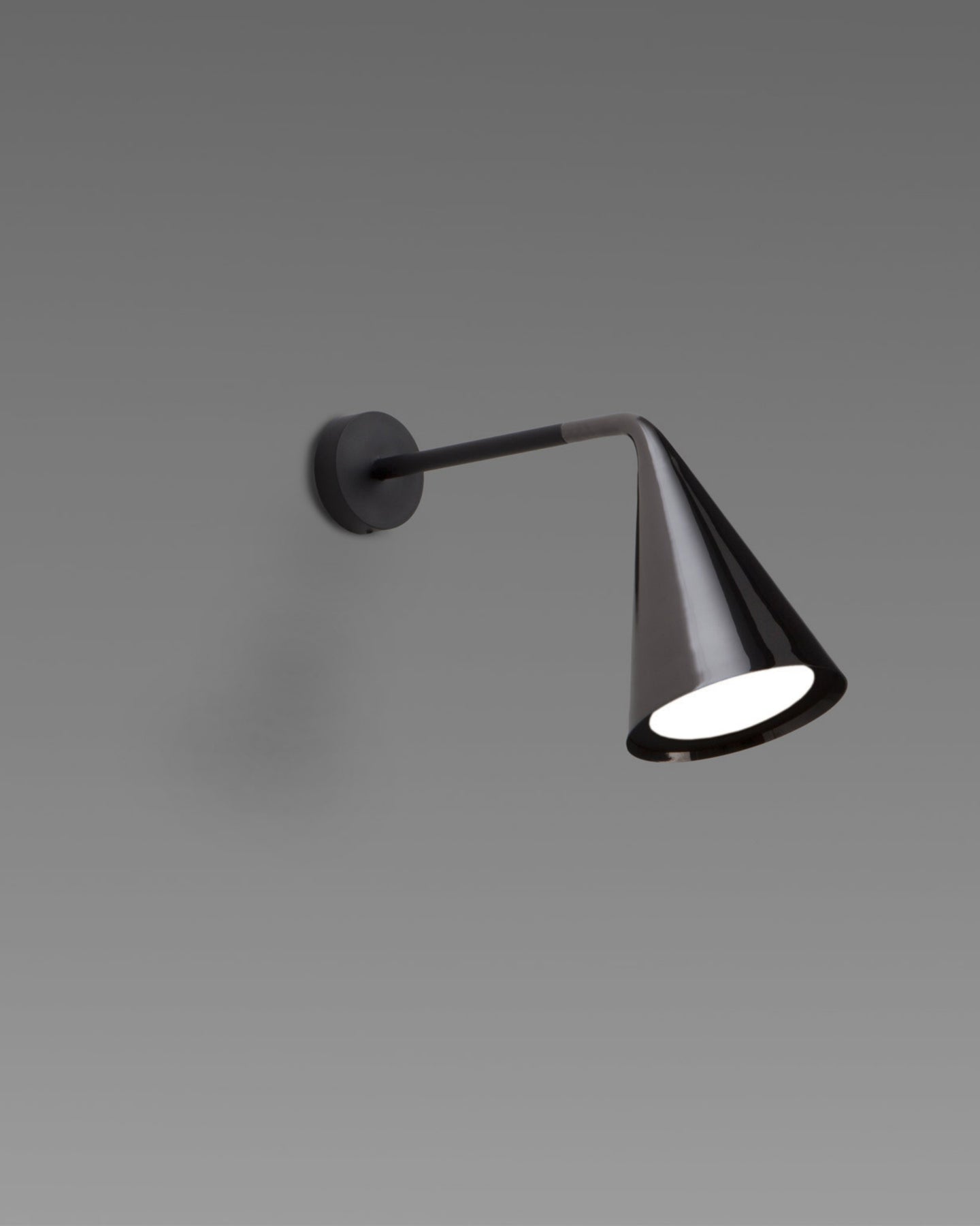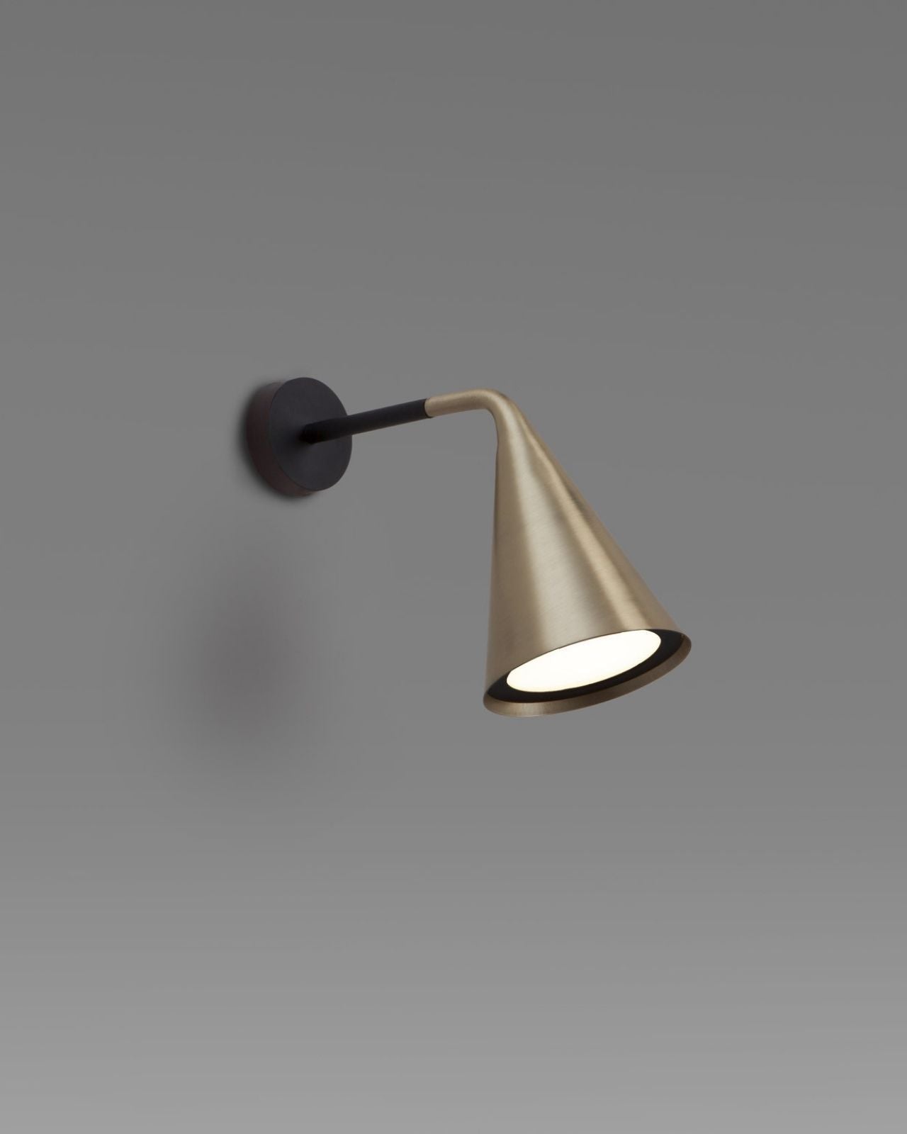This wall light is suitable to be used in different interior environments and can be displayed as a bedside lamp in a bedroom or as a reading light in a living room. The fixture has a refined design featuring a conical shade available in brass, black and chrome, or matte black finish and a long sleek angled black arm. It will provide a warm light downwards, setting a pleasant atmosphere in the surroundings.