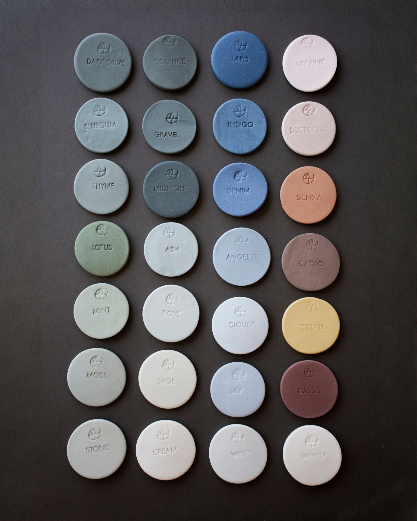 | Finishes / Colours | Moss | Cacao | Cream | Lapis | Thyme | White | Cassis | Sienna | Citrine | Ash Grey | Wisp Grey | Cloud Blue | Dark Olive | Denim Blue | Dusky Pink | Mint Green | Gravel Grey | Lotus Green | Angelite Blue |