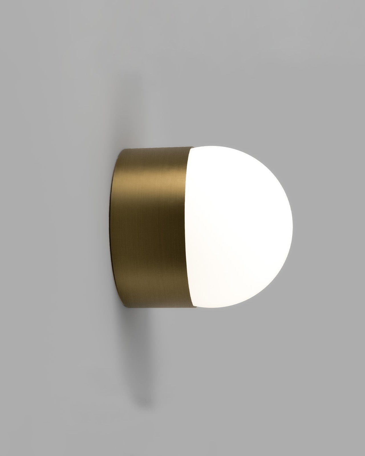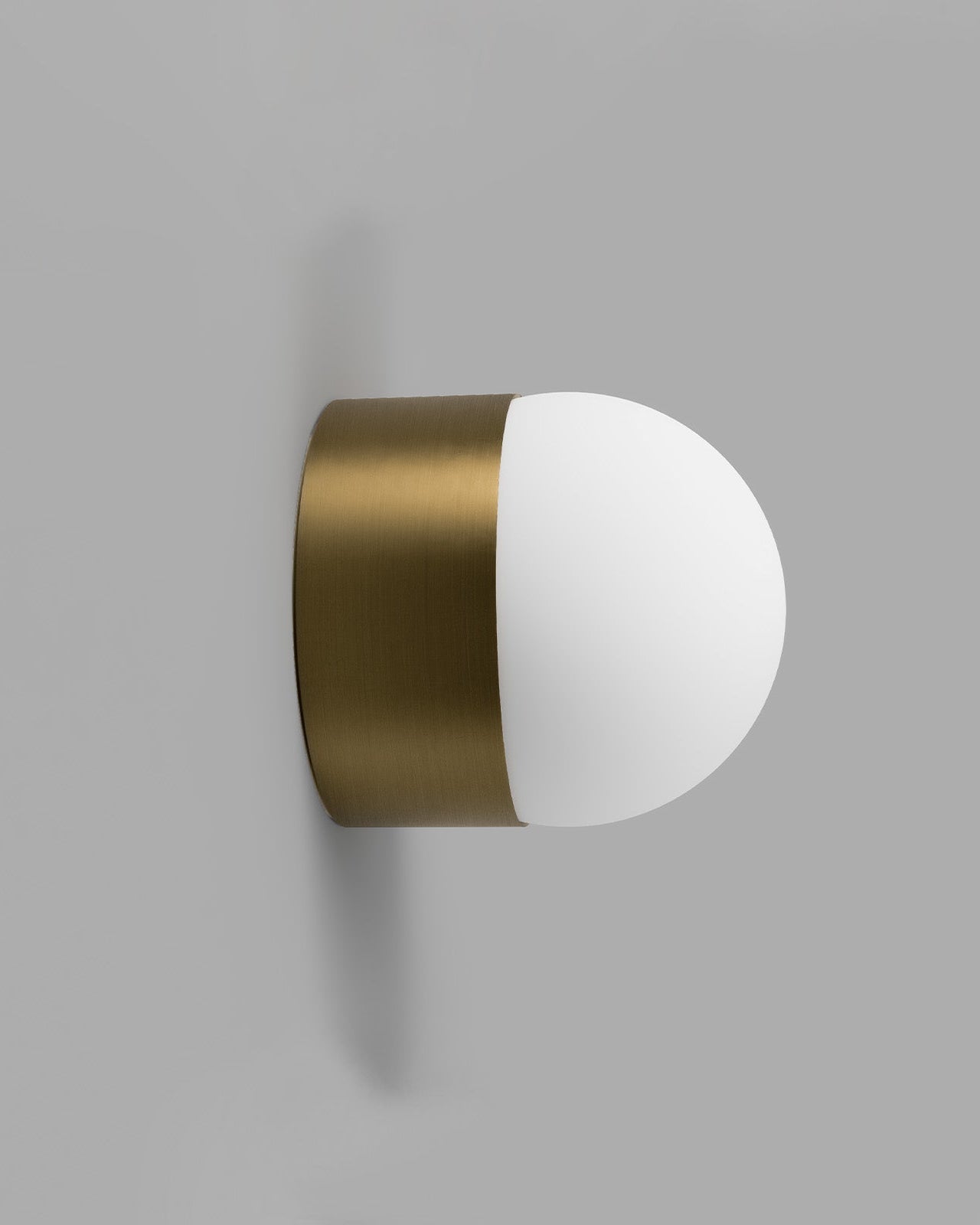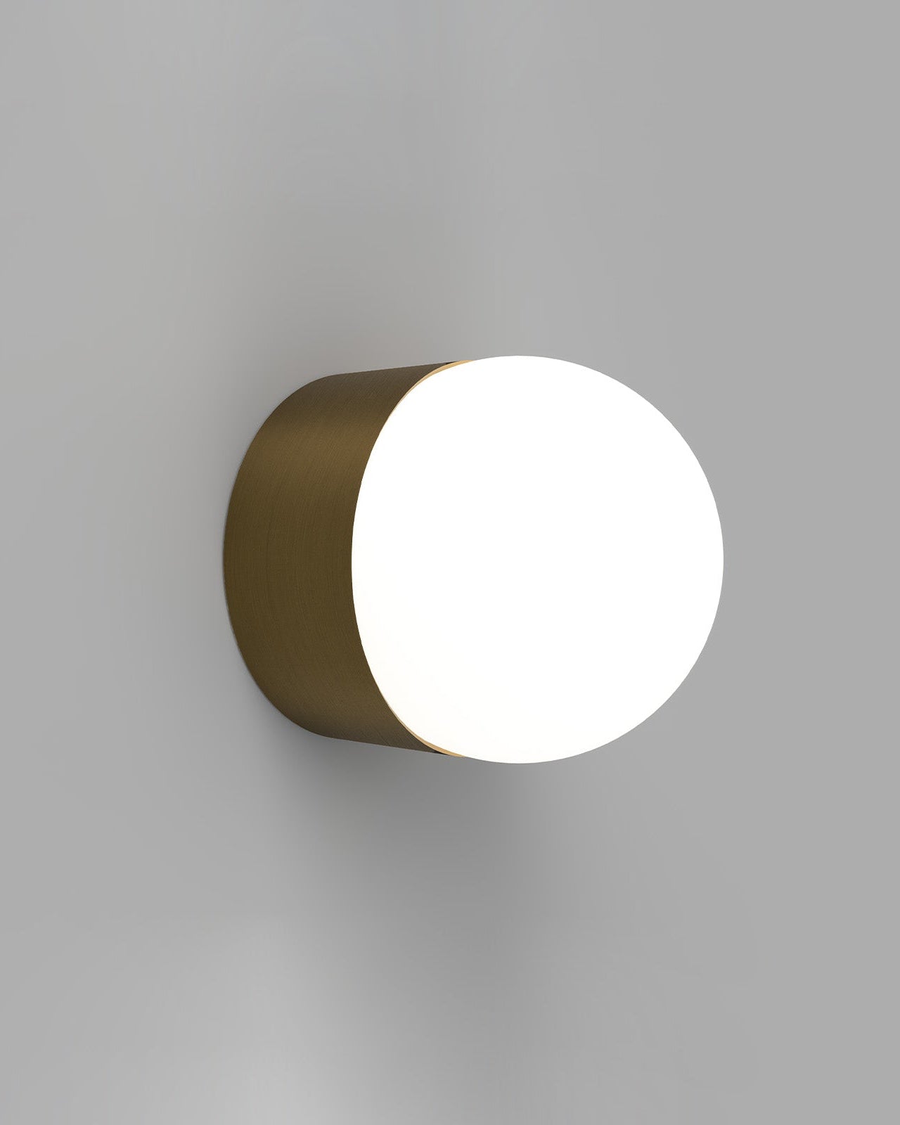 Cylindrical wall light with brass finish and white shade on a gray background