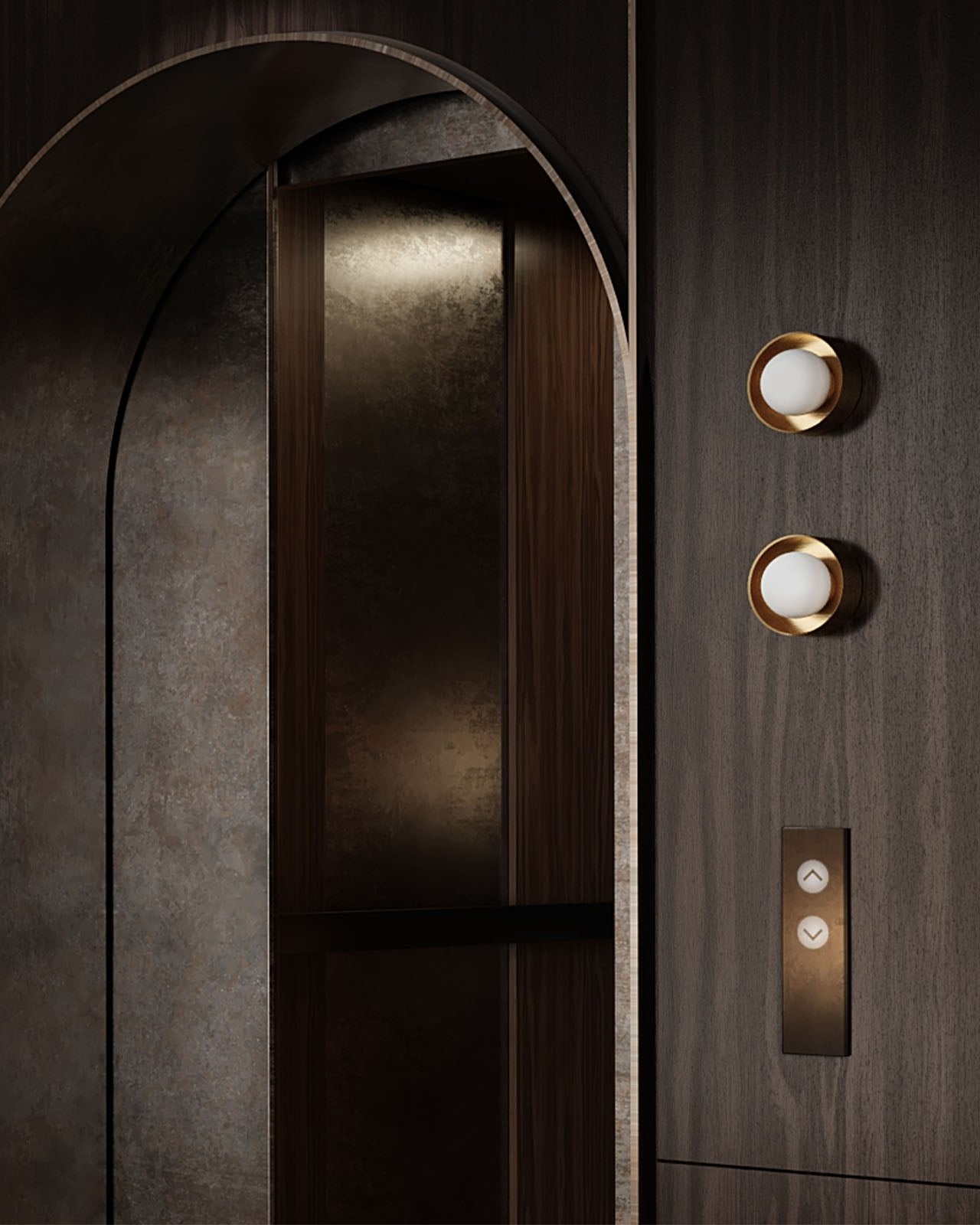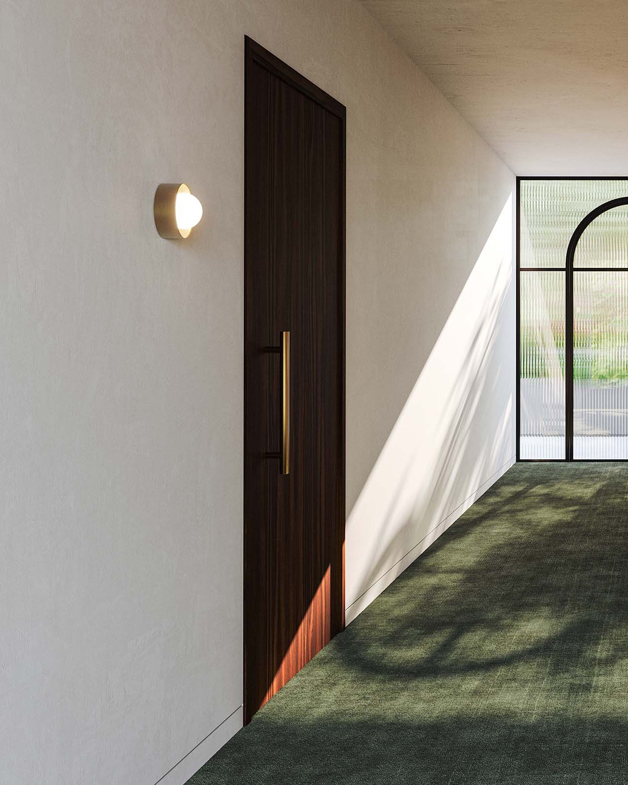 Modern interior with a dark wooden door and wall-mounted light fixture.
