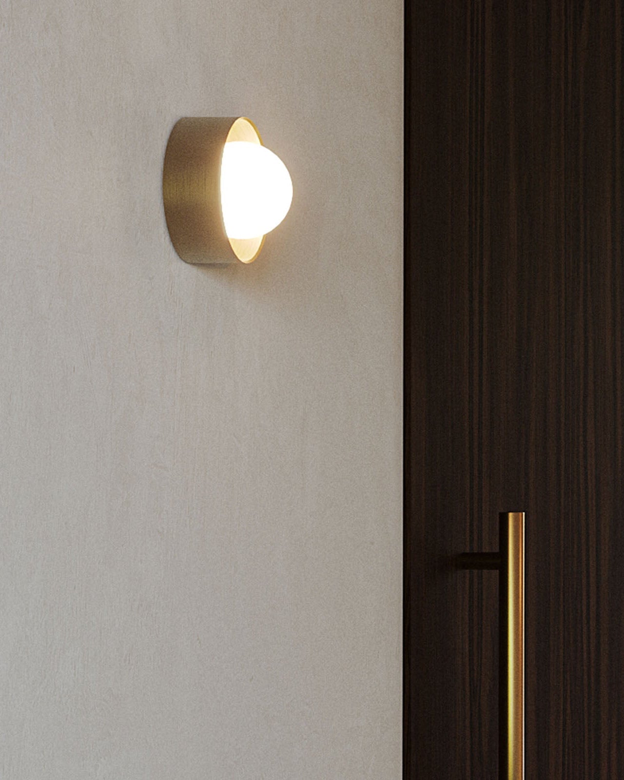 Modern wall light fixture on a neutral wall next to a wooden door.
