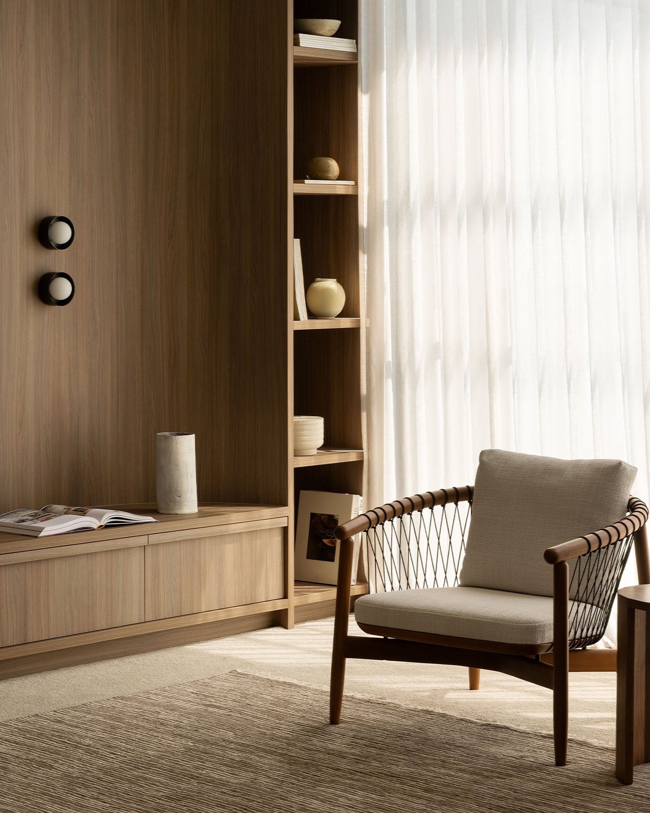 Modern living room with wooden armchair, bookshelf, and wall decor.