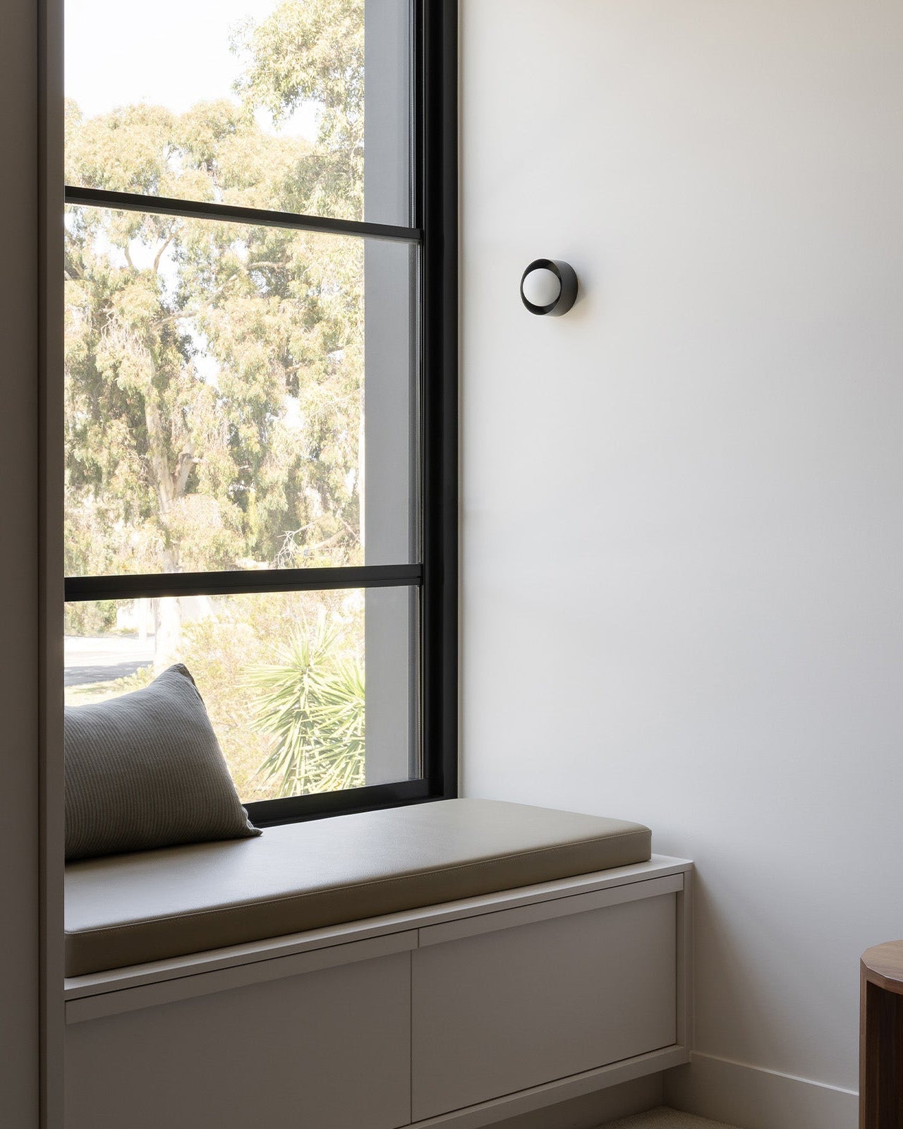 Window seat with cushion next to a large window with a view of trees and an orb wall light
