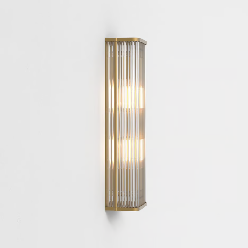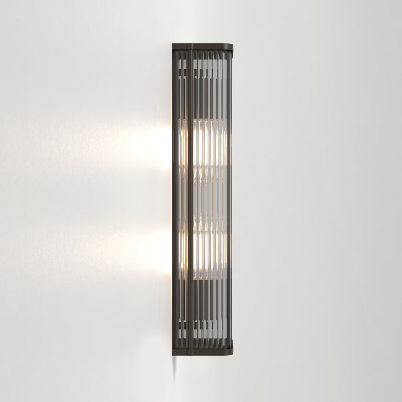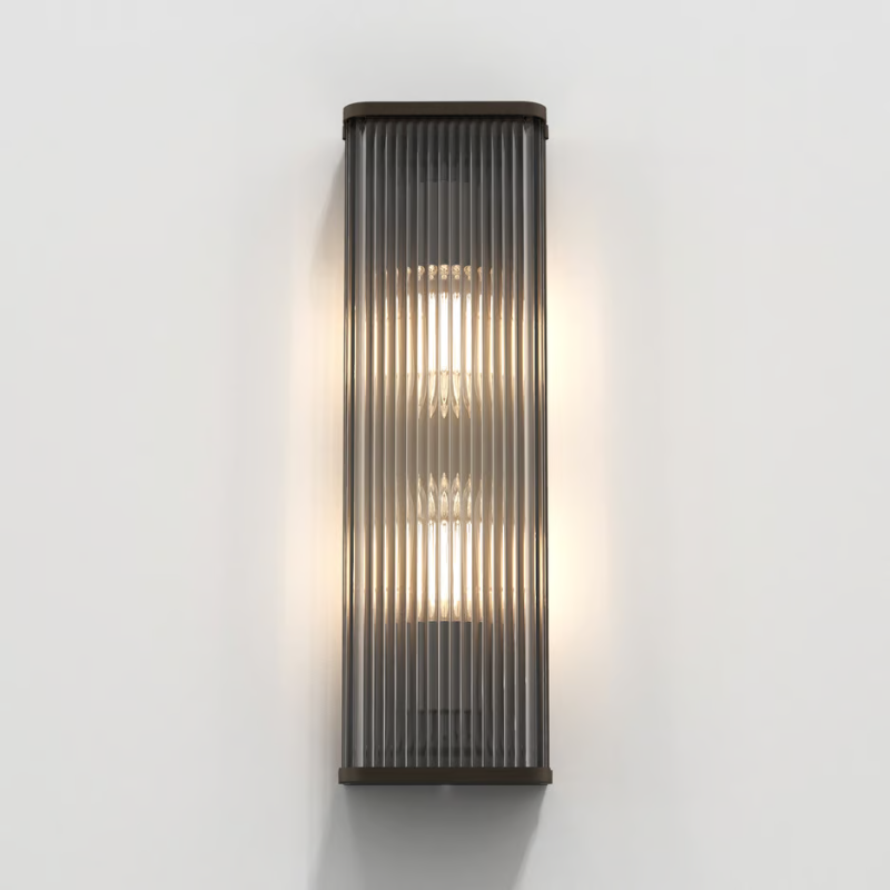 Inspired by Art Deco design, the Square Reeded Glass Wall Light is a simple yet striking design, available in two sizes and finishes. Its tall, slender silhouette and profile are accentuated by a reeded glass shade and a die-cast brass or dark bronze frame, offering a soft diffused light. Ideal for commercial or residential settings, this fixture is mounted to the wall with a single discreet screw, providing a sleek and seamless look.