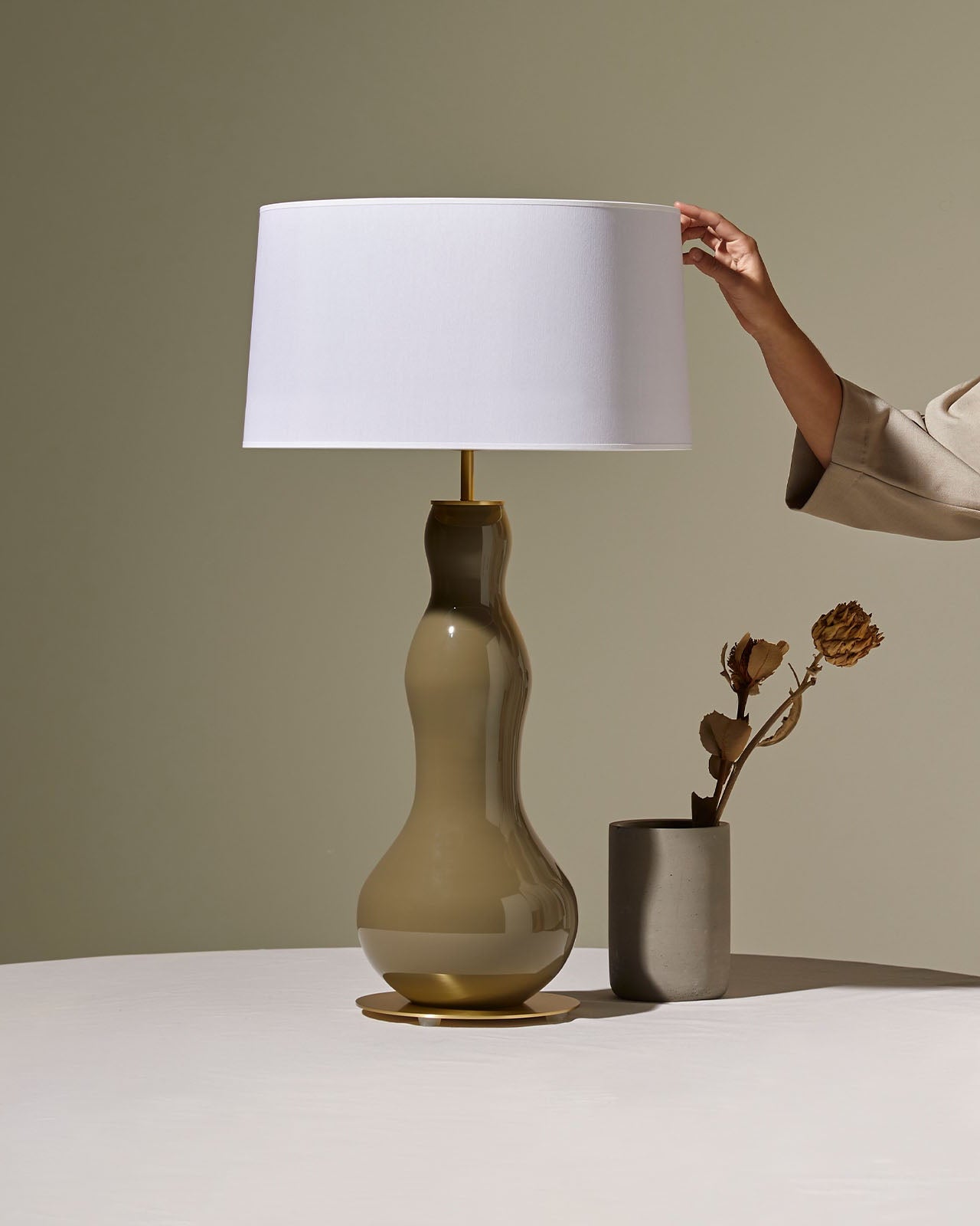 Fusing art with lighting design this contoured table lamp showcases a smooth glass base finished in stunning moss green. Made of glass, this tall base is matched with Matte Brass detailing and a crisp white shade. Its decorative form is suited for adding a playful touch to bedside tables, hallway consoles or living room coffee tables.