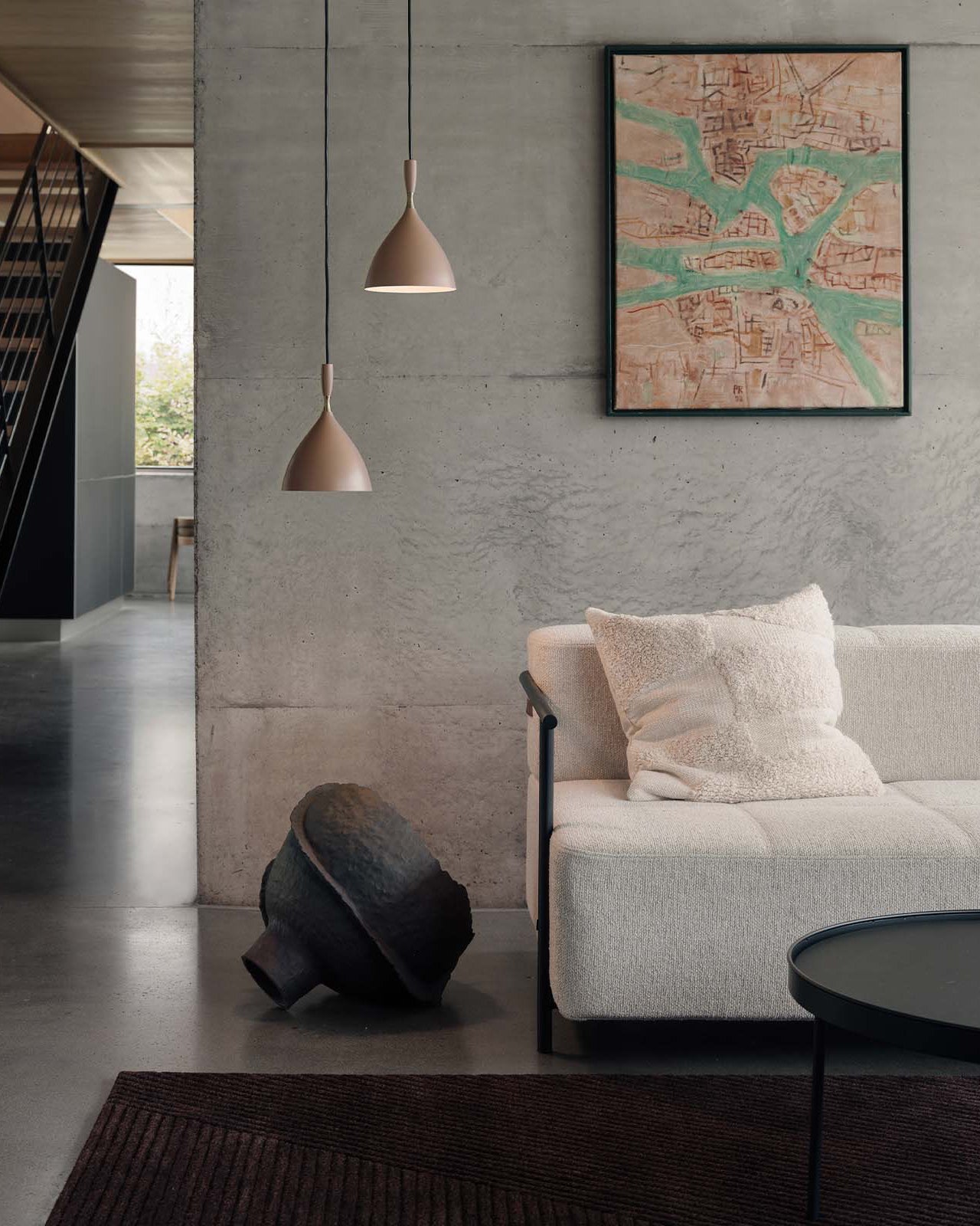 Modern living room with a gray sofa, 1954 Original Scandinavian Pendant Lights, and art on the wall.