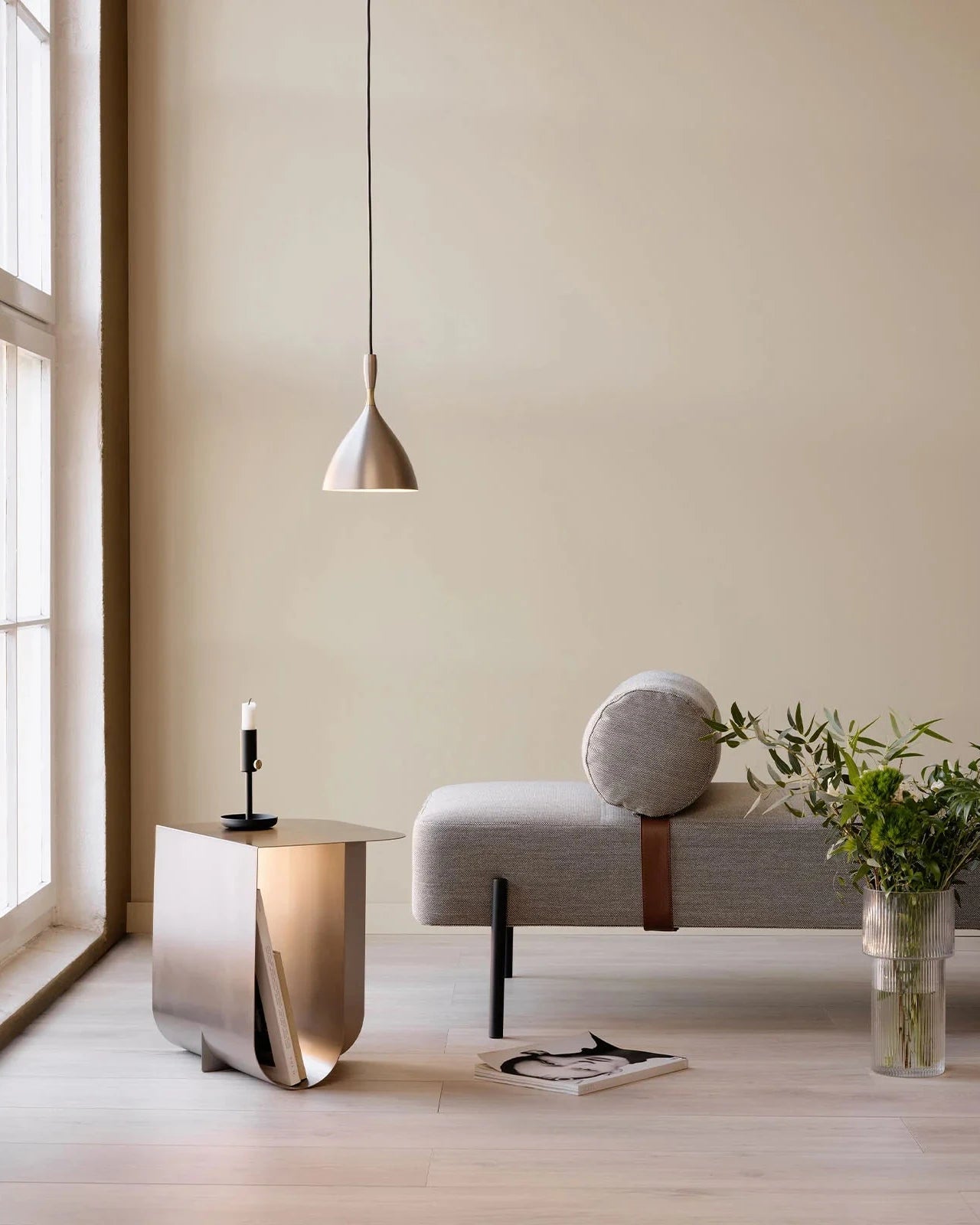 Modern interior with a gray sofa, side table, and 1954 Original Scandinavian Pendant Light | Lighting Collective