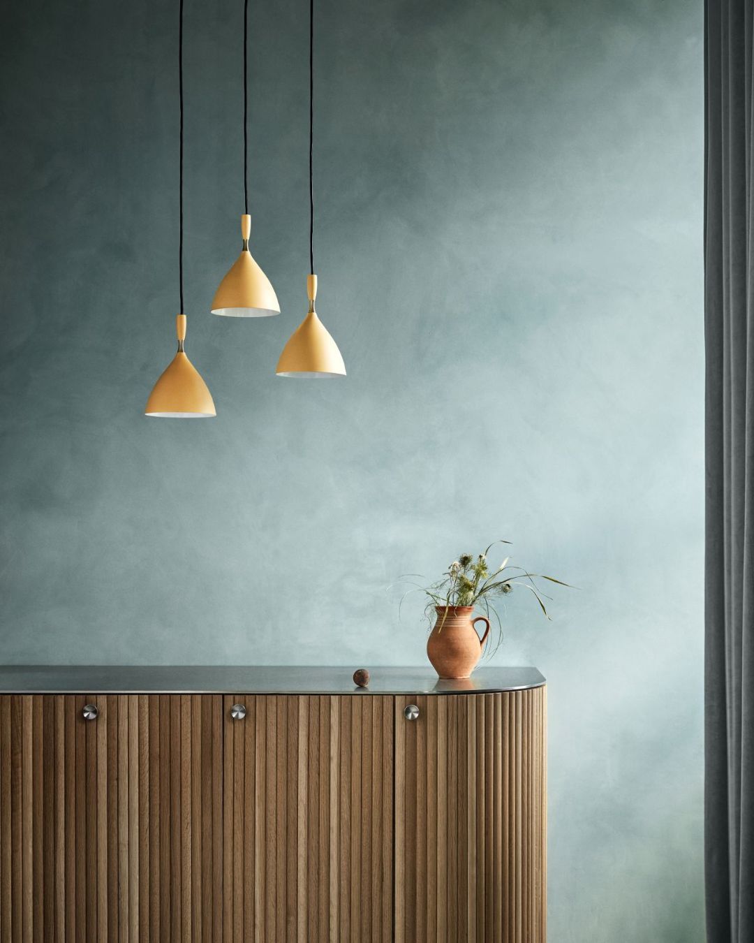 Three 1954 Original Scandinavian Pendant Lights hanging above a wooden cabinet with decor items on a wooden wall background.