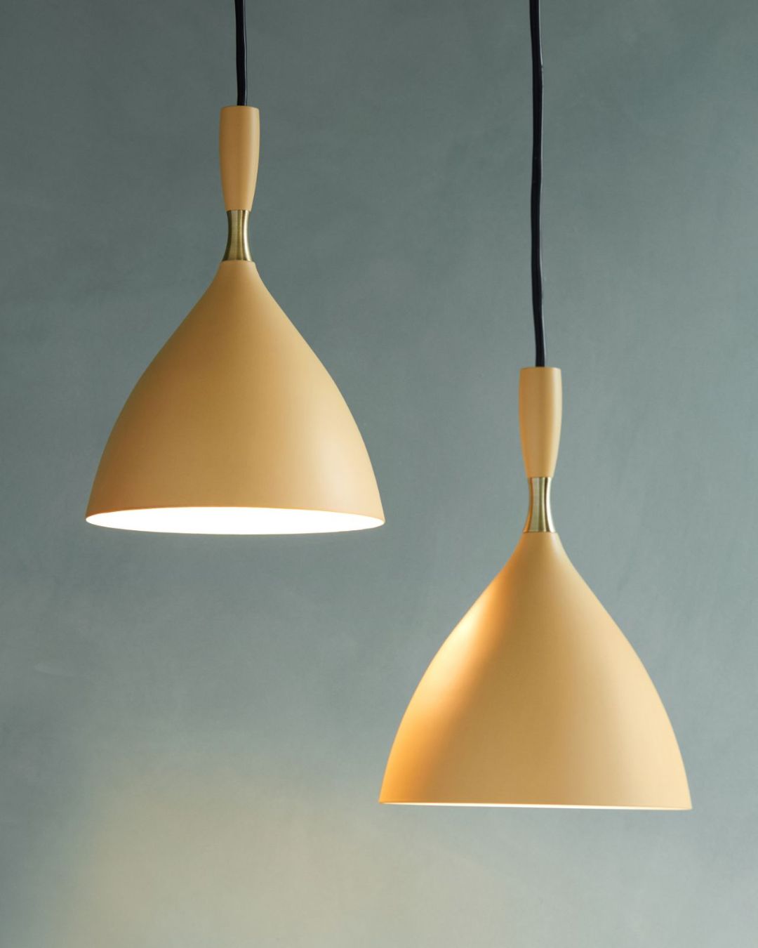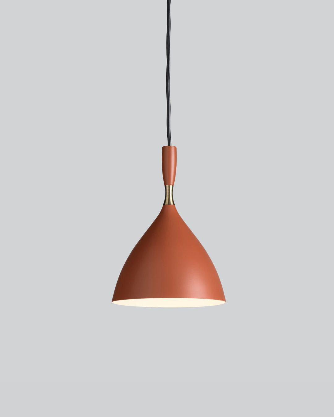 Available in six elegant colours and complemented by a brass ring, these modernist pendants look great on their own or in a row above benchtops and tables. Mix and match different colours for a bit of fun.