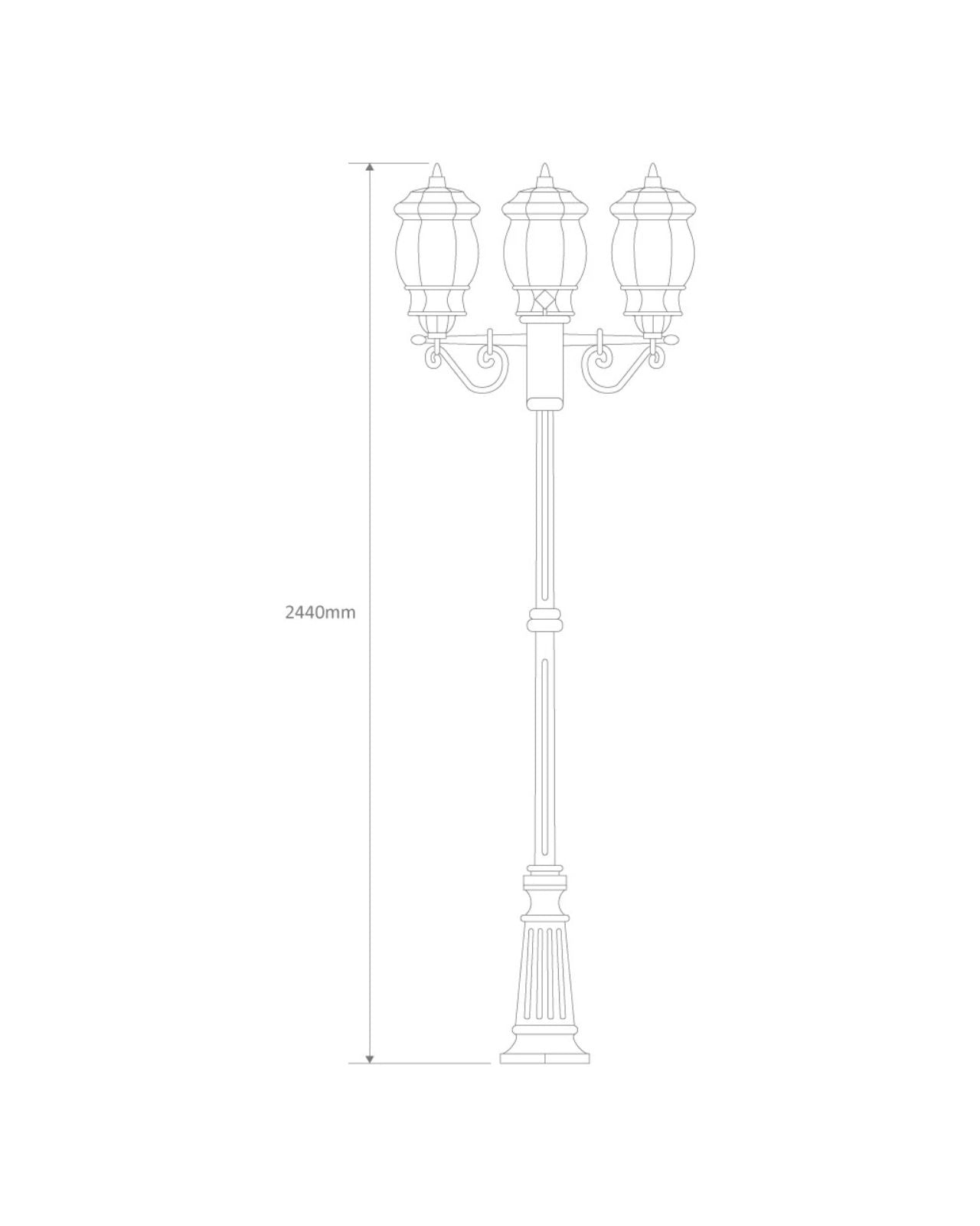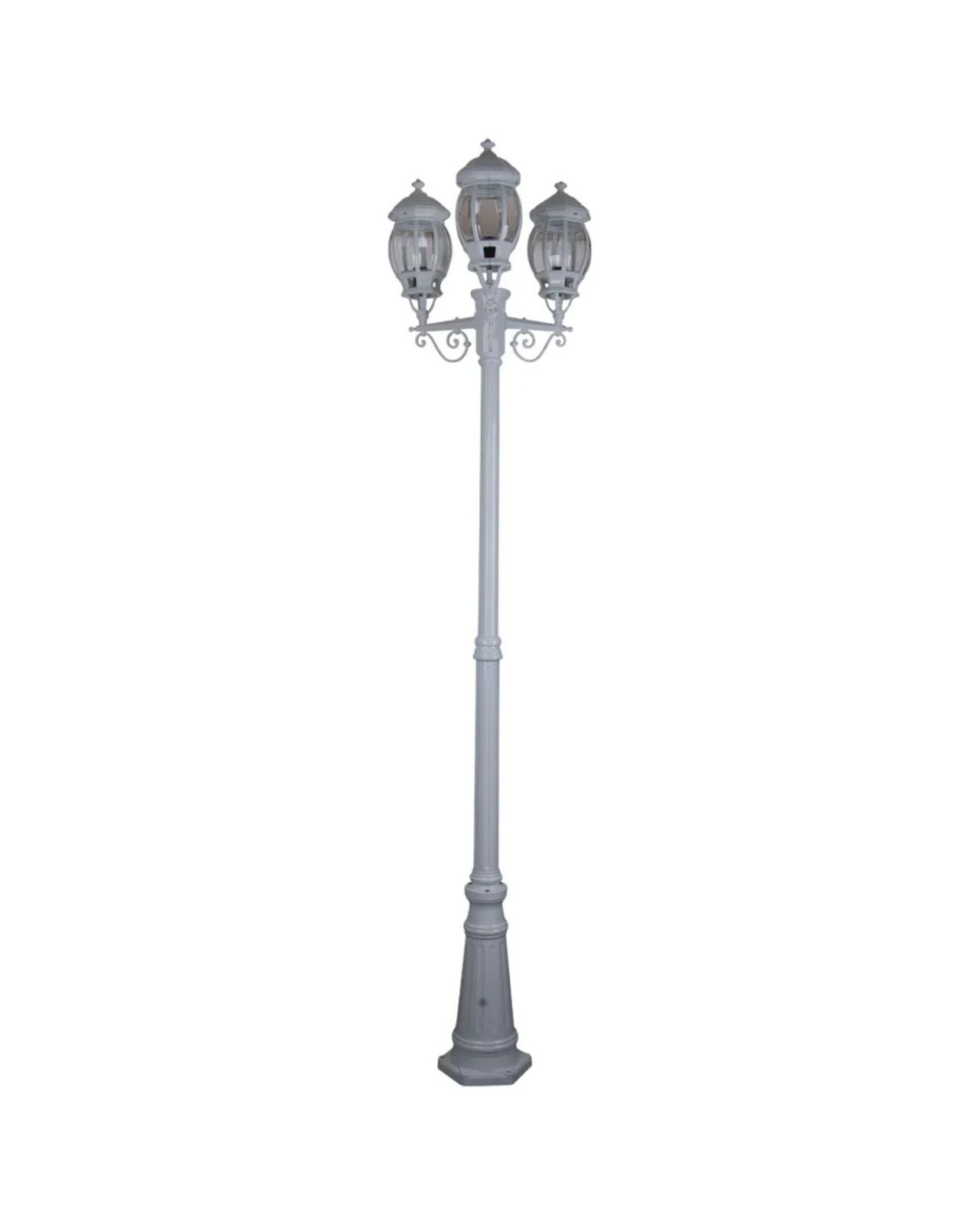 This Italian made and Australian assembled 3 head street light features a die-cast aluminium body and moulded acrylic lens. It is reminiscent of old times long gone and an elegant feature. It is supplied with a 1 year replacement warranty. Available in 1 light, 2 light and 3 light configuration.