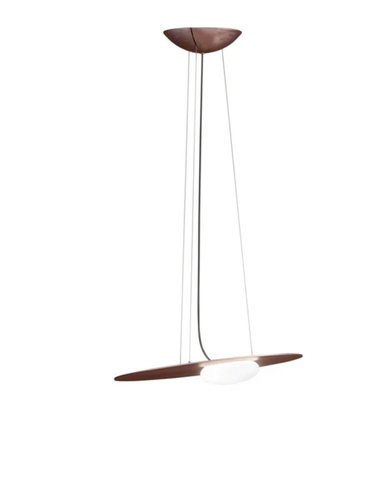Designed in Italy with a minimalist profile this contemporary pendant is comprised of a painted aluminium disc and blown glass diffuser. An integrated LED light source is housed within its decentralised diffuser allowing for ample illumination.
