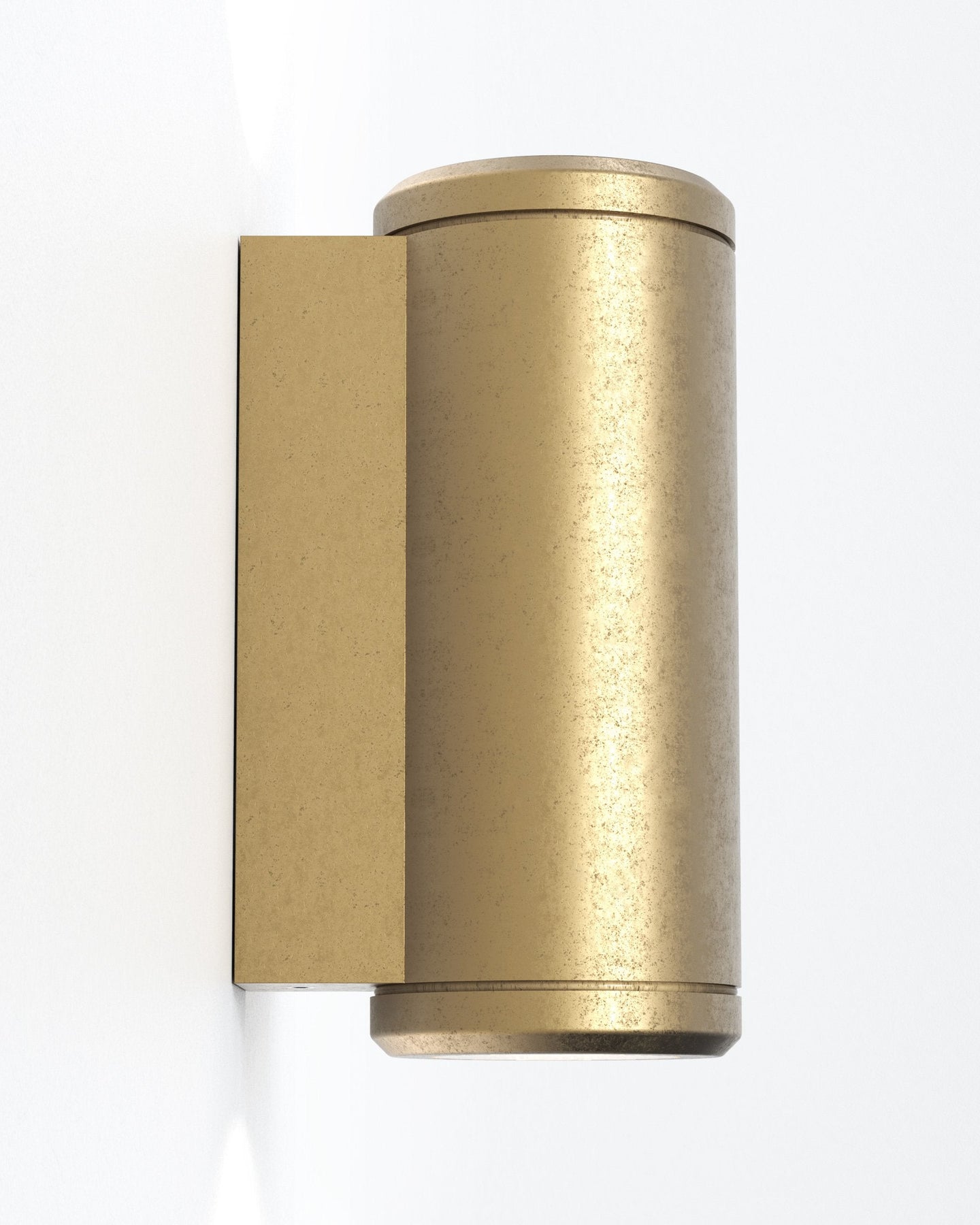 A refined, cylindrical outdoor wall-mounted light, designed for vertical installation. It draws on a minimal, contemporary aesthetic yet offers a warm character thanks to its brass finish and subtle detailing.