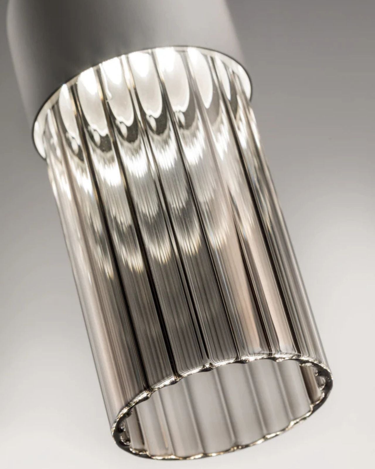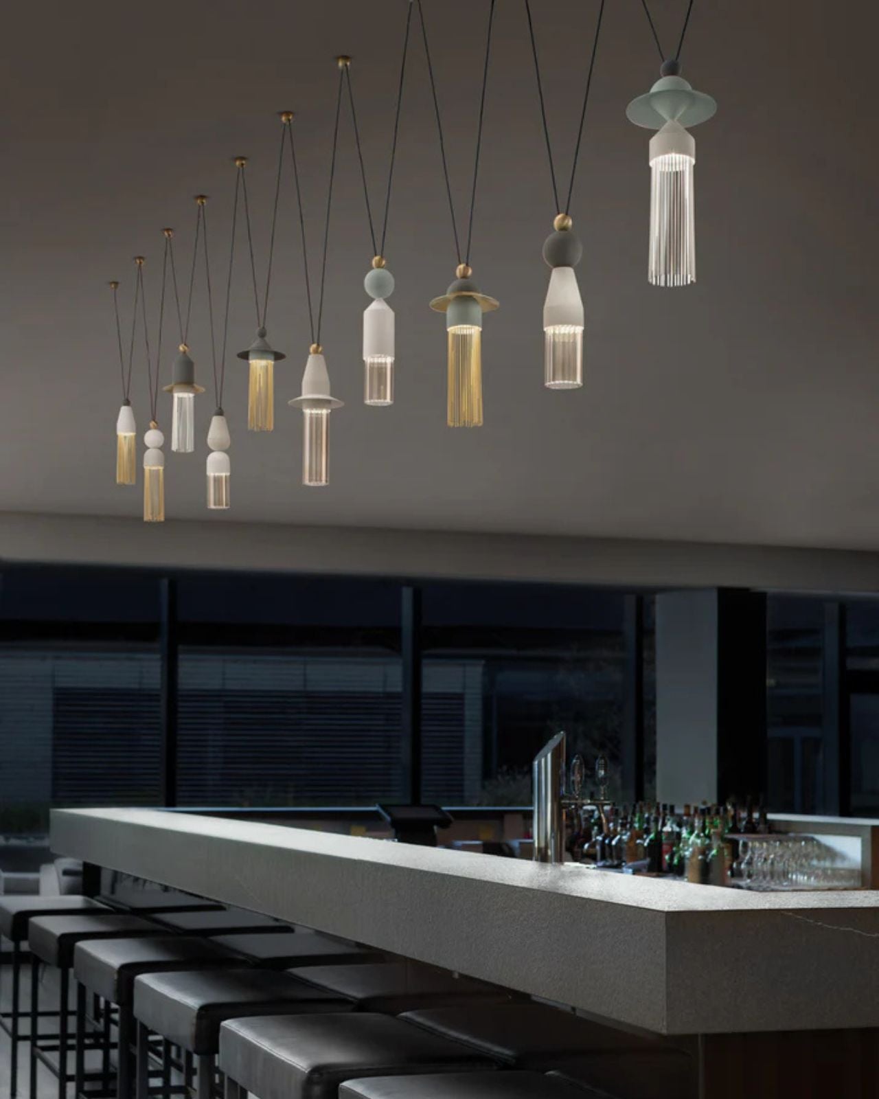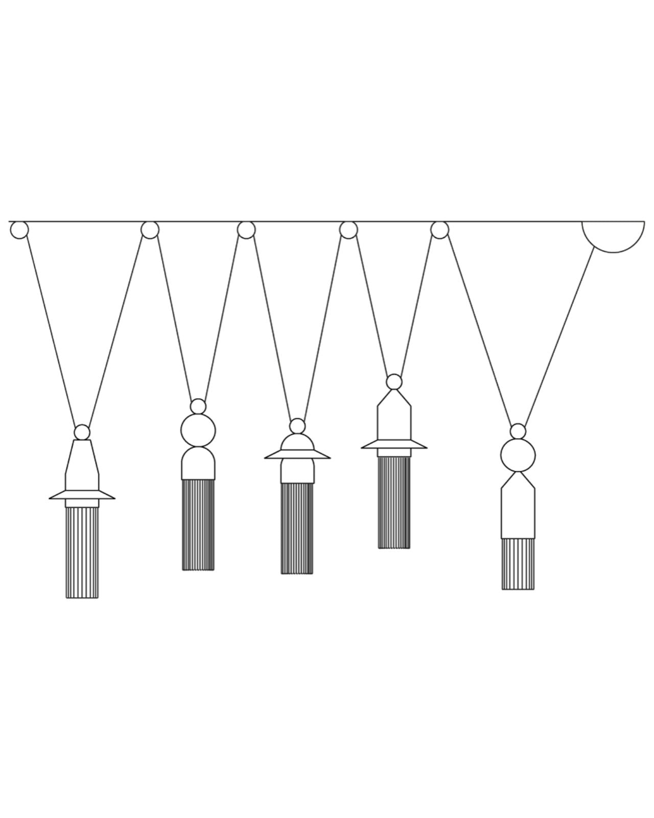 The pendant is available in an all-white finish, all-black and a cool and warm mixed-coloured finish, for a more retro-looking style, and can be arranged in two different arrangements, linear and pentagonal.