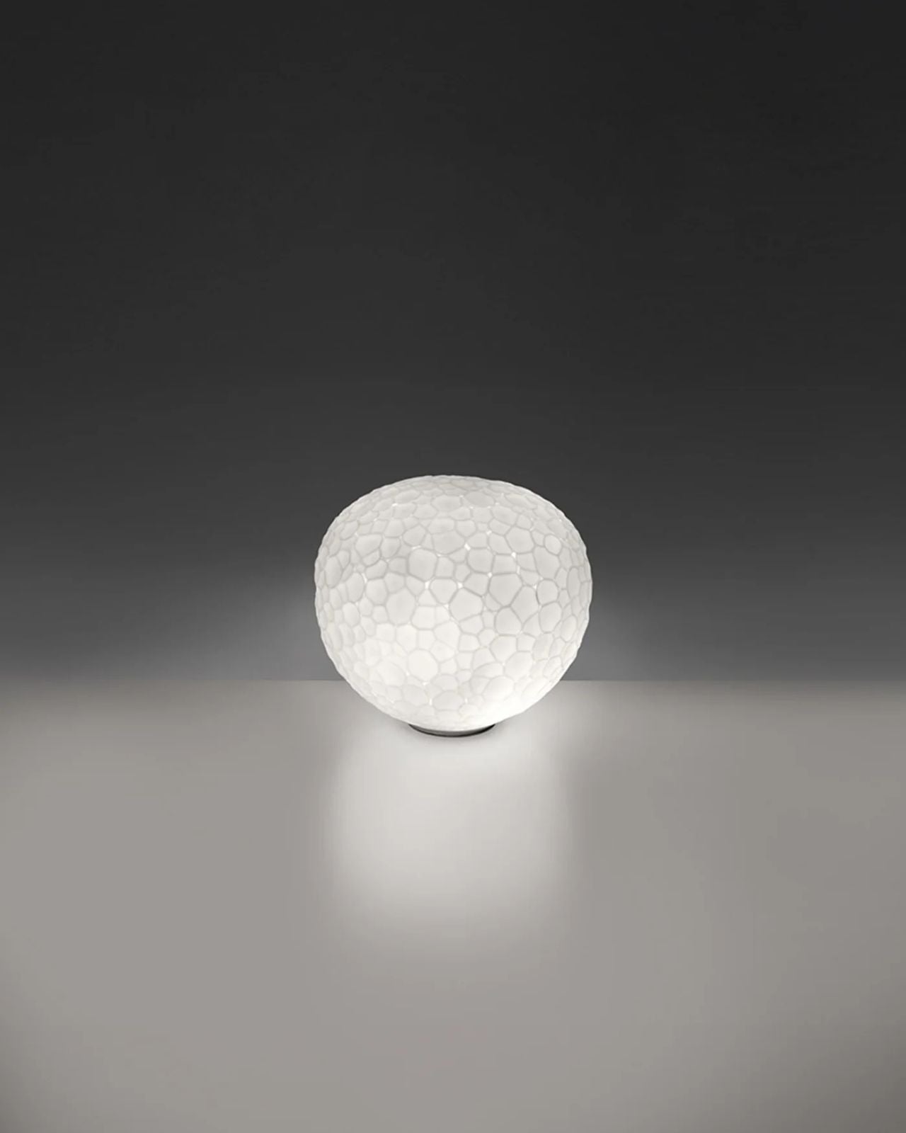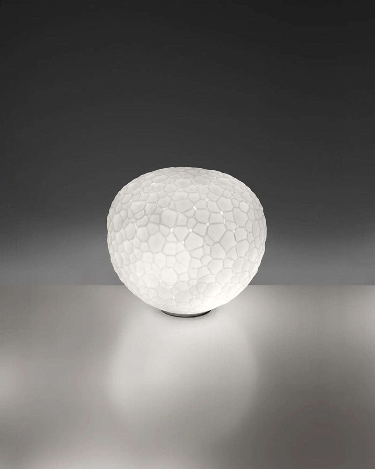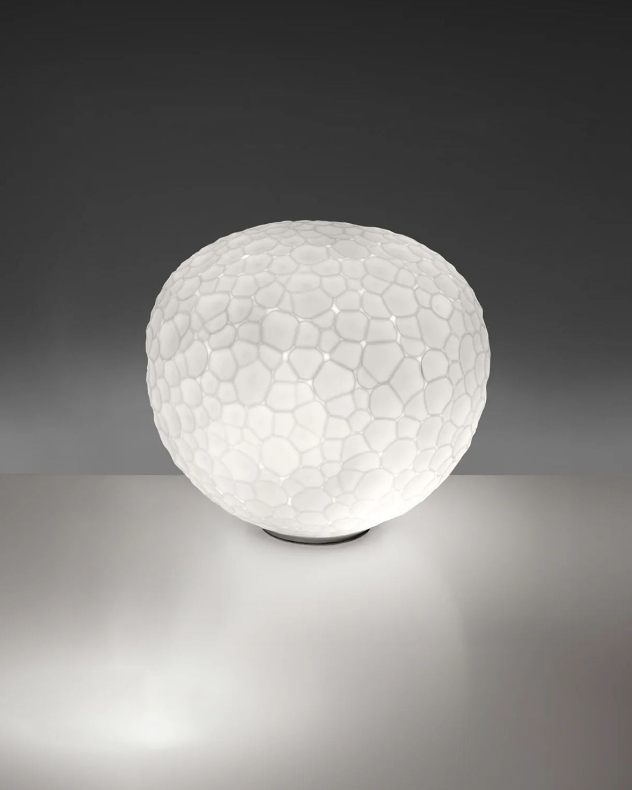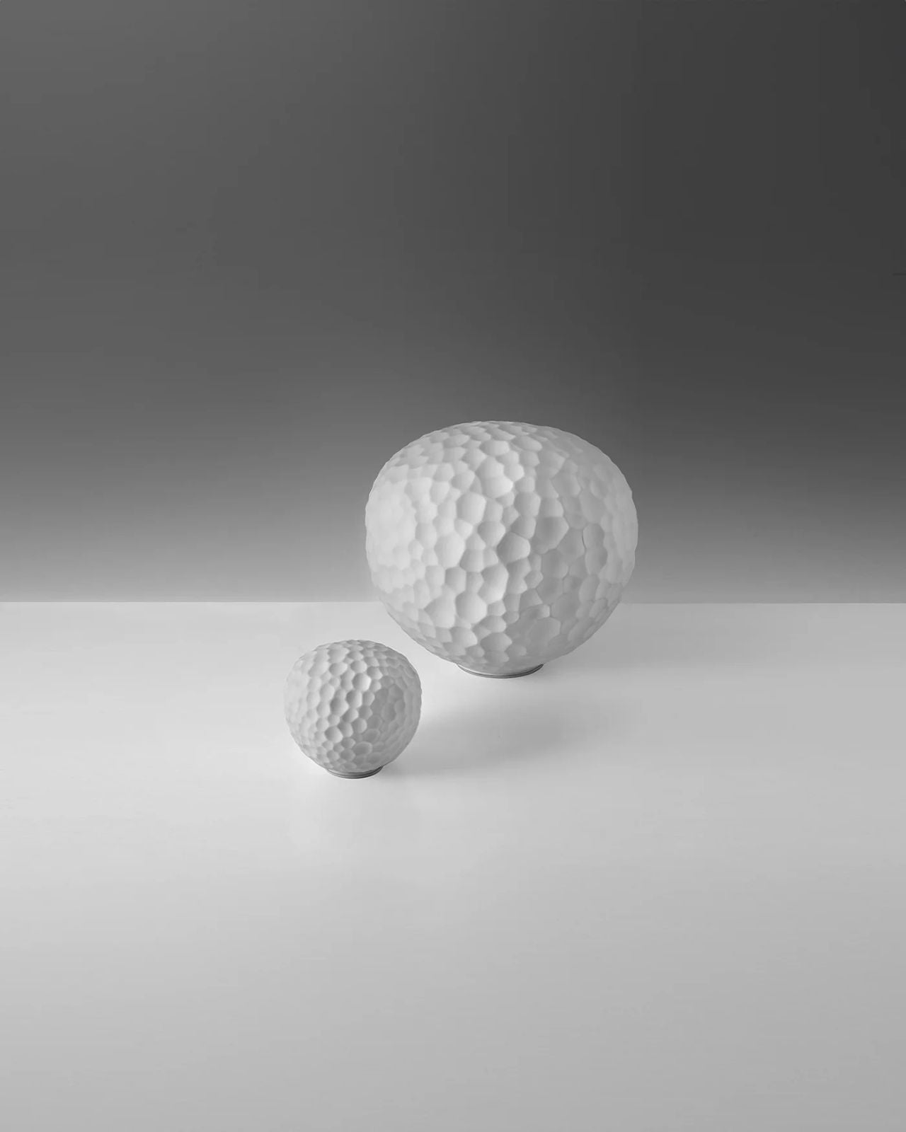 The Battuto Glass Table Lamp features a spherical diffuser crafted from double-layered artistic glass, handmade using a traditional mould-blowing technique and finished with meticulous grinding. Its surface draws on the Murano art of battuto glass, creating a textured, beaten pattern that gently disperses the light. When lit, the orb radiates a soft, organic glow, reminiscent of natural stone or cellular forms, making it both a functional lamp and a sculptural statement piece. Ideal for a range of interiors, specifically minimalist, contemporary, organic, and Scandinavian spaces.