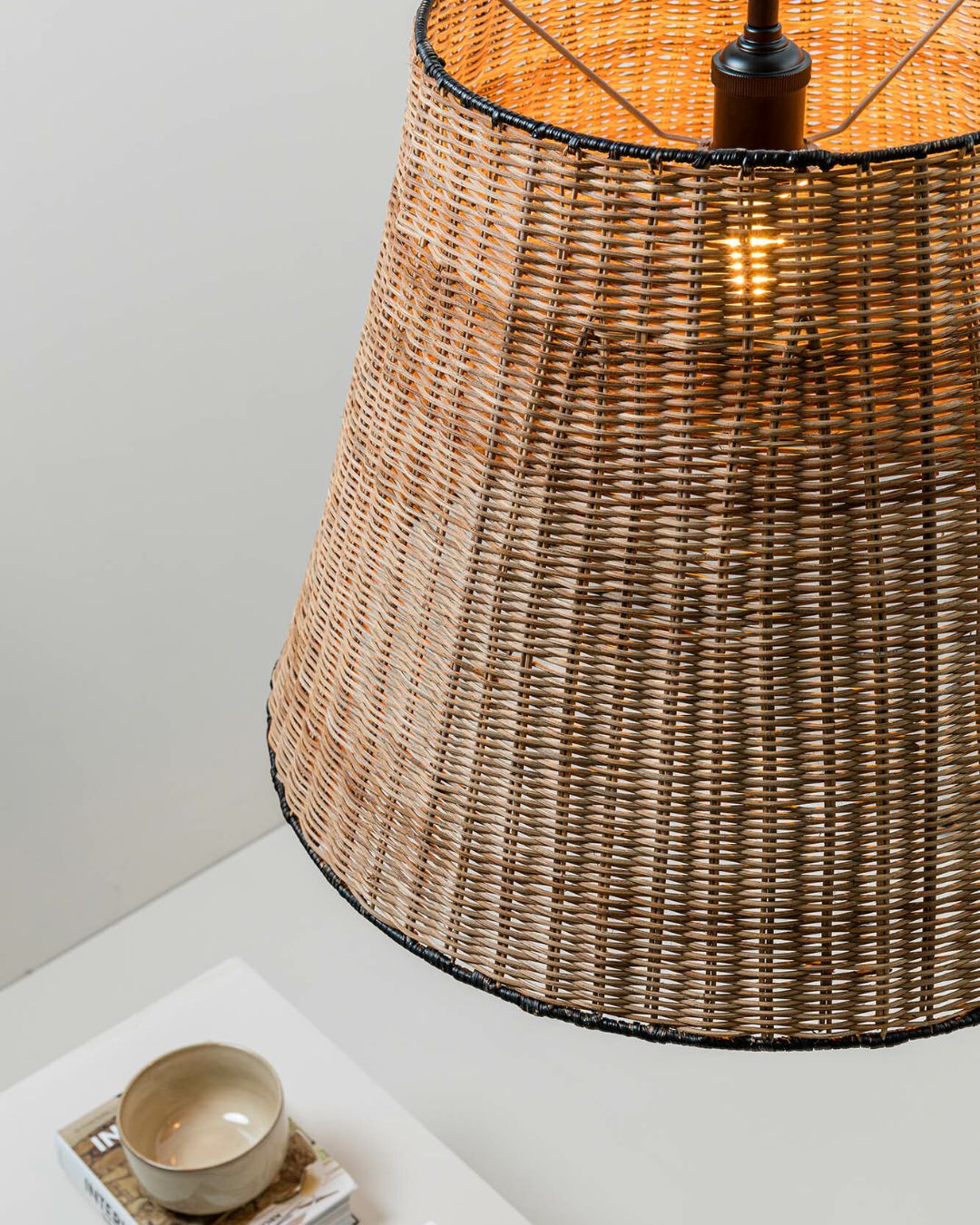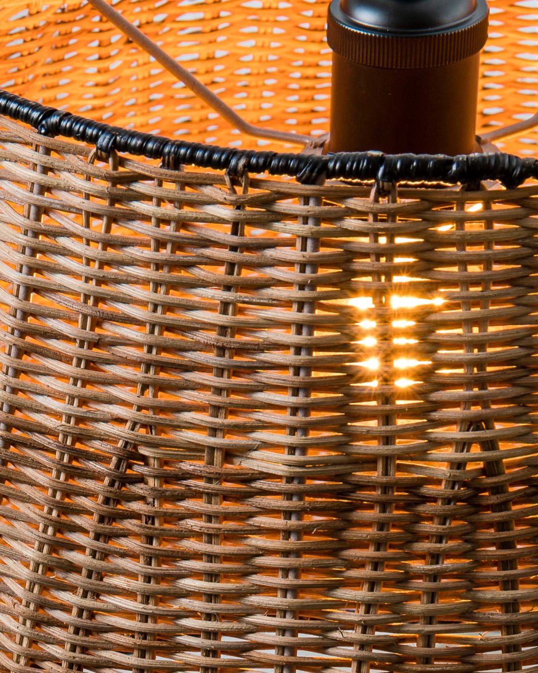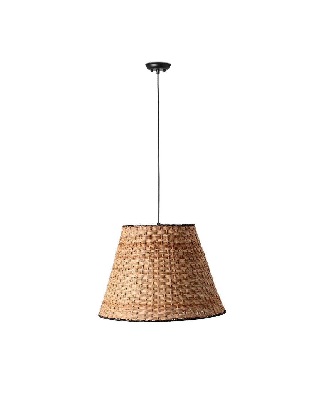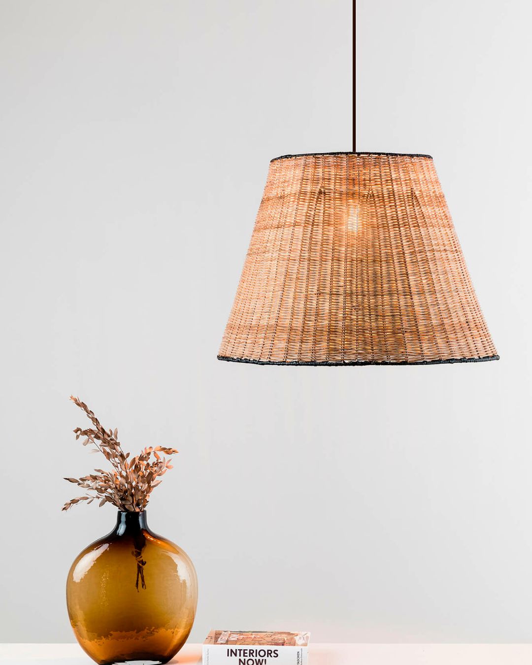 Handmade in Spain, this pendant light features a wide shade made from rattan and will suit a range of interior-styled spaces. The natural fibres combined with subtle elegant black detailing will provide a coastal touch suited for suspension over a dining table or in a modern living room. To be paired with an E27 (not included).