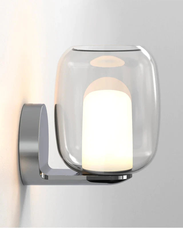 Featuring a gentle convex blown glass and a zinc modern arm with polished chrome or matte black or polished chrome finish, this elegant wall light will throw a bright and even light over its surroundings. IP44-rated, this light is splash proof making it ideal for placement beside the bathroom mirrors to create pleasant ambient lighting. It can be mounted upwards or downwards to suit any interior need.