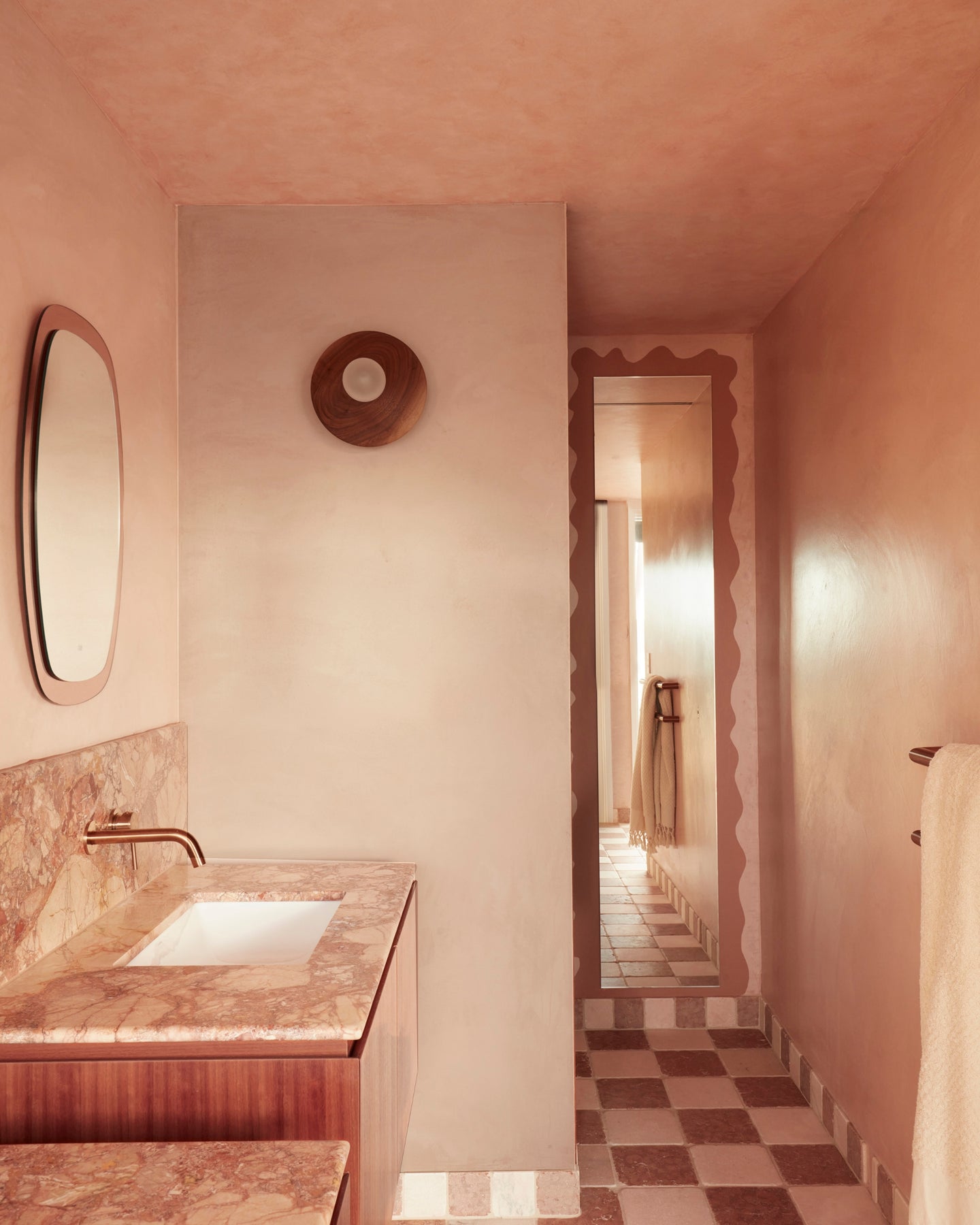 Bathroom corner with a mirror, faucet, and sink against a pink wall and a wooden wall sconce