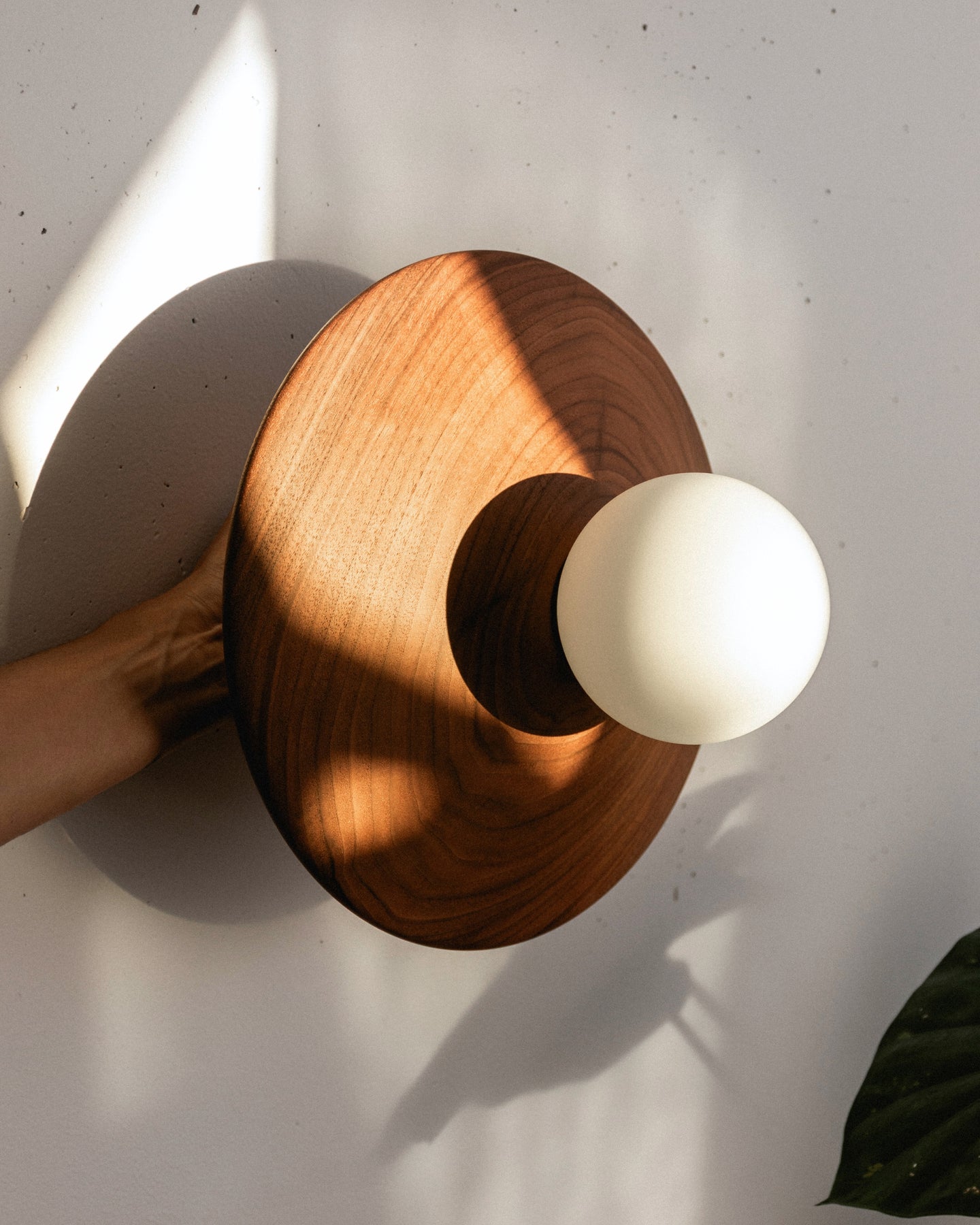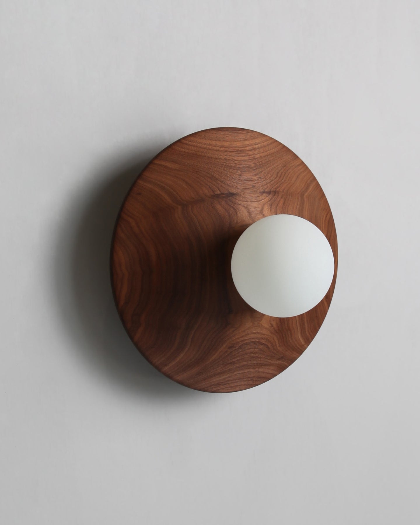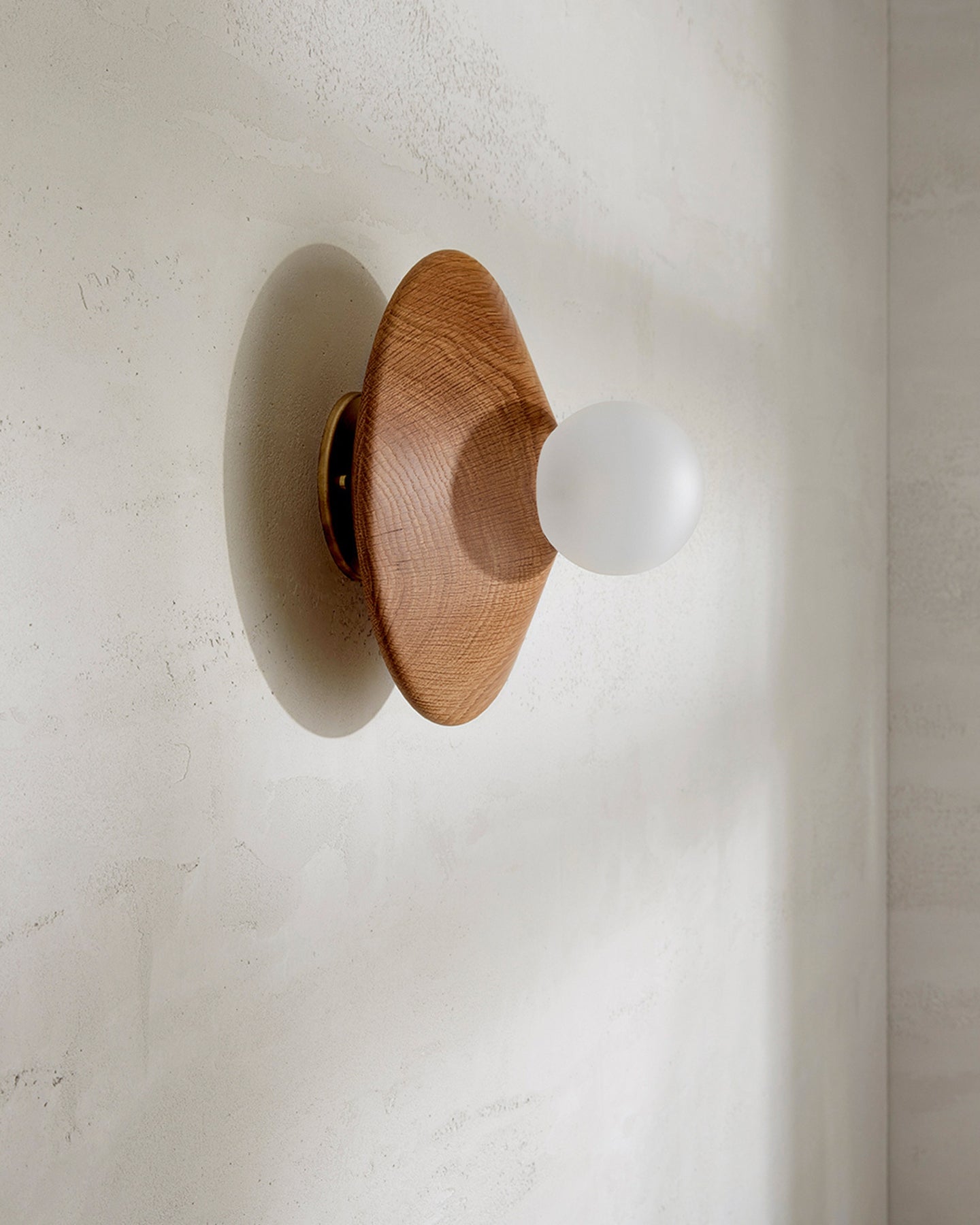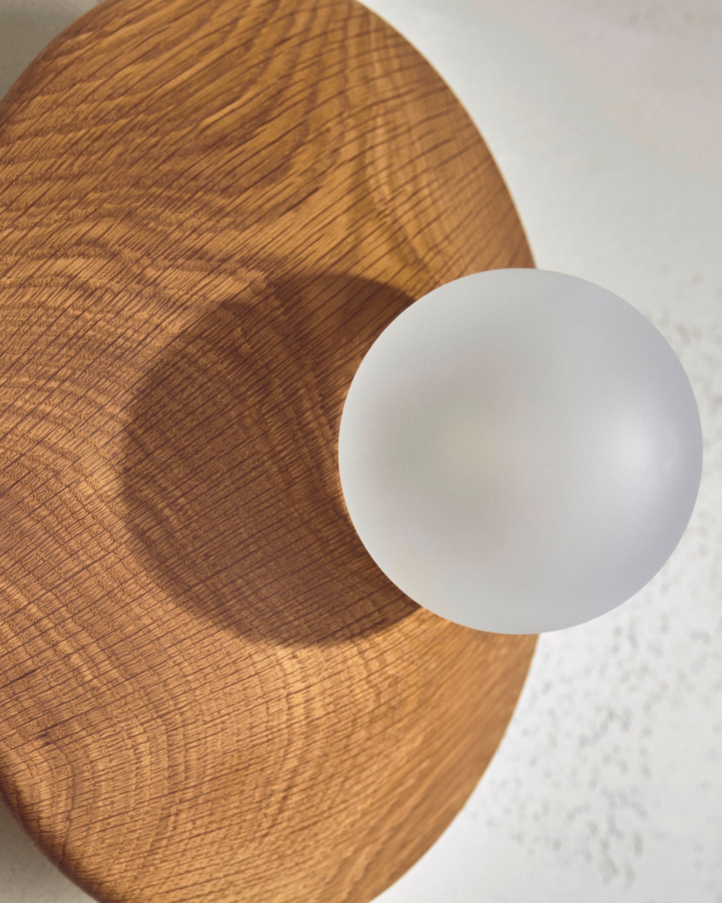Introducing the wall-mounted disc complimented by a brushed nickel, brass, satin white or matte black backplate, a stunning addition to the Bright Beads collection. These lights are crafted by hand from FSC-approved walnut and oak, showcasing their unique textural qualities as a sculptural element.