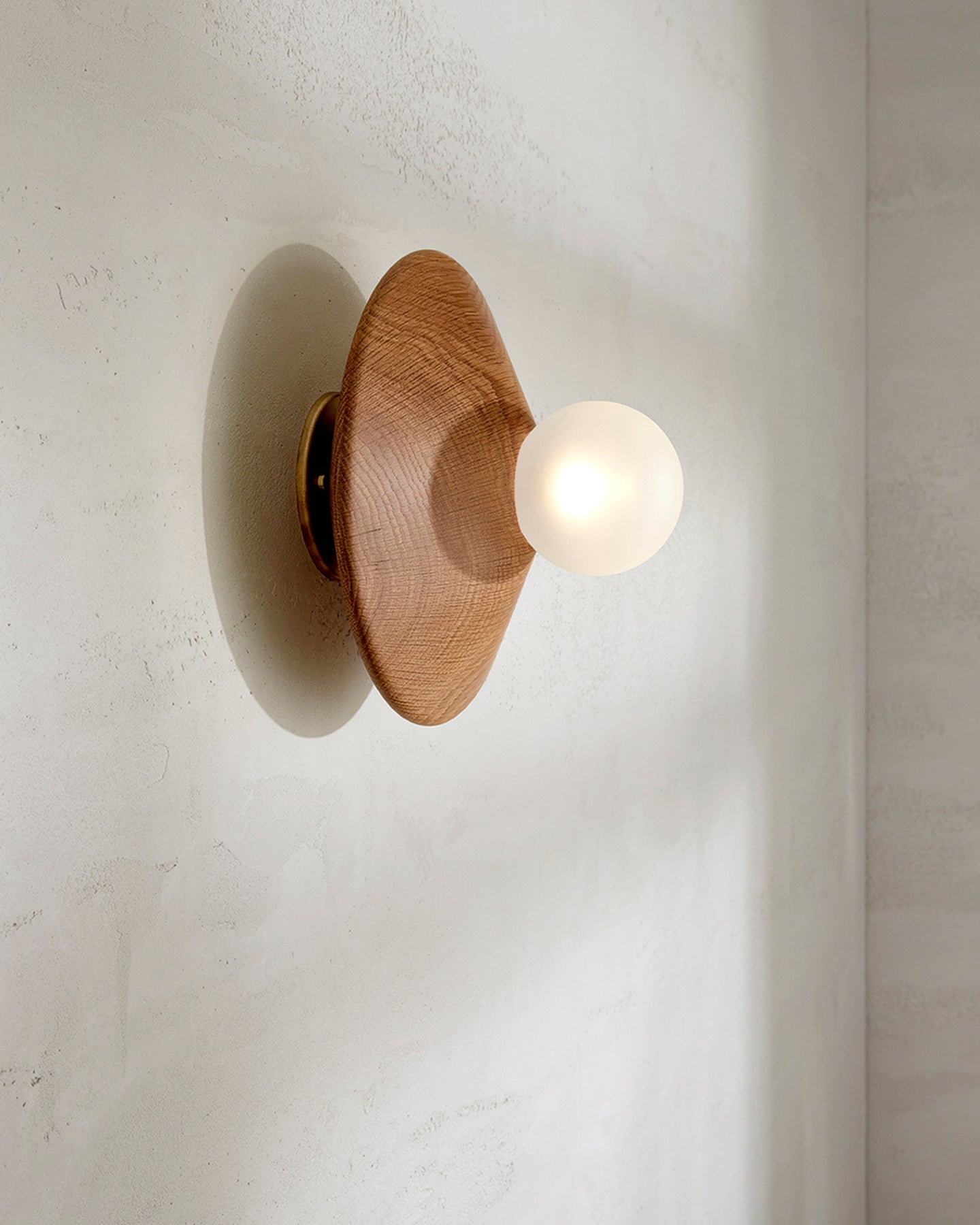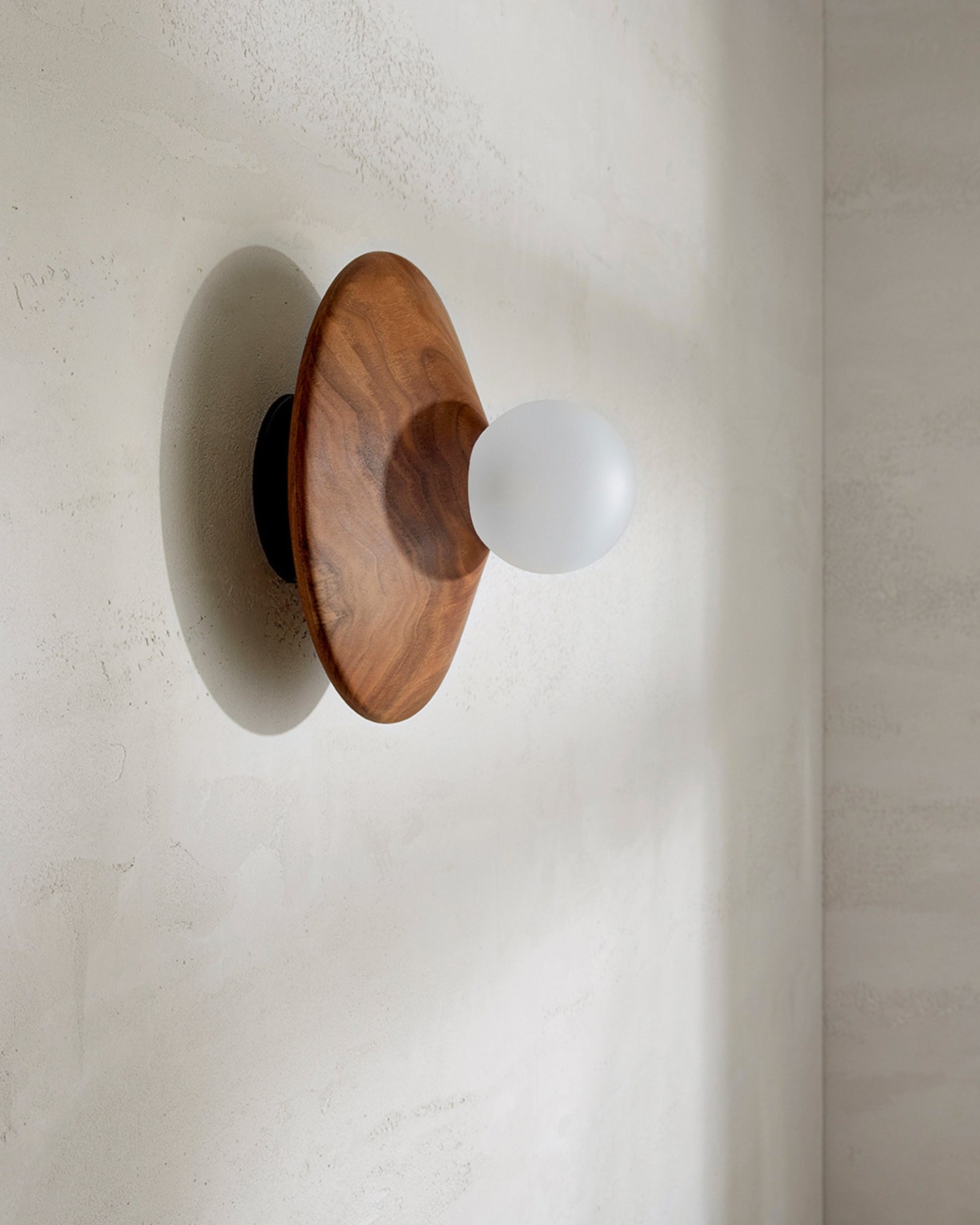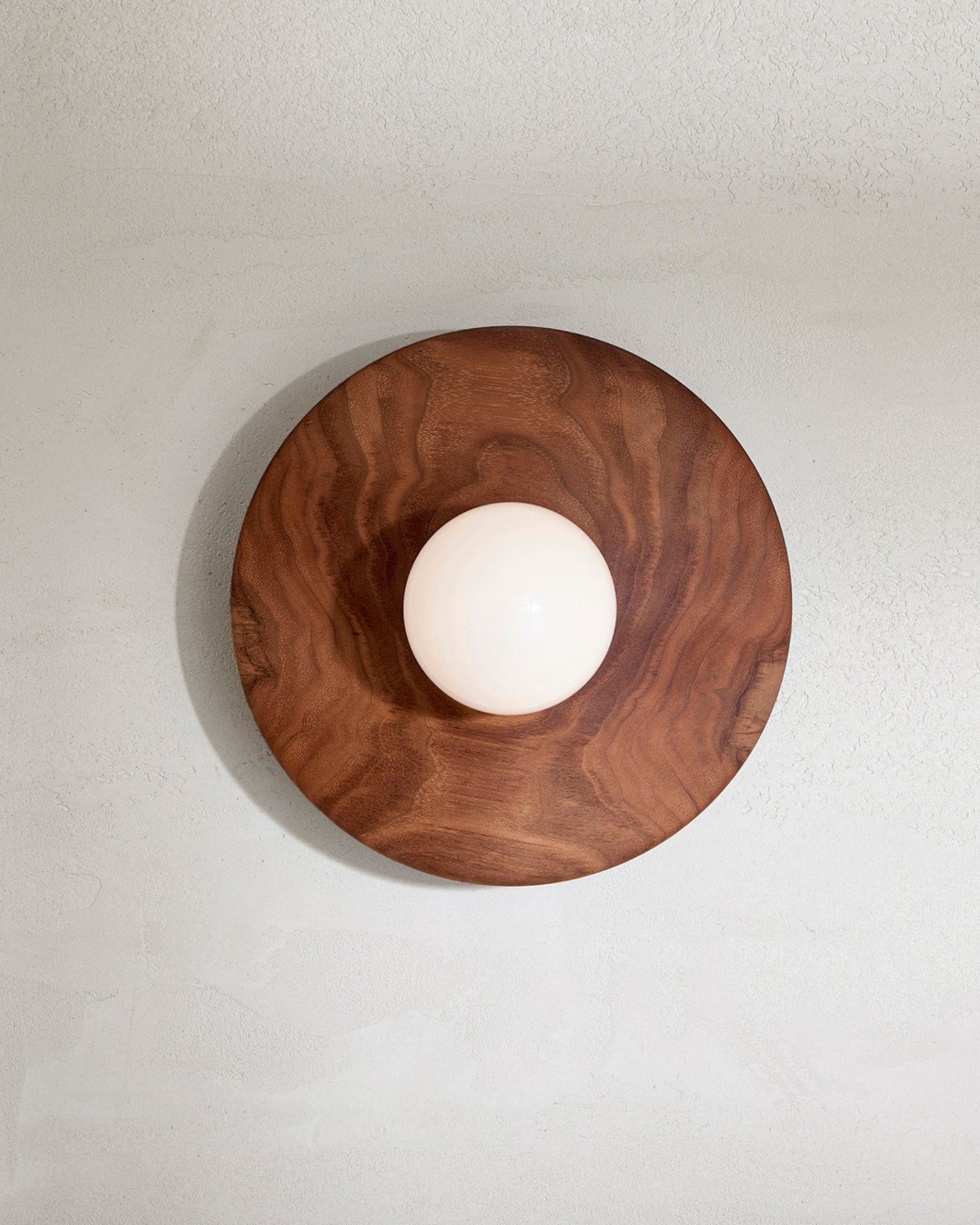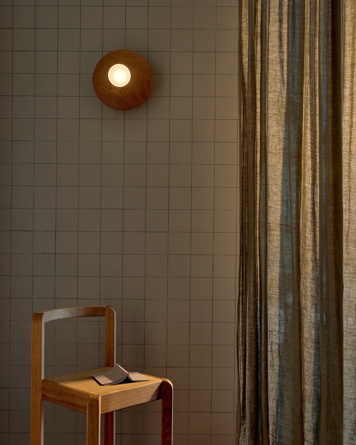Introducing the wall-mounted disc complimented by a brushed nickel, brass, satin white or matte black backplate, a stunning addition to the Bright Beads collection. These lights are crafted by hand from FSC-approved walnut and oak, showcasing their unique textural qualities as a sculptural element.